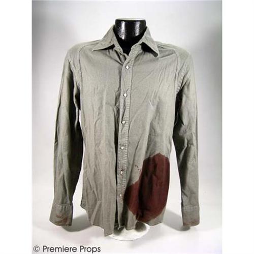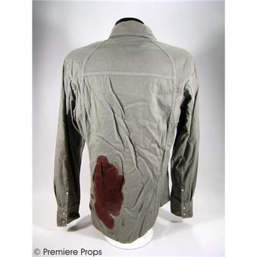THE LOOKOUT - Proof that crime does not pay, here we have Gary's (MATTHEW GOODE) grey "Kenneth Cole" L/S snap up shirt (*shirt has "bullet entry" holes in lower left front and back, back hole is approx. 3" verticle tear. Also has large stage blood stains throughout) (size M). (LOK1045)