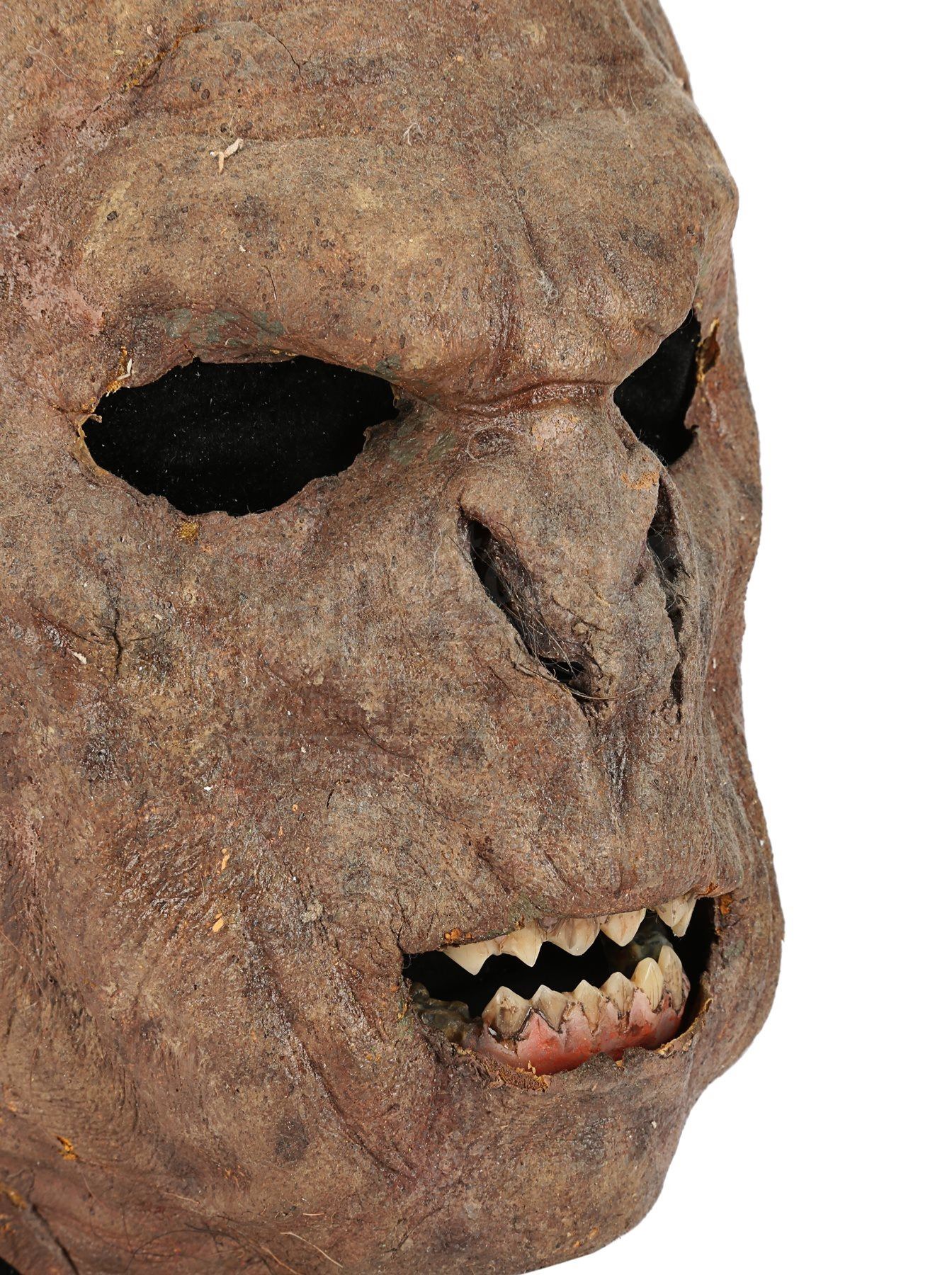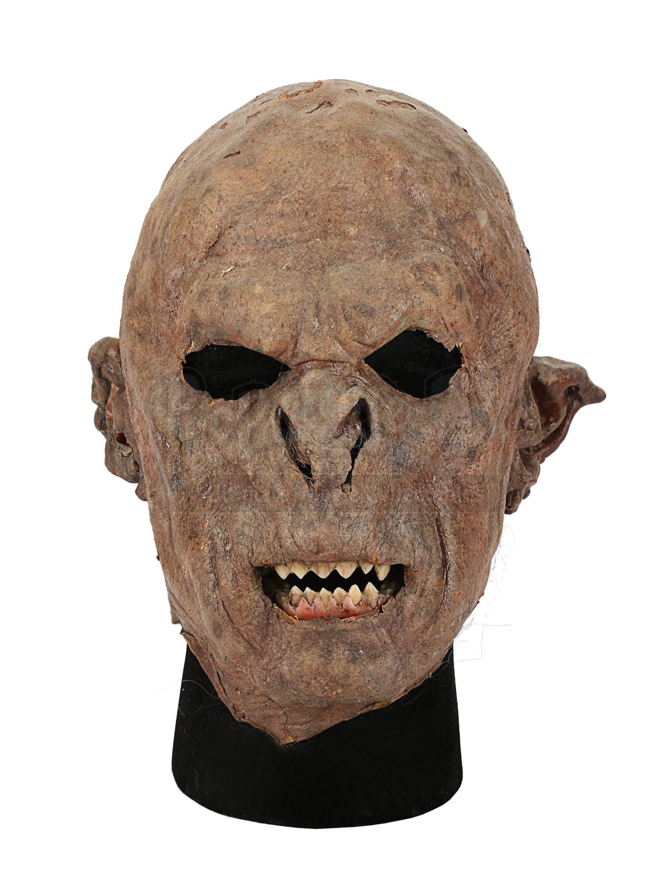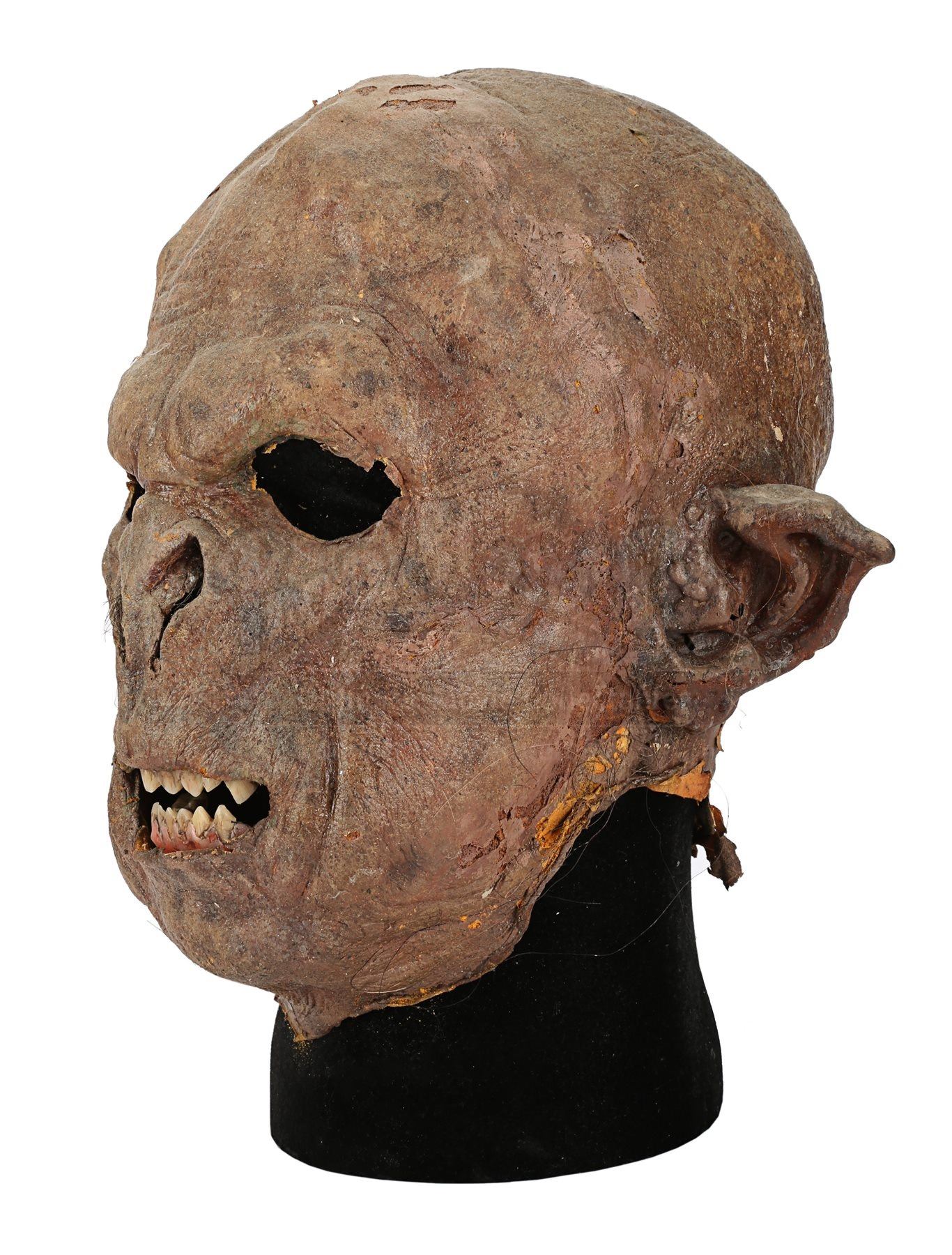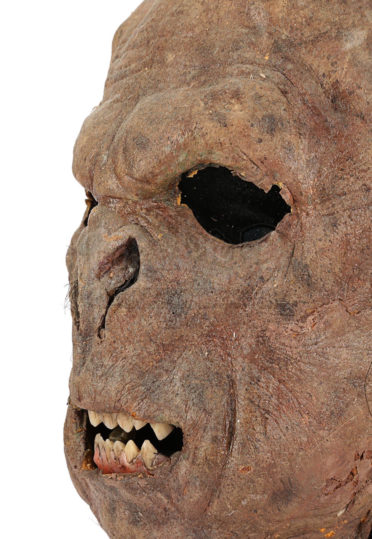 The mask was created by the artists at Weta Workshop in New Zealand, who under the direction of Richard Taylor and Peter King won an Oscar® for Best Make-up on Return of the King. The mask is constructed from latex and is painted with mottled shades of brown, with holes cut out for the eyes, nostrils and mouth, and smaller holes in the ears. A small amount of artificial hair is still present. A set of pointed acrylic teeth complete the set.
