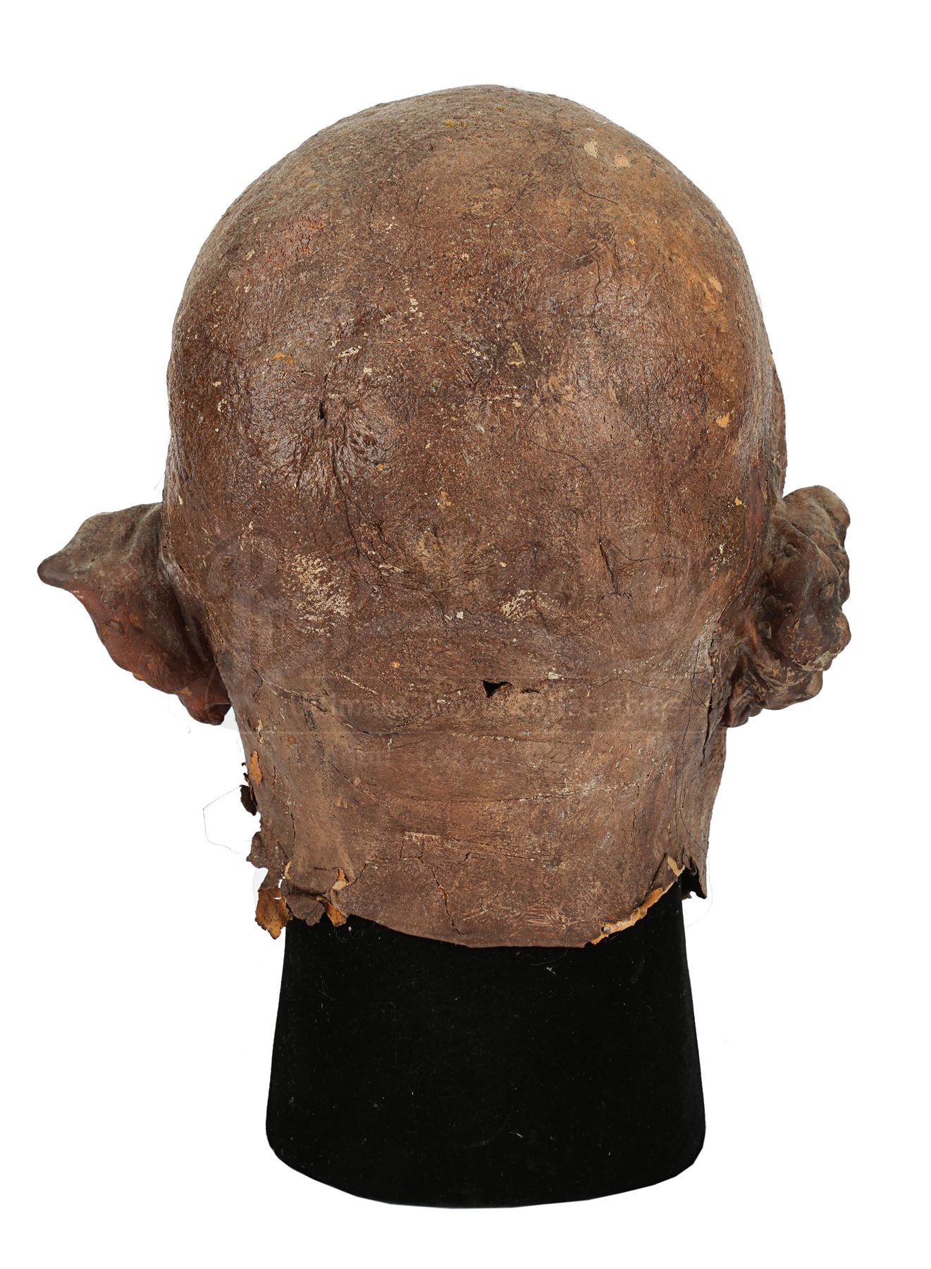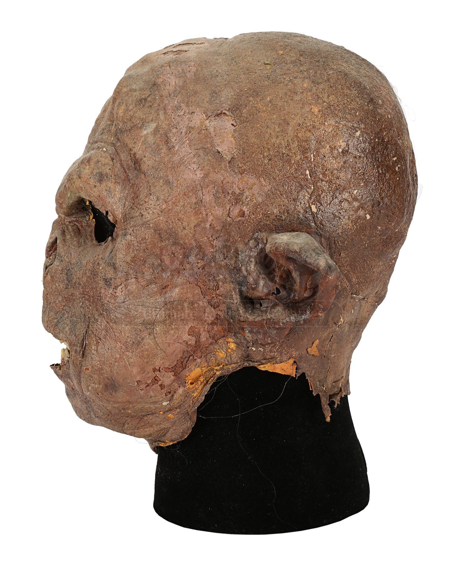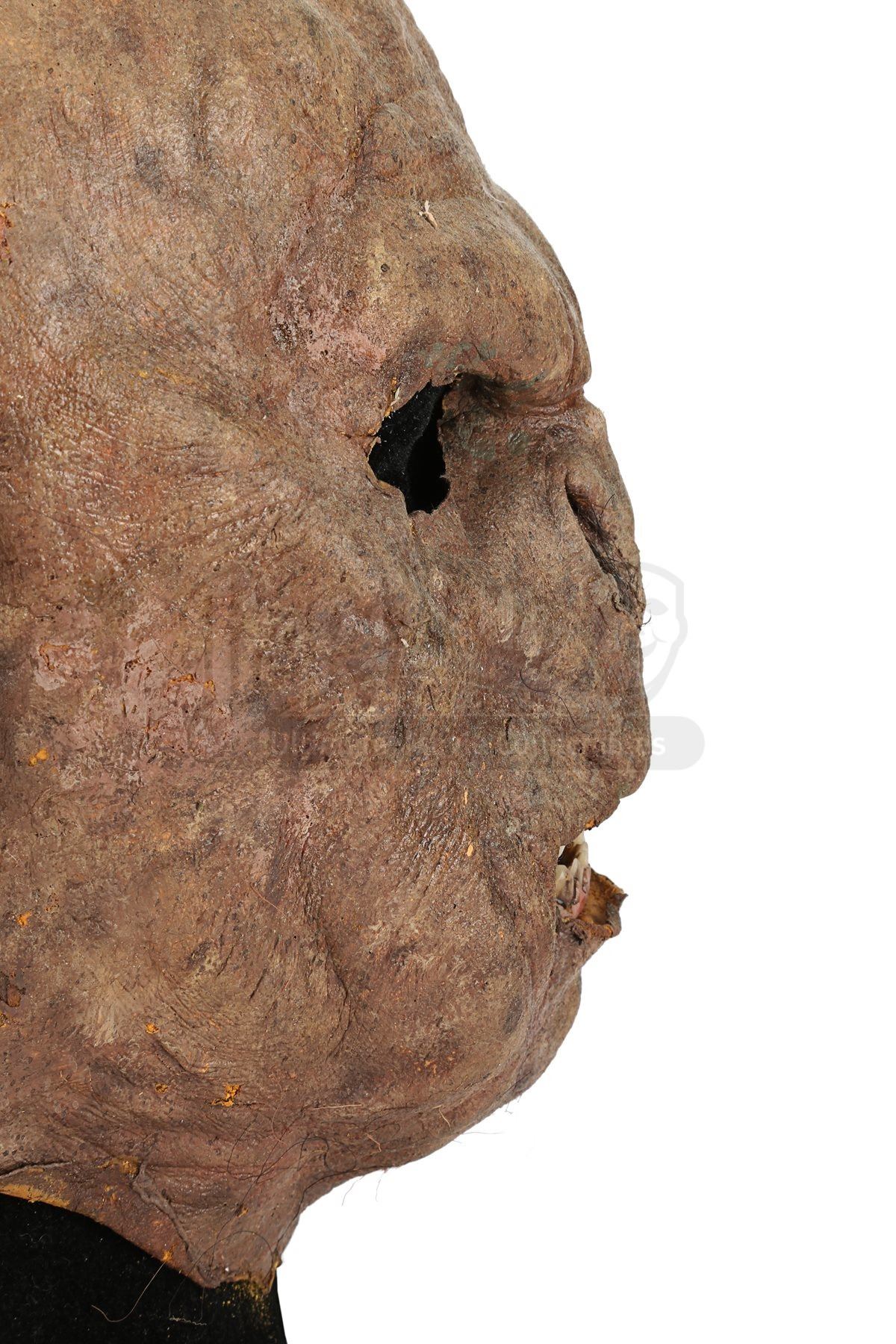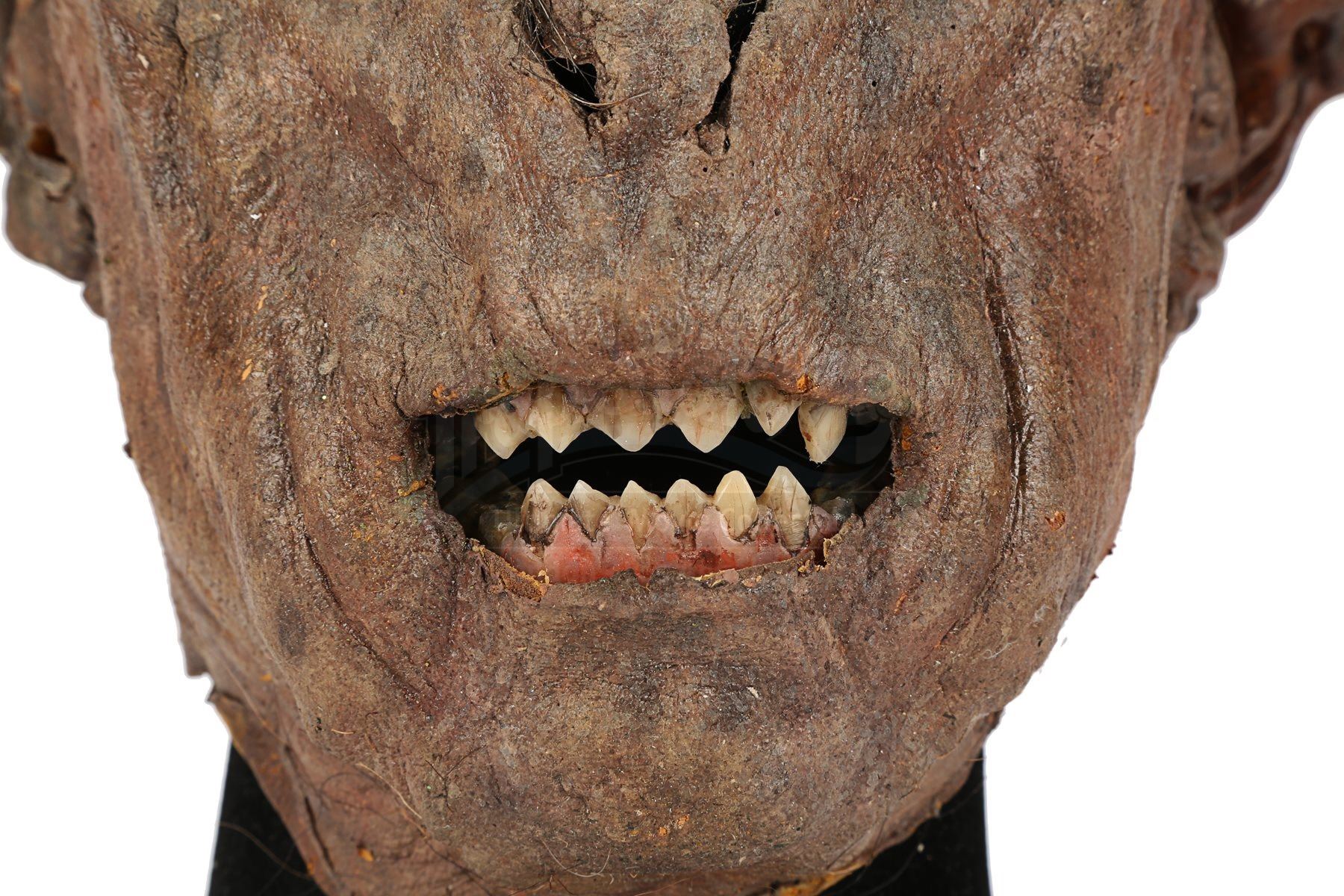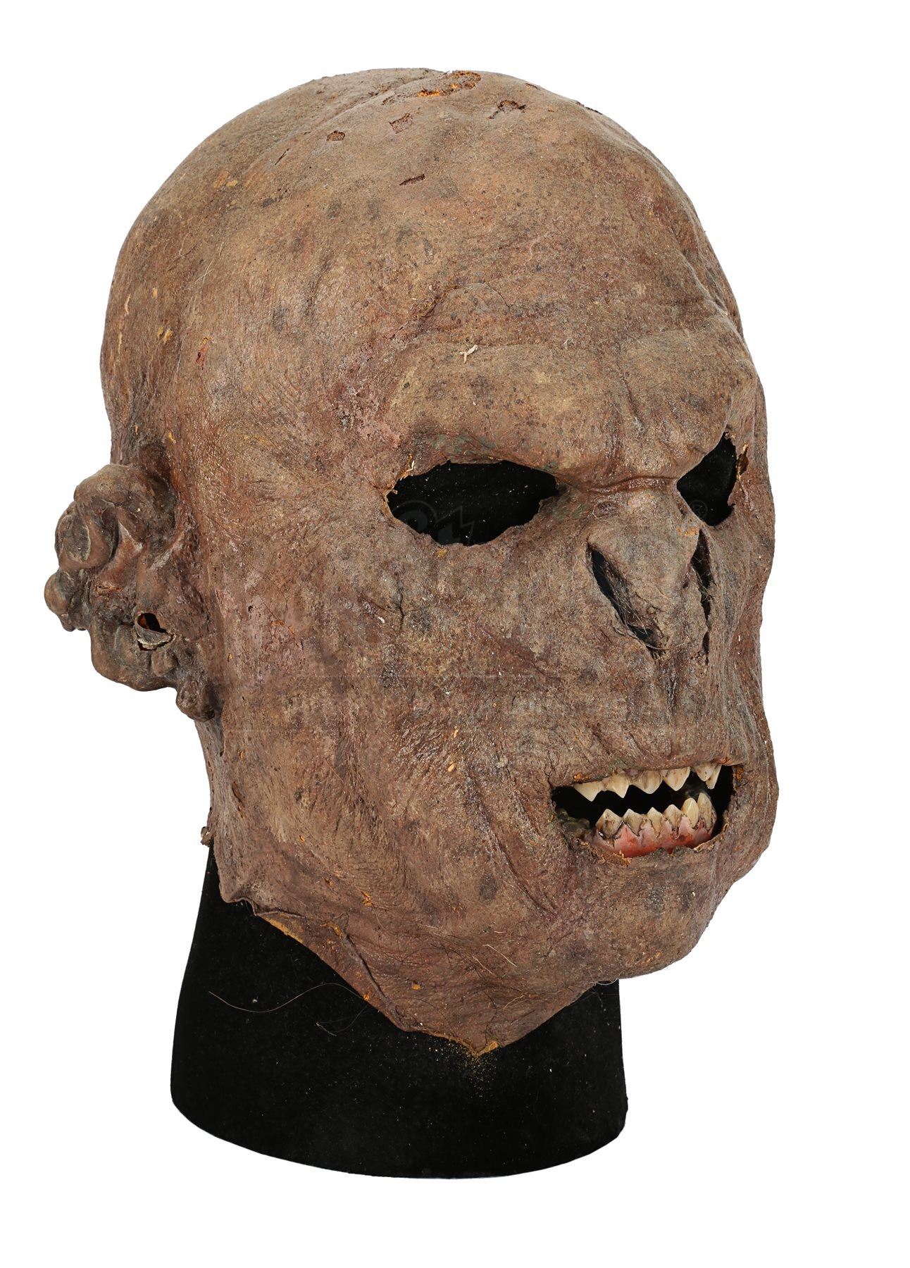 The mask was created by the artists at Weta Workshop in New Zealand, who under the direction of Richard Taylor and Peter King won an Oscar® for Best Make-up on Return of the King. The mask is constructed from latex and is painted with mottled shades of brown, with holes cut out for the eyes, nostrils and mouth, and smaller holes in the ears. A small amount of artificial hair is still present. A set of pointed acrylic teeth complete the set.
