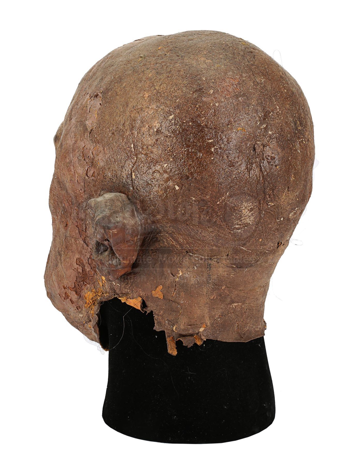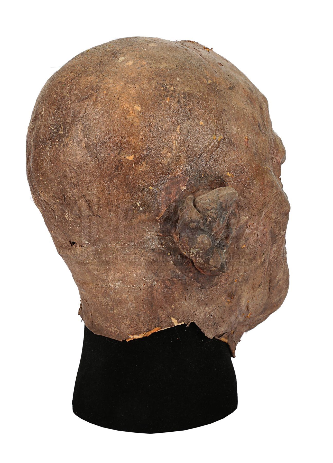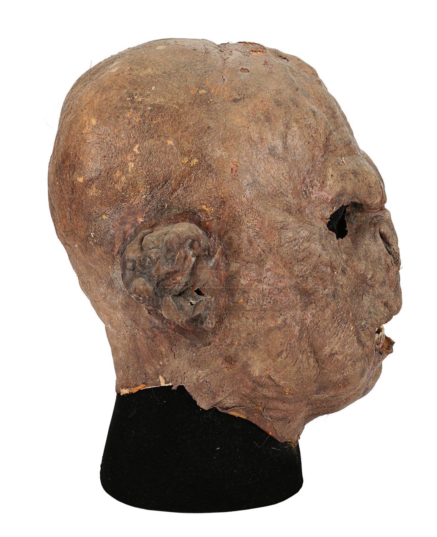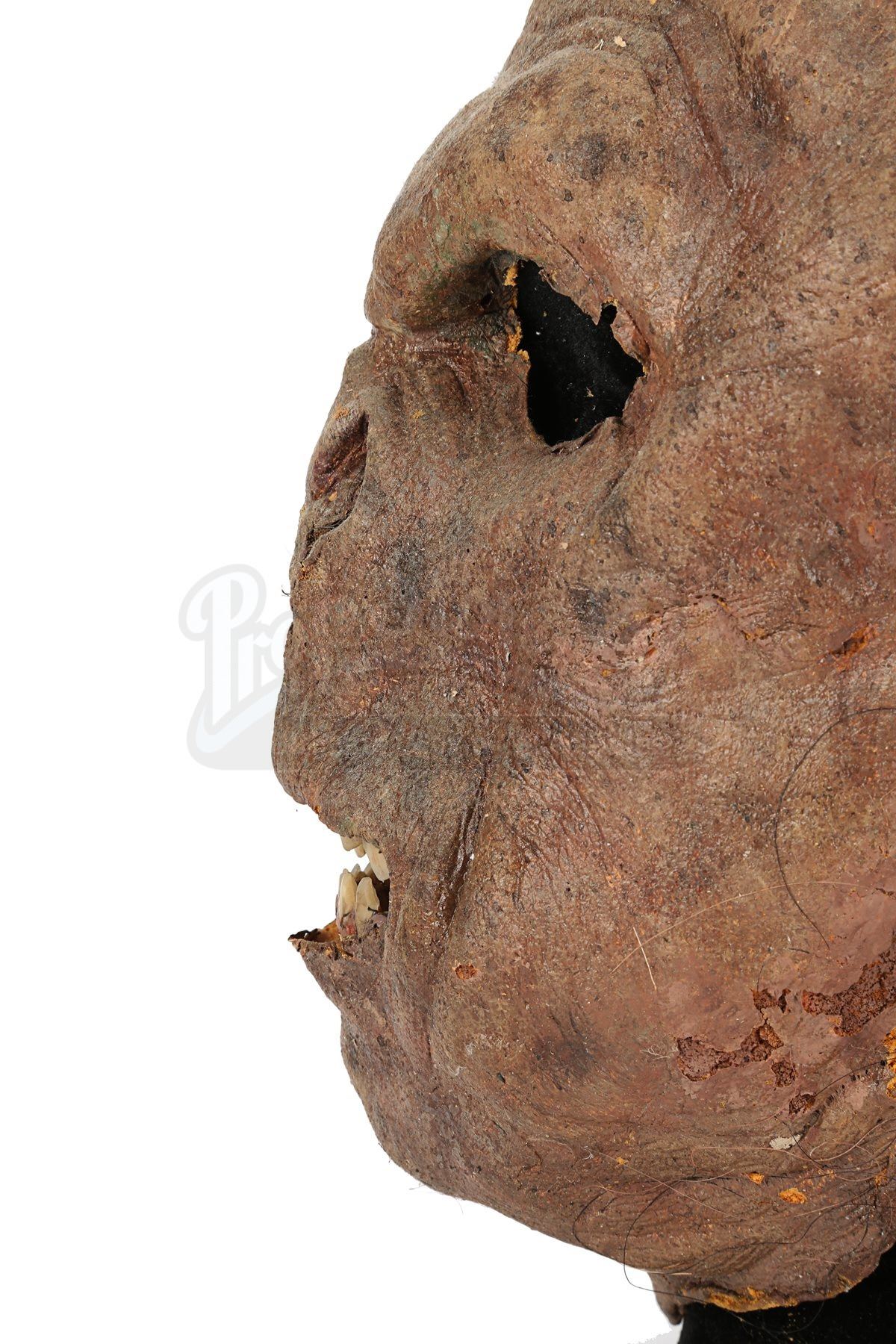 The mask was created by the artists at Weta Workshop in New Zealand, who under the direction of Richard Taylor and Peter King won an Oscar® for Best Make-up on Return of the King. The mask is constructed from latex and is painted with mottled shades of brown, with holes cut out for the eyes, nostrils and mouth, and smaller holes in the ears. A small amount of artificial hair is still present. A set of pointed acrylic teeth complete the set.