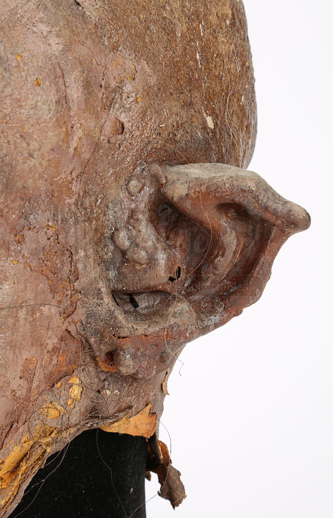 Presented on a black flocked head for support, the edges of the mask have begun to dry with age, and some light restoration has been carried out around the hairline and the back of the neck. Dimensions (displayed): 23 cm x 24 cm x 22 cm (9” x 9 ½” x 8 ¾”)