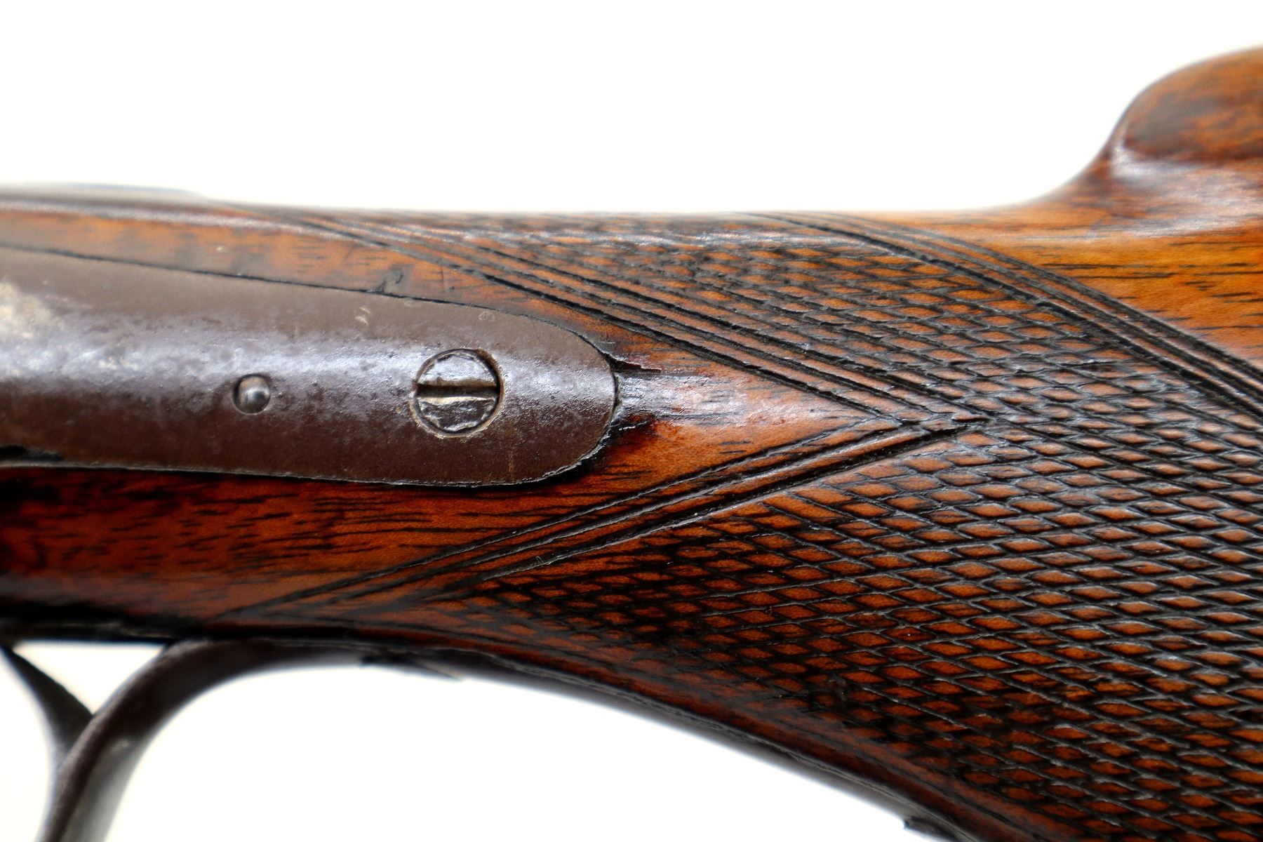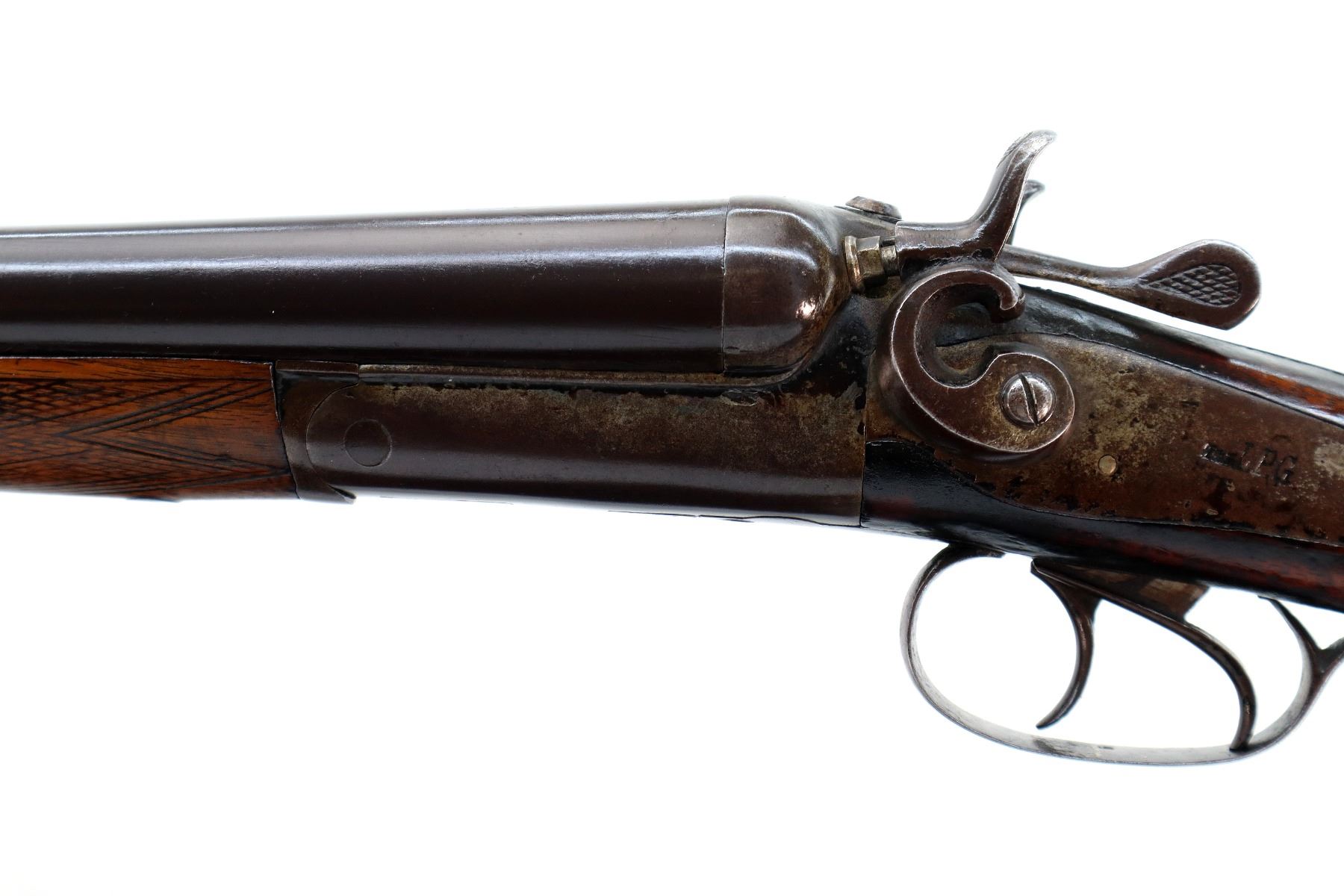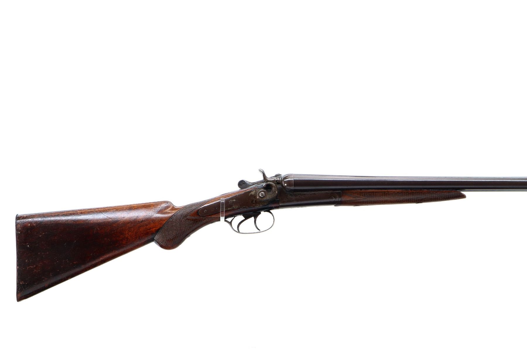 Main Description: Brass bead, Government Twist barrels with smooth rib, small dents and are loose on face, back action locks with checkered spur hammers that function which are also loose. Extractor, double triggers. Two piece wood stocks, checkered forearm which is loose, checkered pistol grip, chipped and cracked behind receiver and locks, grooved steel butt plate, stock cracked at toe.