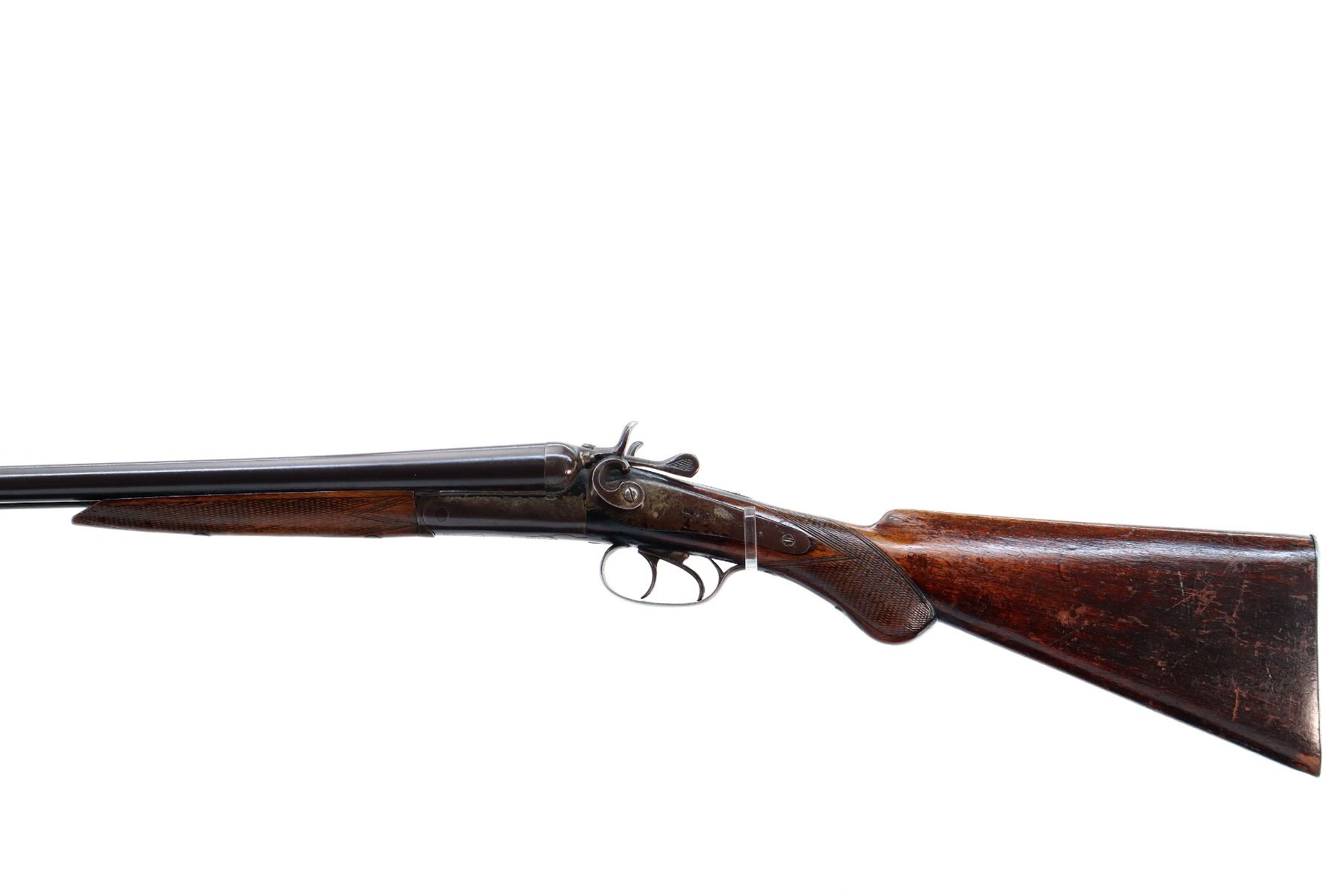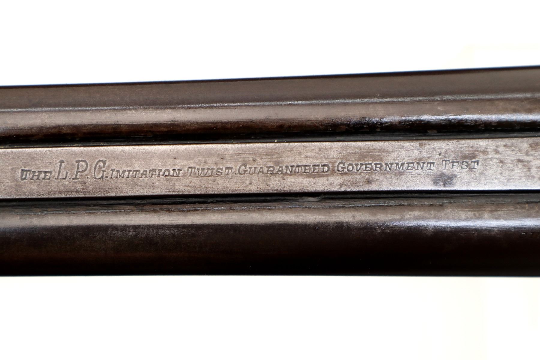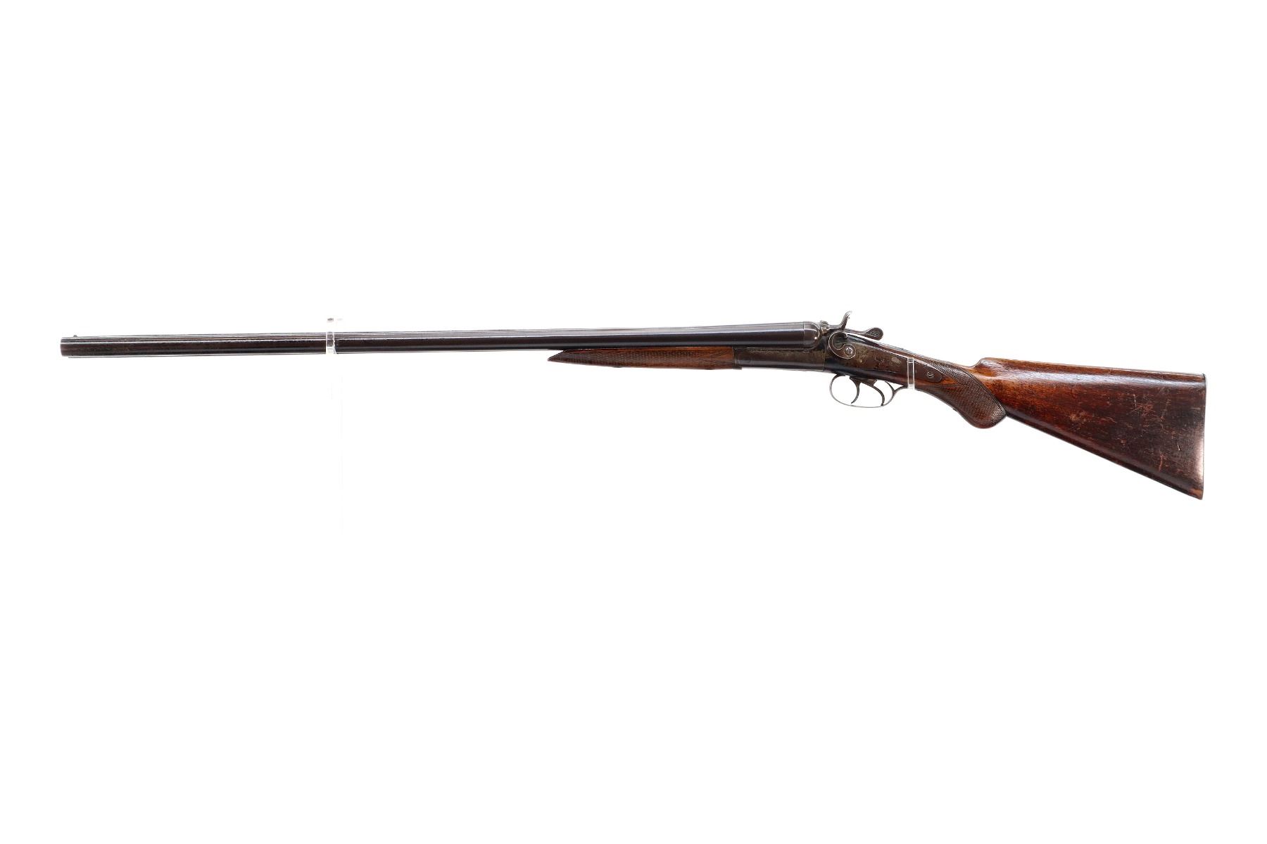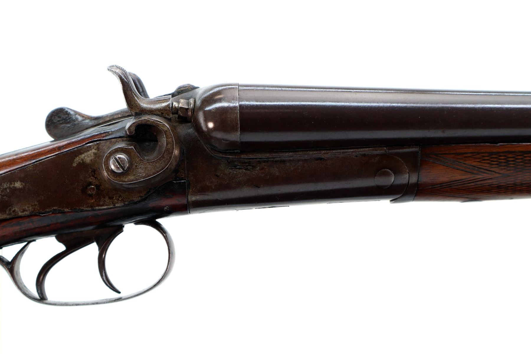 Main Description: Brass bead, Government Twist barrels with smooth rib, small dents and are loose on face, back action locks with checkered spur hammers that function which are also loose. Extractor, double triggers. Two piece wood stocks, checkered forearm which is loose, checkered pistol grip, chipped and cracked behind receiver and locks, grooved steel butt plate, stock cracked at toe.