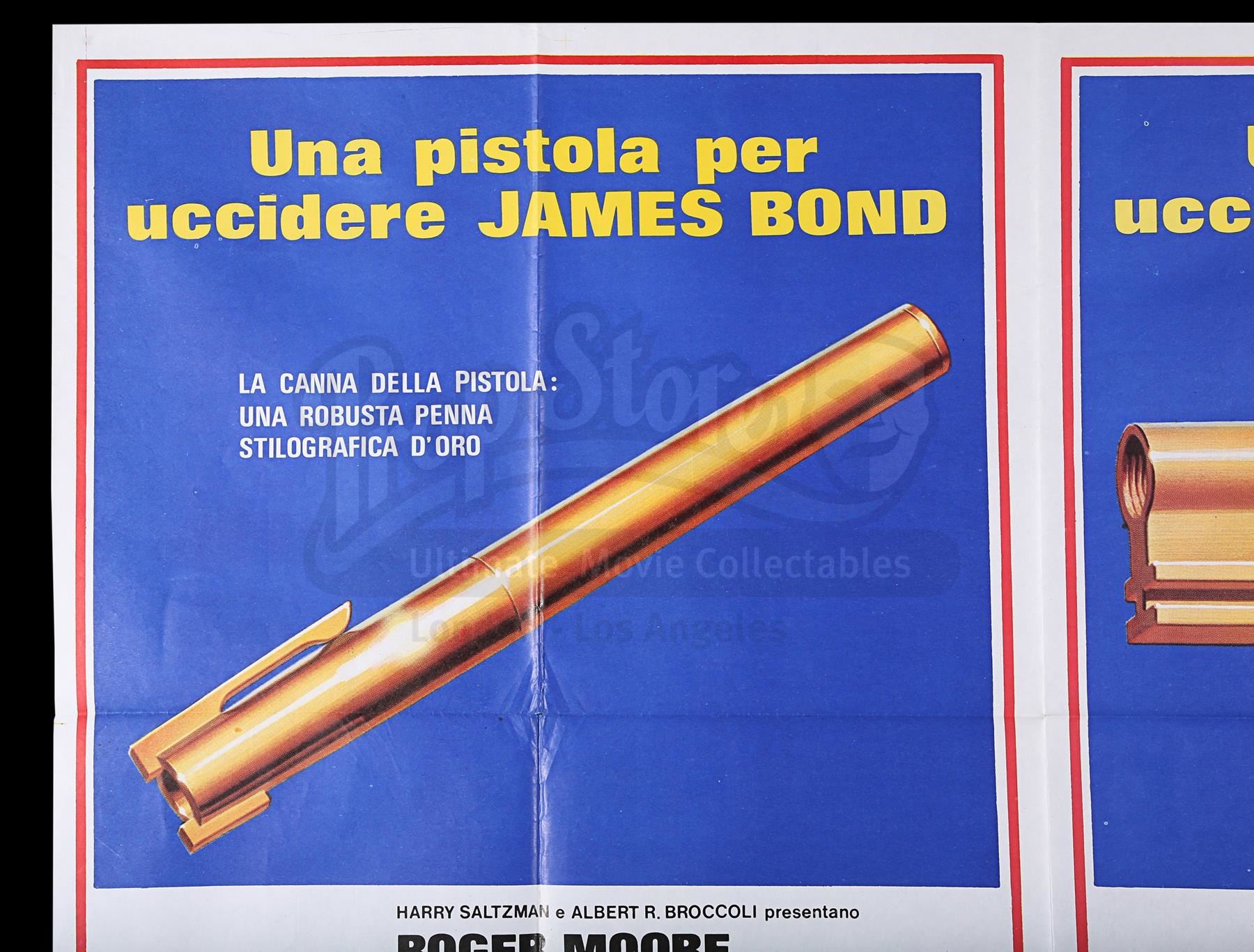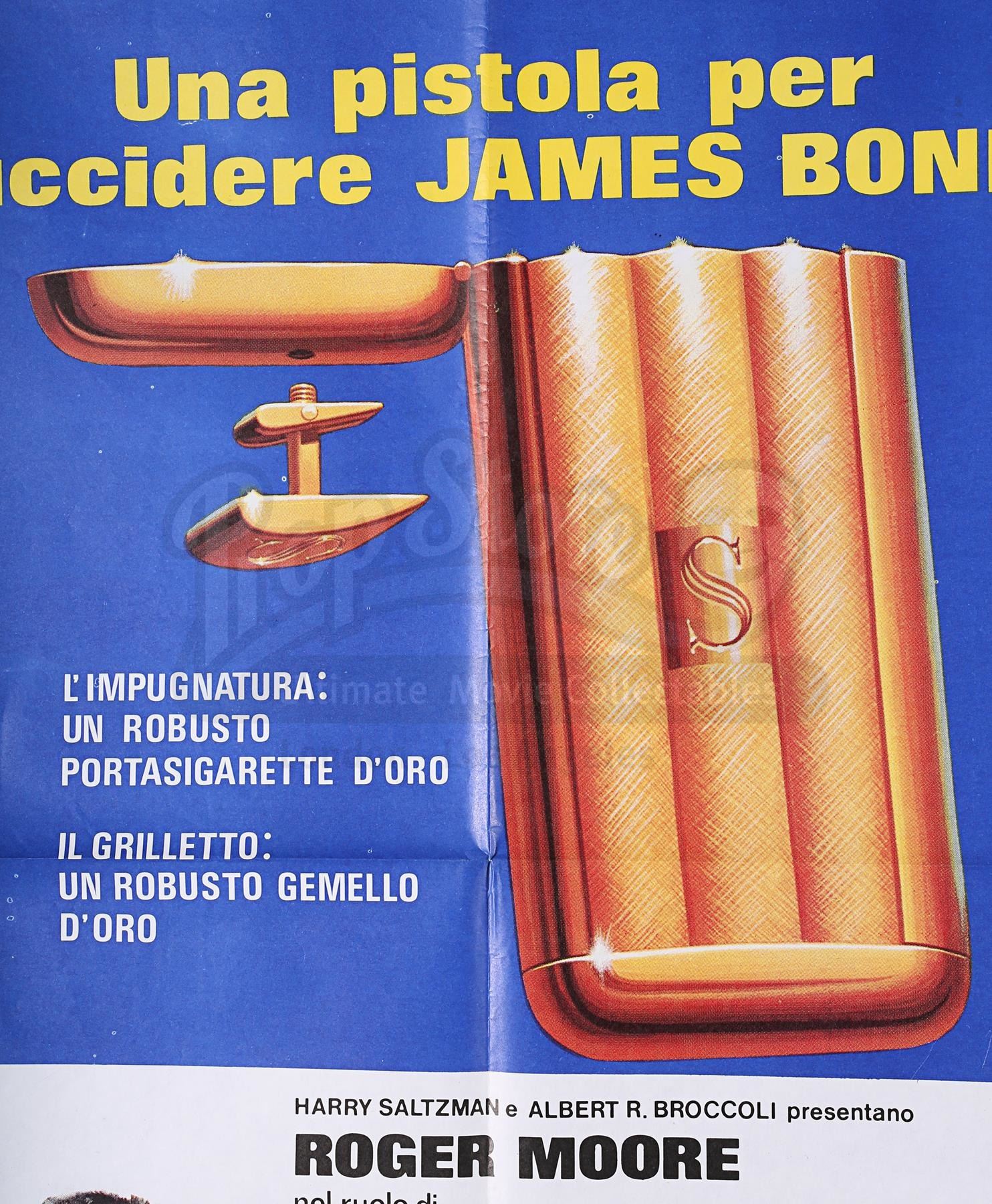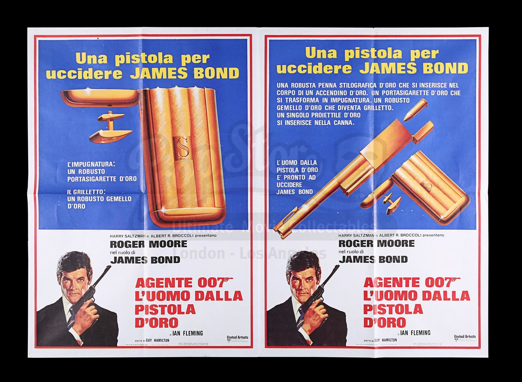 A set of four Italian teaser posters for Roger Moore's second 007 adventure "The Man With the Golden Gun" (1974), with each section highlighting the objects (fountain pen, cigarette lighter, cufflink and cigarette case) that when ingeniously combined make up Scaramanga's lethal 'golden gun'. Widely regarded as the scarcest paper for the title, this is the first time we have offered any of the designs for sale and although there are the odd occasion when a single sheet has been spotted this is the very first time we believe a full set of four has come to market. Offered in original unrestored, untrimmed condition. The tagline literally translates as "A gun to kill James Bond".