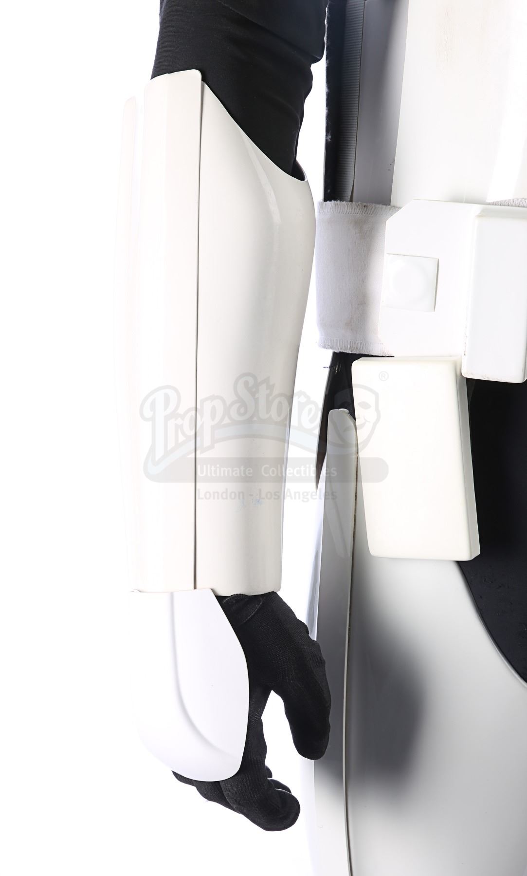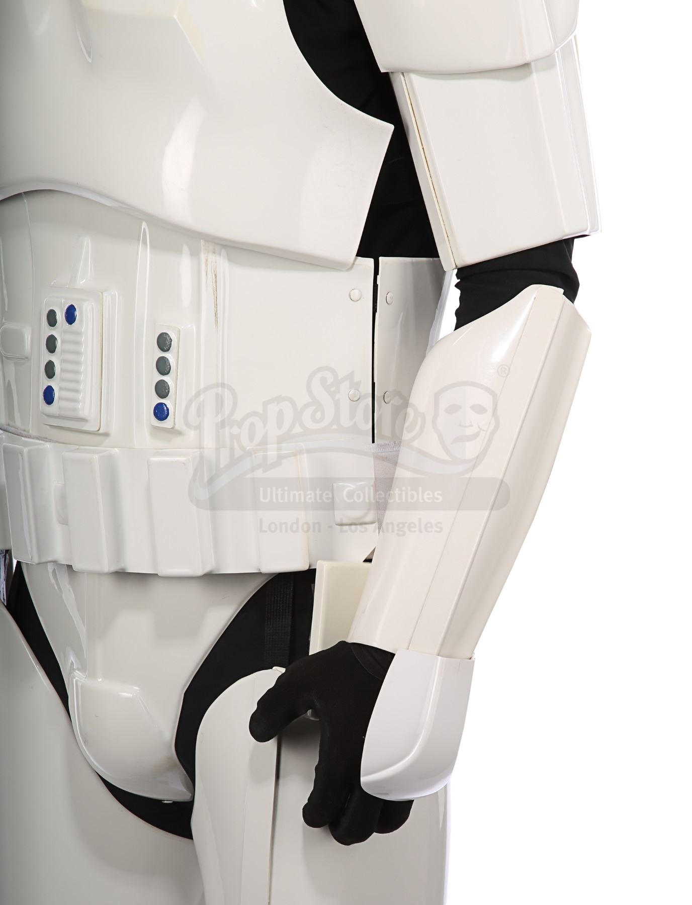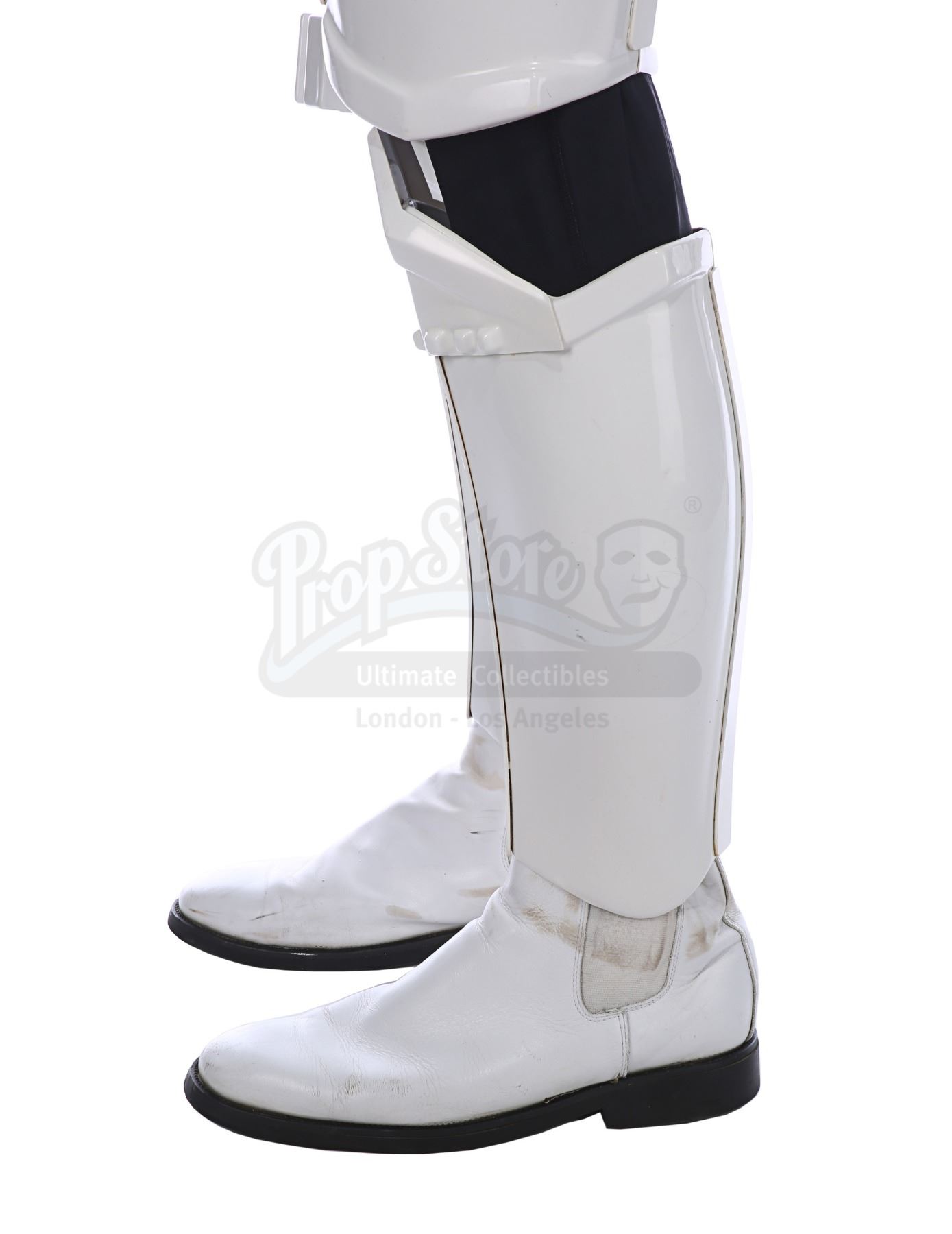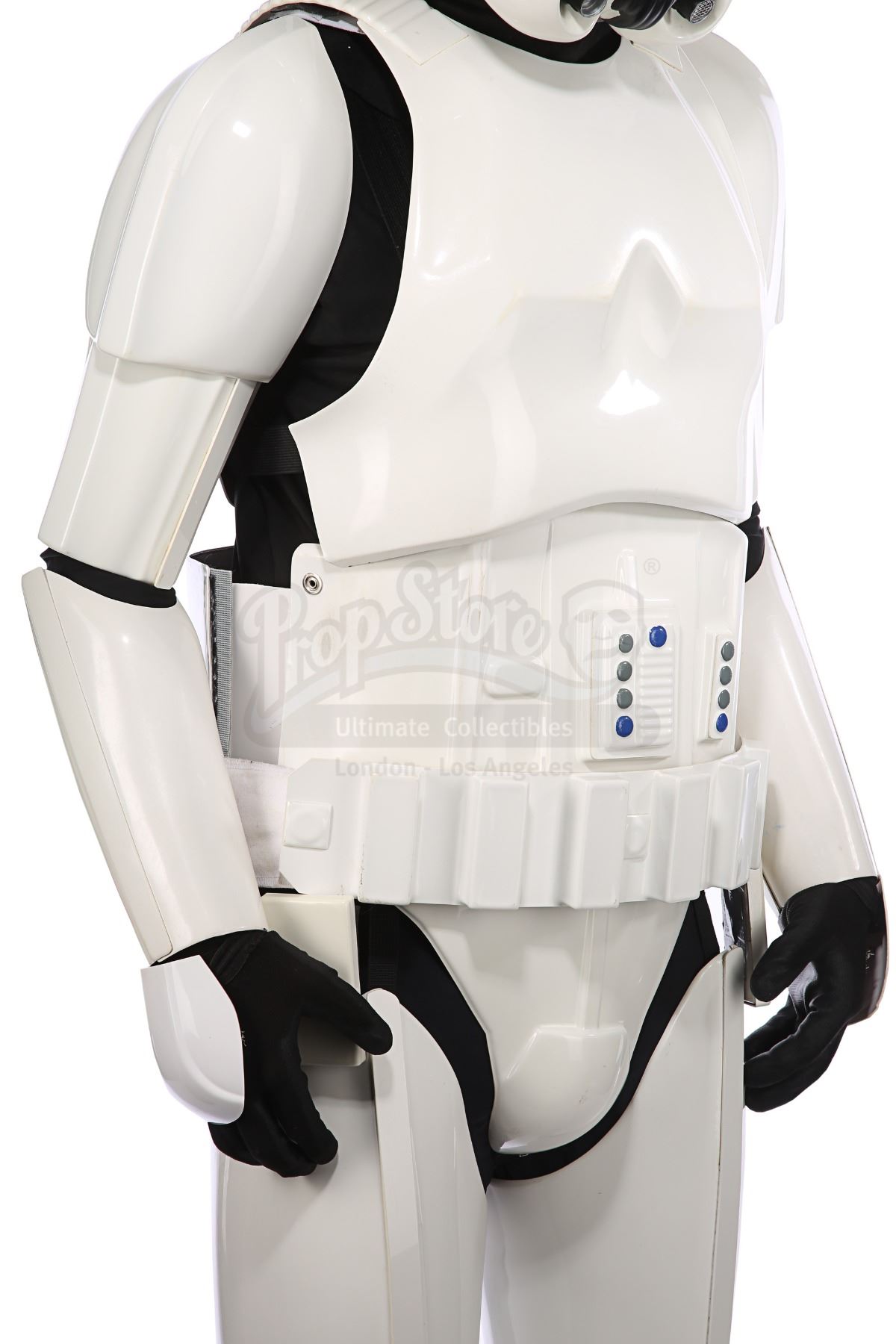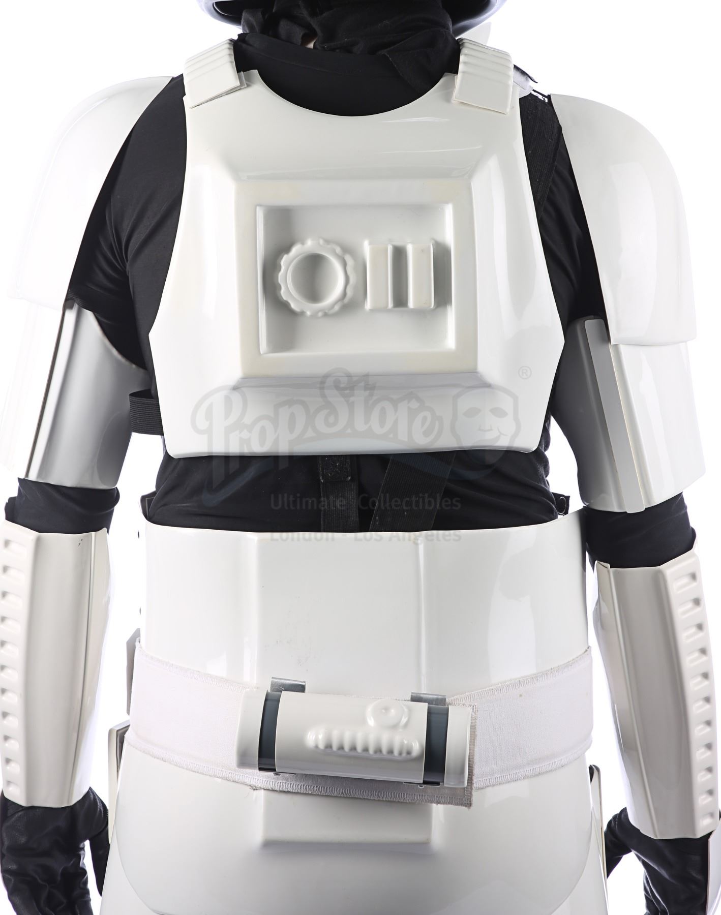 Consisting of white-coloured vacuum-formed plastic components, the costume comprises a hand-painted helmet with a green-tinted visor (labelled "20/3 TR"); a chest and back plate; a pair of plated plastic pauldrons with connected elastic straps (labelled "L" and "R"); a pair of forearm guards; a pair of hand guards (labelled "L" and "R"); an abdominal front plate featuring decorative grey-and-blue button decals; a back abdominal plate; a butt plate; a white canvas belt featuring attached dropboxes; a removable thermal detonator; a pair of thigh guards; a pair of leg armour plates; and a pair of white leather Chelsea boots (size 12). The black underlayer of the costume consists of a snood with ribbed detailing around the neck; a long-sleeved top (size XXL); a leather belt with adhered garters; a pair of Under Armour trousers; and a pair of black gloves (size XL). A metal-studded leather blaster holster, unworn during filming, is also included. The costume displays wear from production use, including scuffing and minor marks on several armour components, several dirt marks on the boots and plucked threads on the holster.