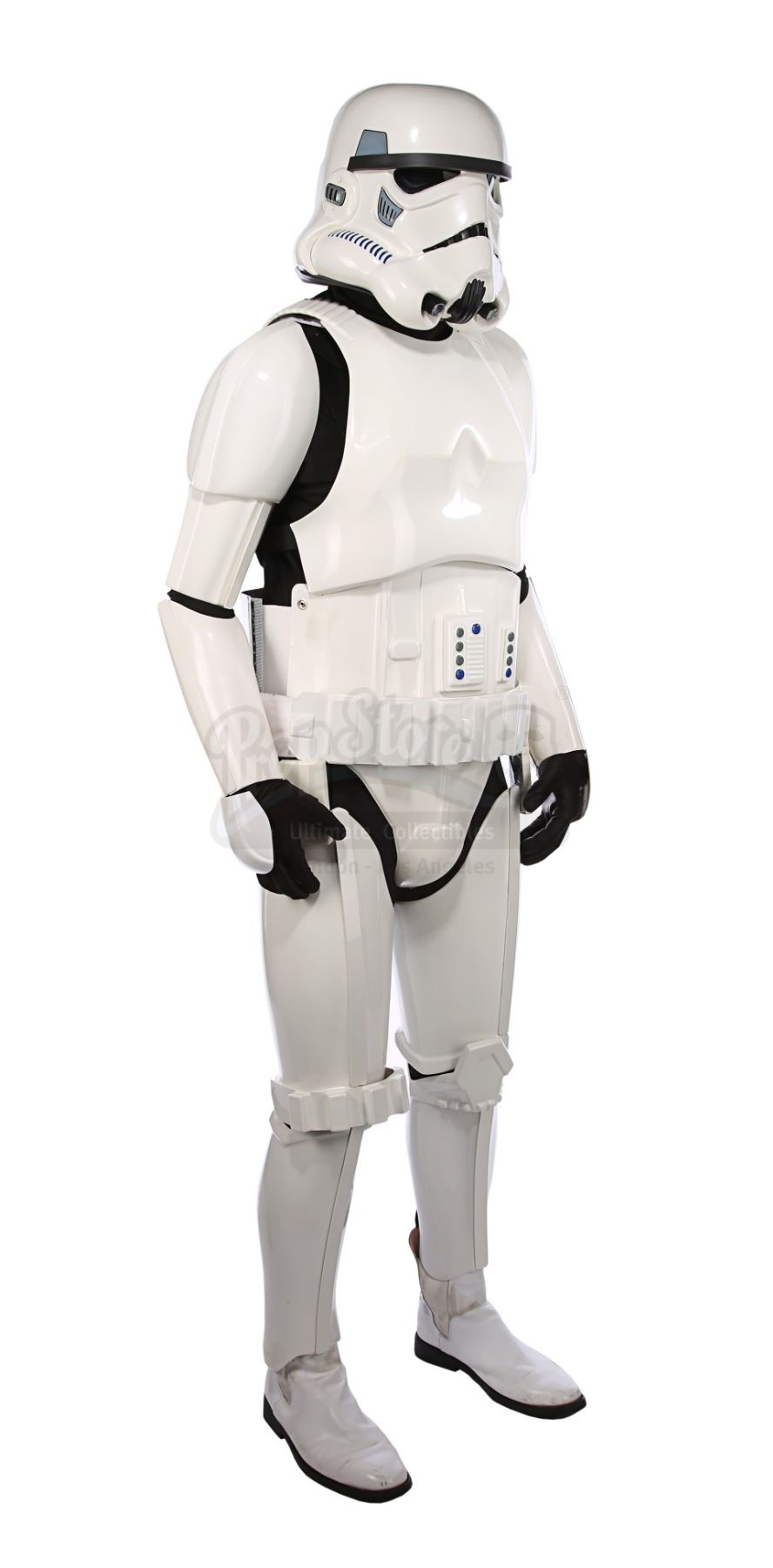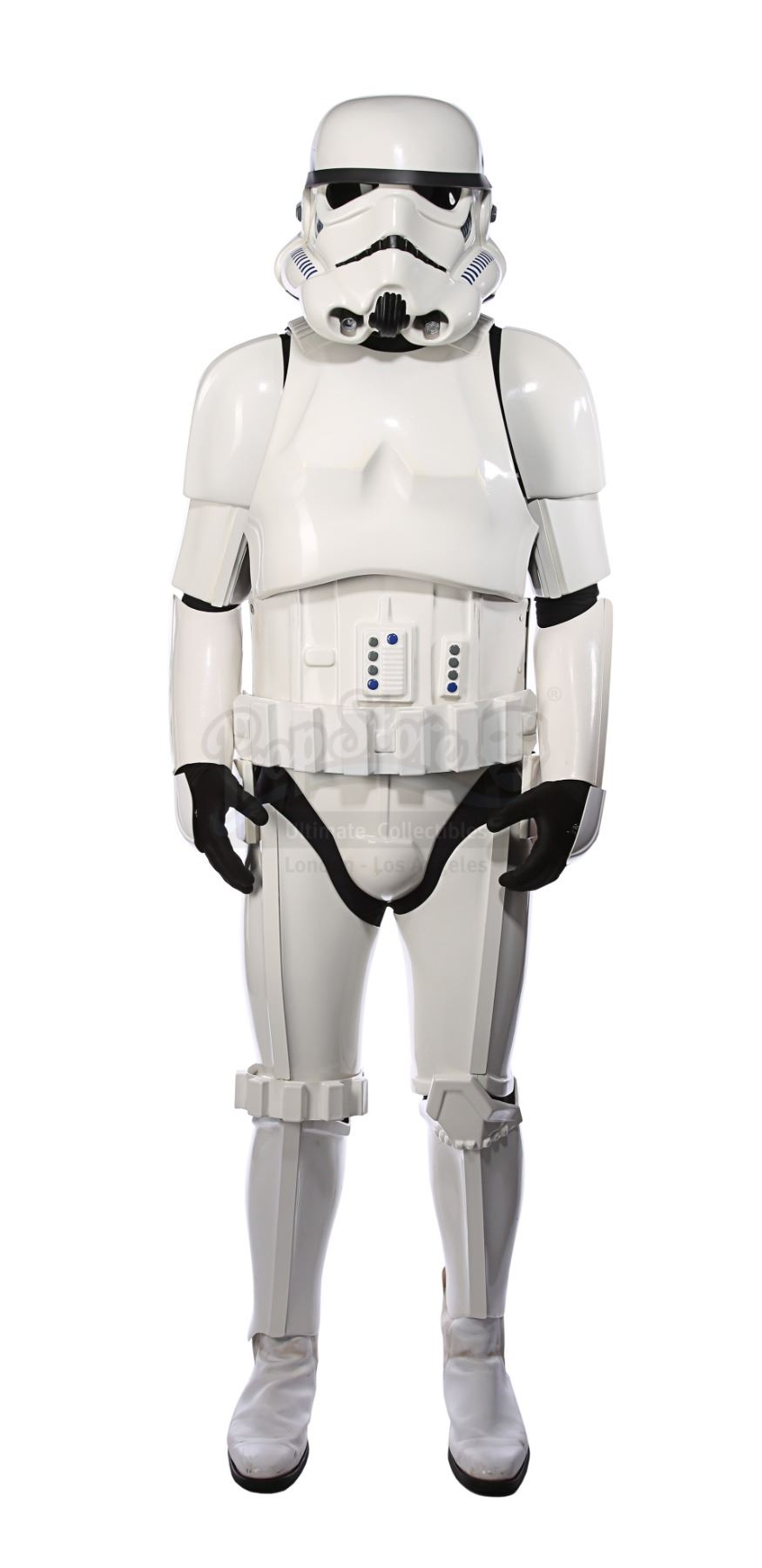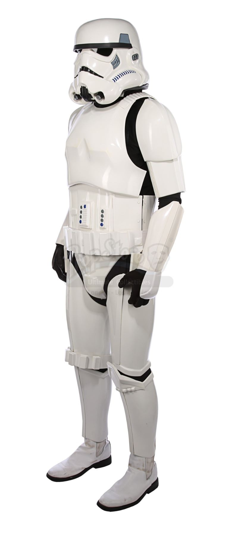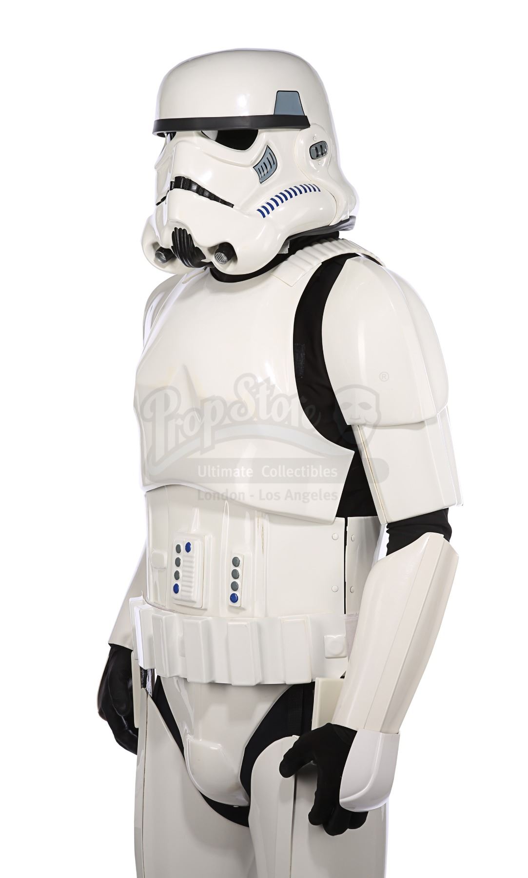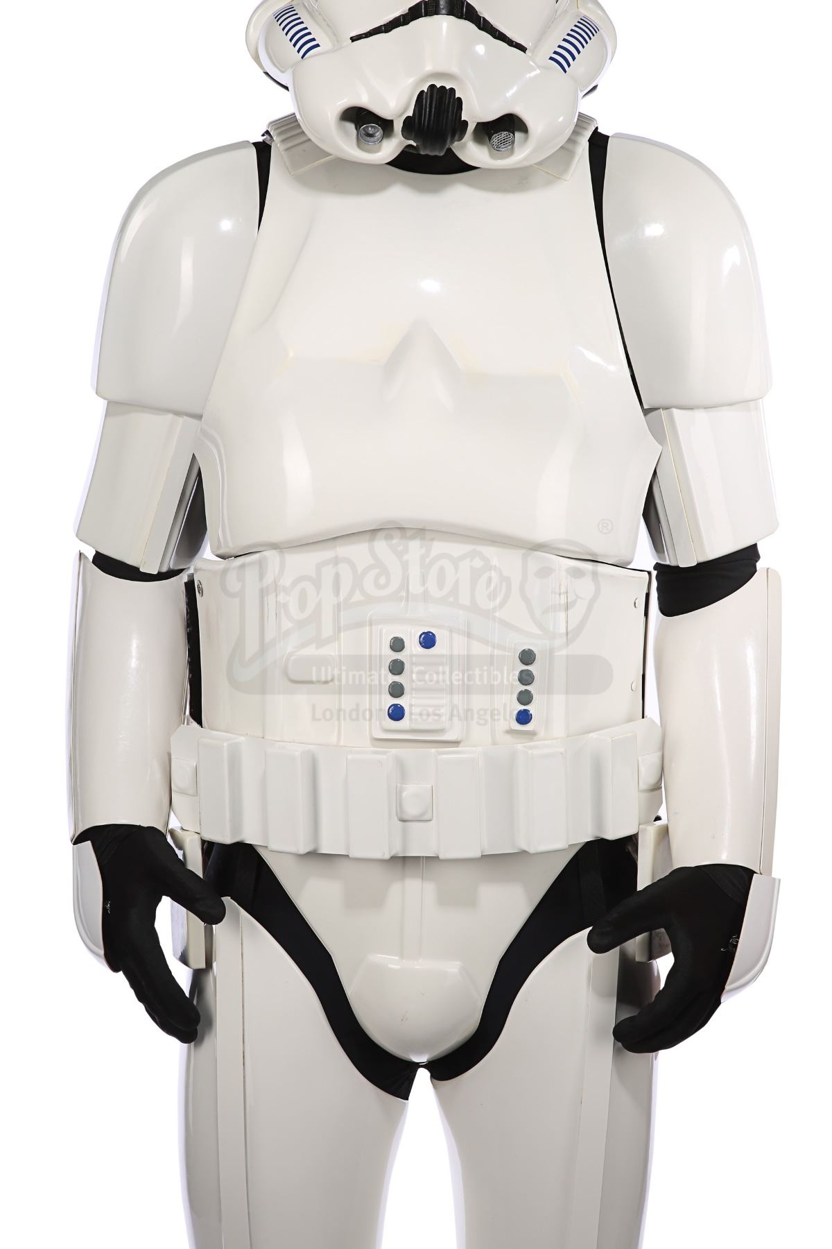 Consisting of white-coloured vacuum-formed plastic components, the costume comprises a hand-painted helmet with a green-tinted visor (labelled "20/3 TR"); a chest and back plate; a pair of plated plastic pauldrons with connected elastic straps (labelled "L" and "R"); a pair of forearm guards; a pair of hand guards (labelled "L" and "R"); an abdominal front plate featuring decorative grey-and-blue button decals; a back abdominal plate; a butt plate; a white canvas belt featuring attached dropboxes; a removable thermal detonator; a pair of thigh guards; a pair of leg armour plates; and a pair of white leather Chelsea boots (size 12). The black underlayer of the costume consists of a snood with ribbed detailing around the neck; a long-sleeved top (size XXL); a leather belt with adhered garters; a pair of Under Armour trousers; and a pair of black gloves (size XL). A metal-studded leather blaster holster, unworn during filming, is also included. The costume displays wear from production use, including scuffing and minor marks on several armour components, several dirt marks on the boots and plucked threads on the holster.