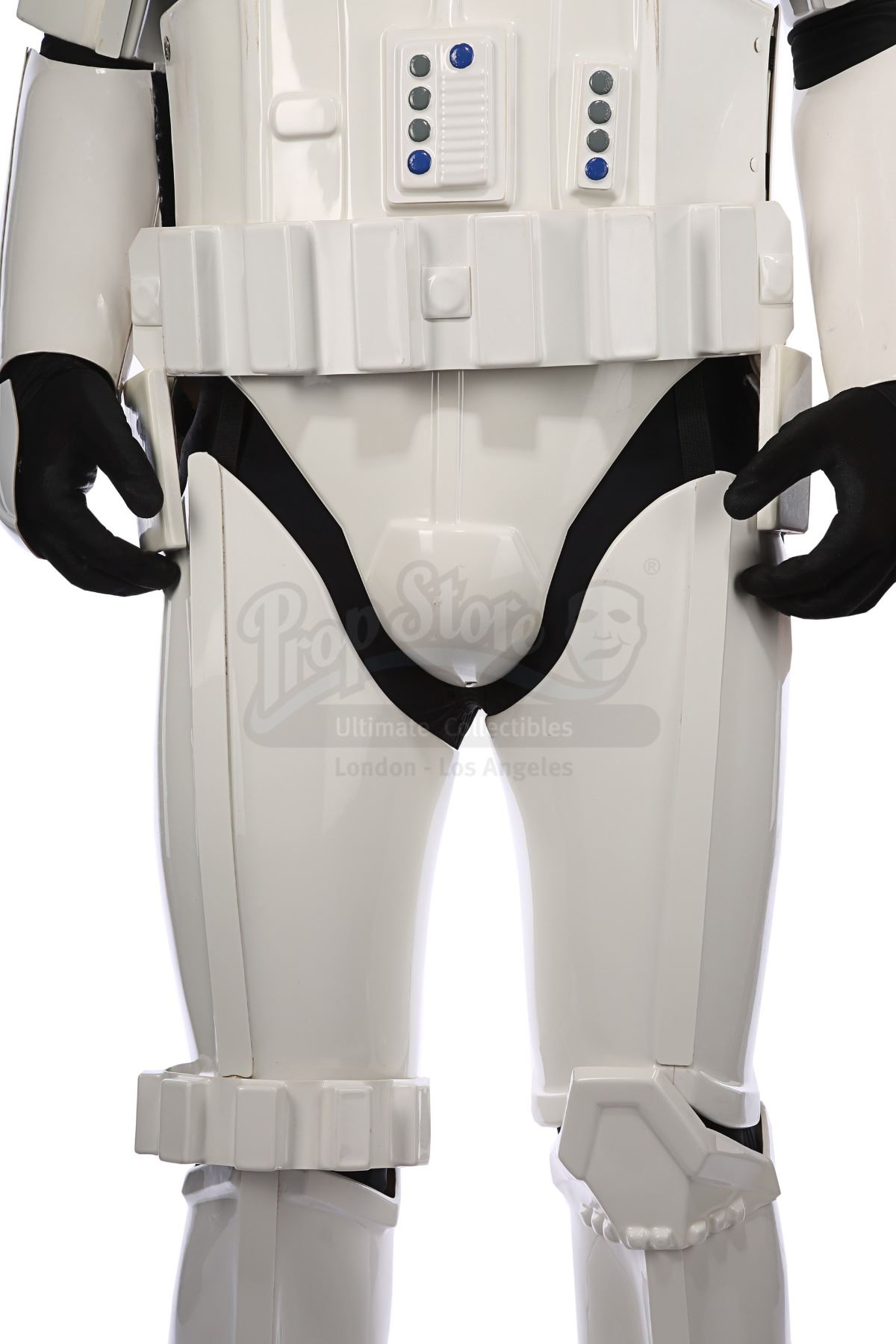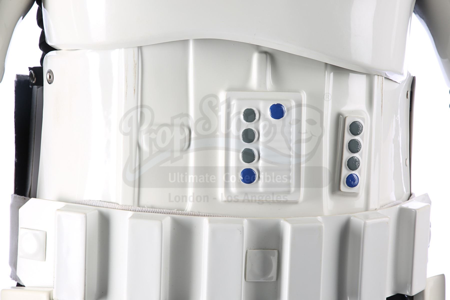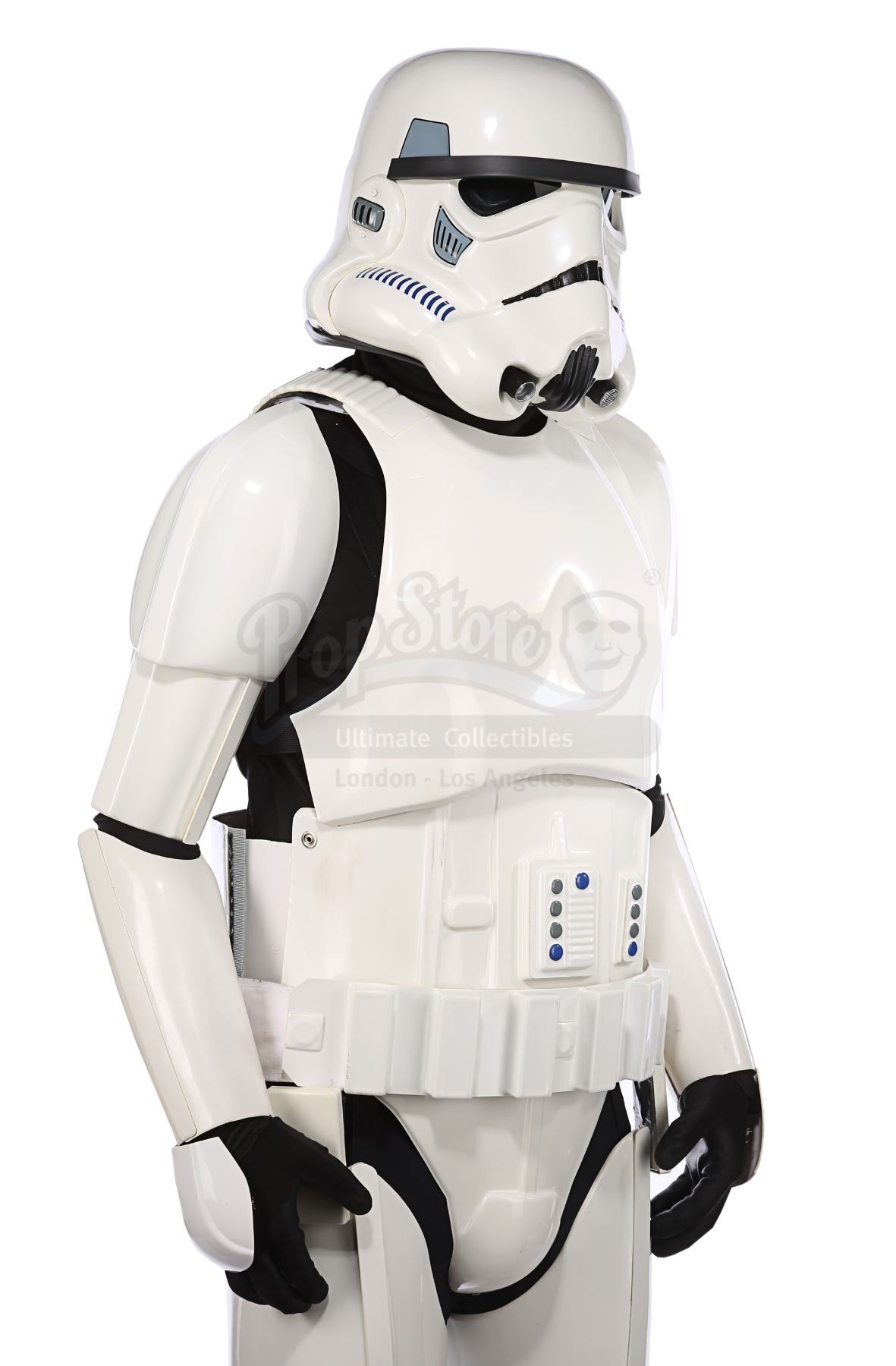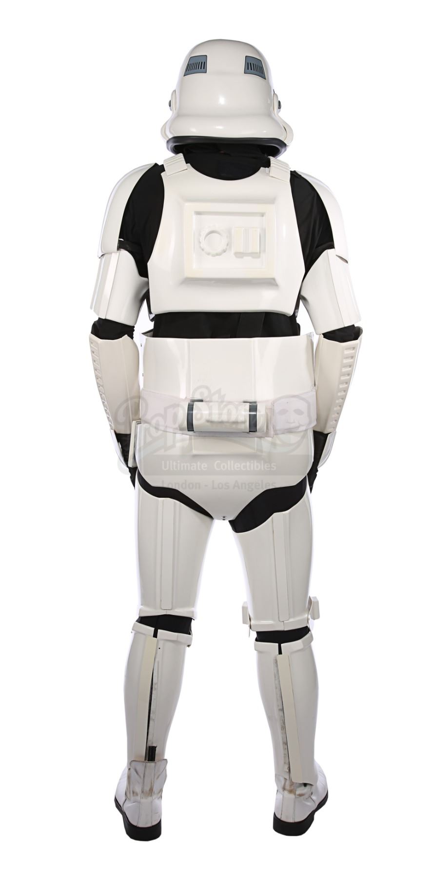 Consisting of white-coloured vacuum-formed plastic components, the costume comprises a hand-painted helmet with a green-tinted visor (labelled "20/3 TR"); a chest and back plate; a pair of plated plastic pauldrons with connected elastic straps (labelled "L" and "R"); a pair of forearm guards; a pair of hand guards (labelled "L" and "R"); an abdominal front plate featuring decorative grey-and-blue button decals; a back abdominal plate; a butt plate; a white canvas belt featuring attached dropboxes; a removable thermal detonator; a pair of thigh guards; a pair of leg armour plates; and a pair of white leather Chelsea boots (size 12). The black underlayer of the costume consists of a snood with ribbed detailing around the neck; a long-sleeved top (size XXL); a leather belt with adhered garters; a pair of Under Armour trousers; and a pair of black gloves (size XL). A metal-studded leather blaster holster, unworn during filming, is also included. The costume displays wear from production use, including scuffing and minor marks on several armour components, several dirt marks on the boots and plucked threads on the holster.