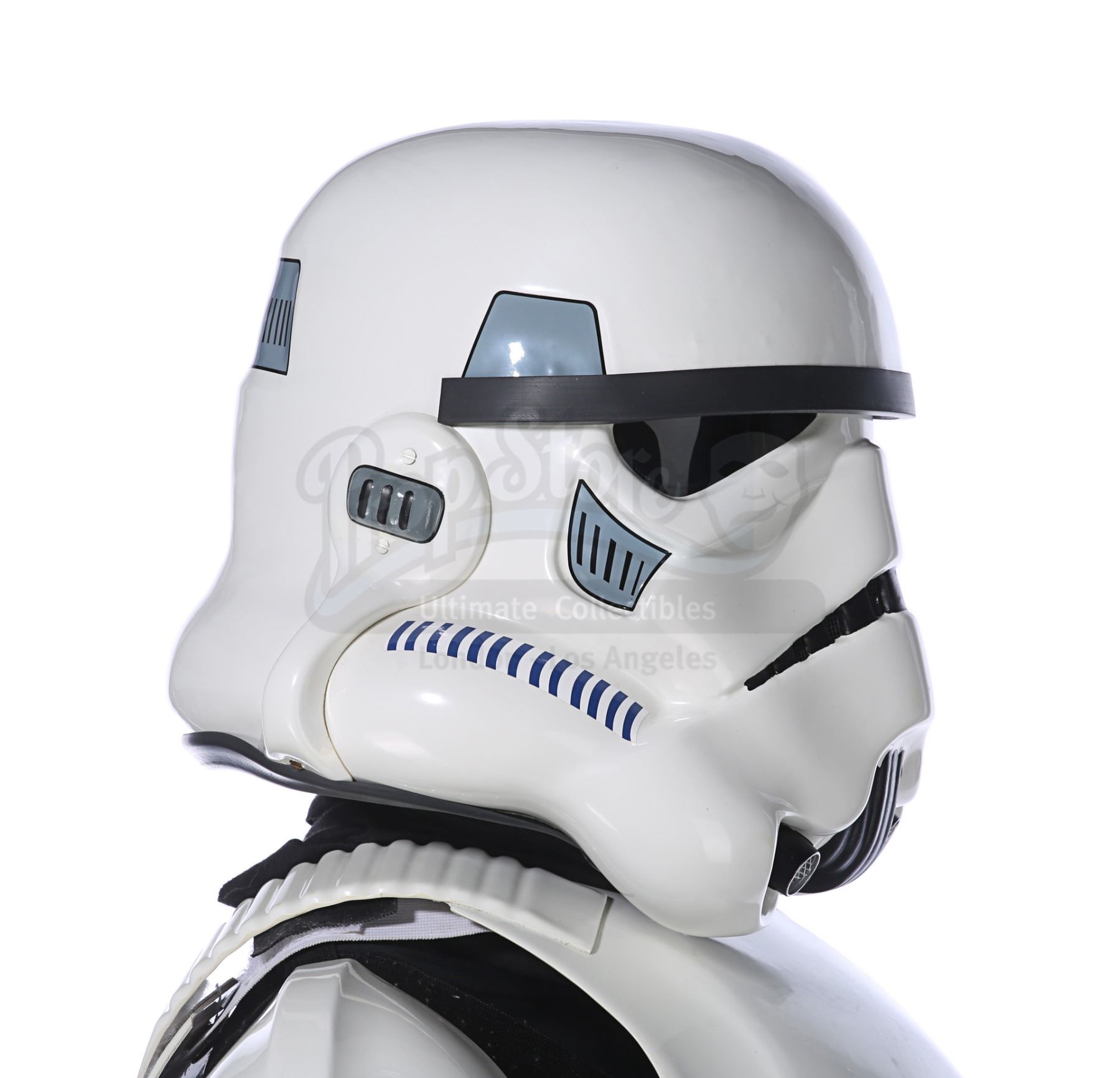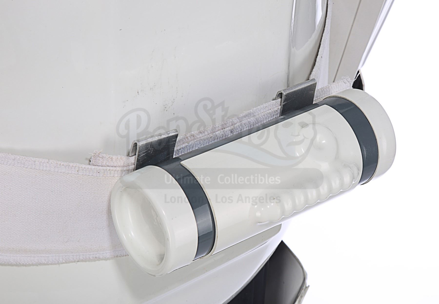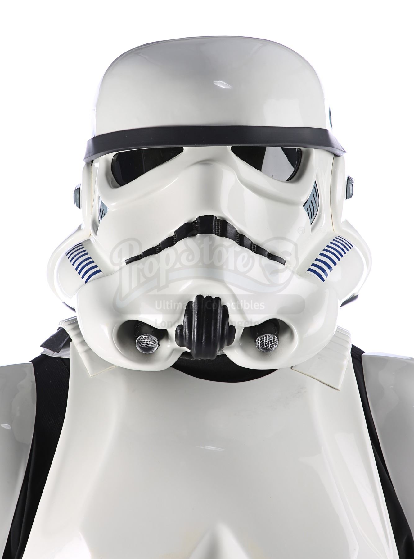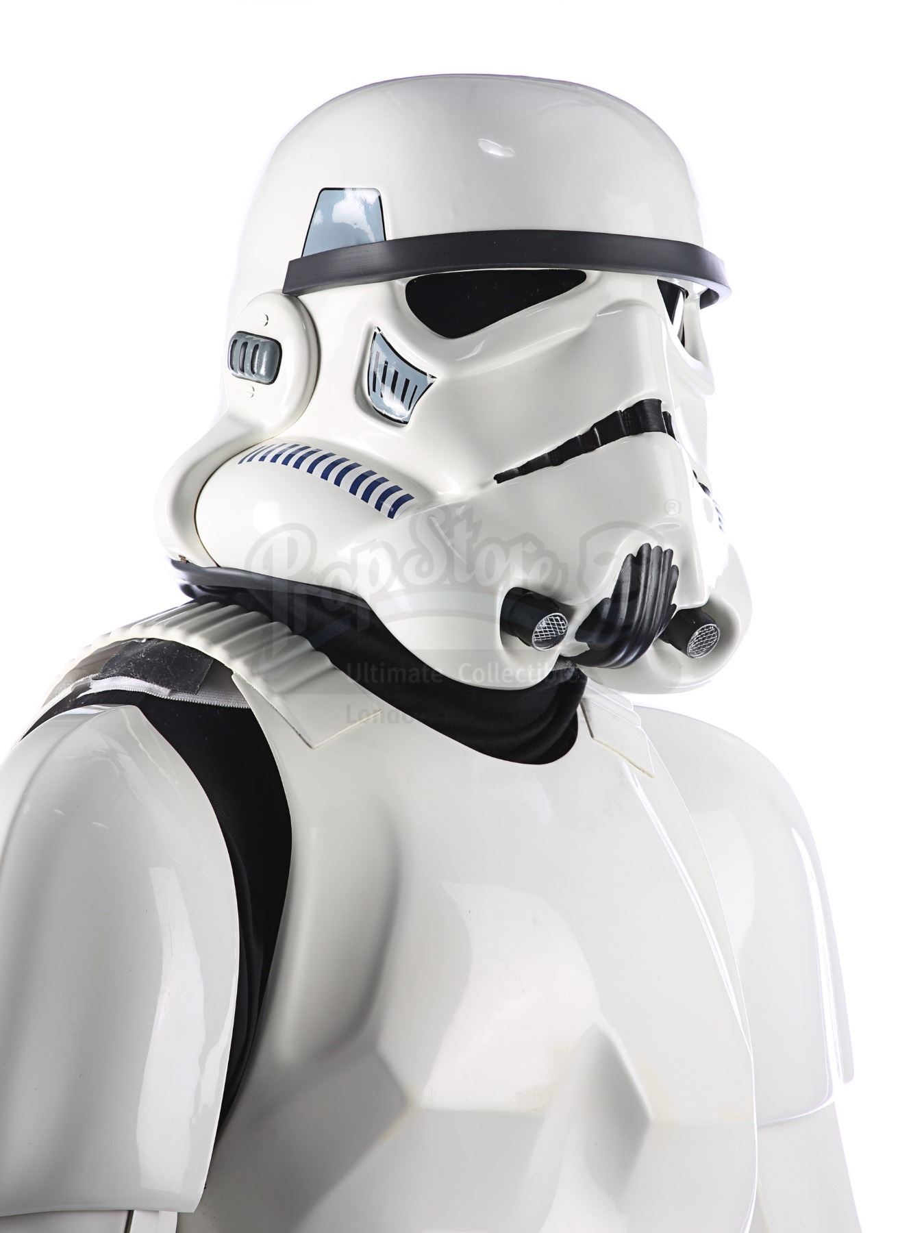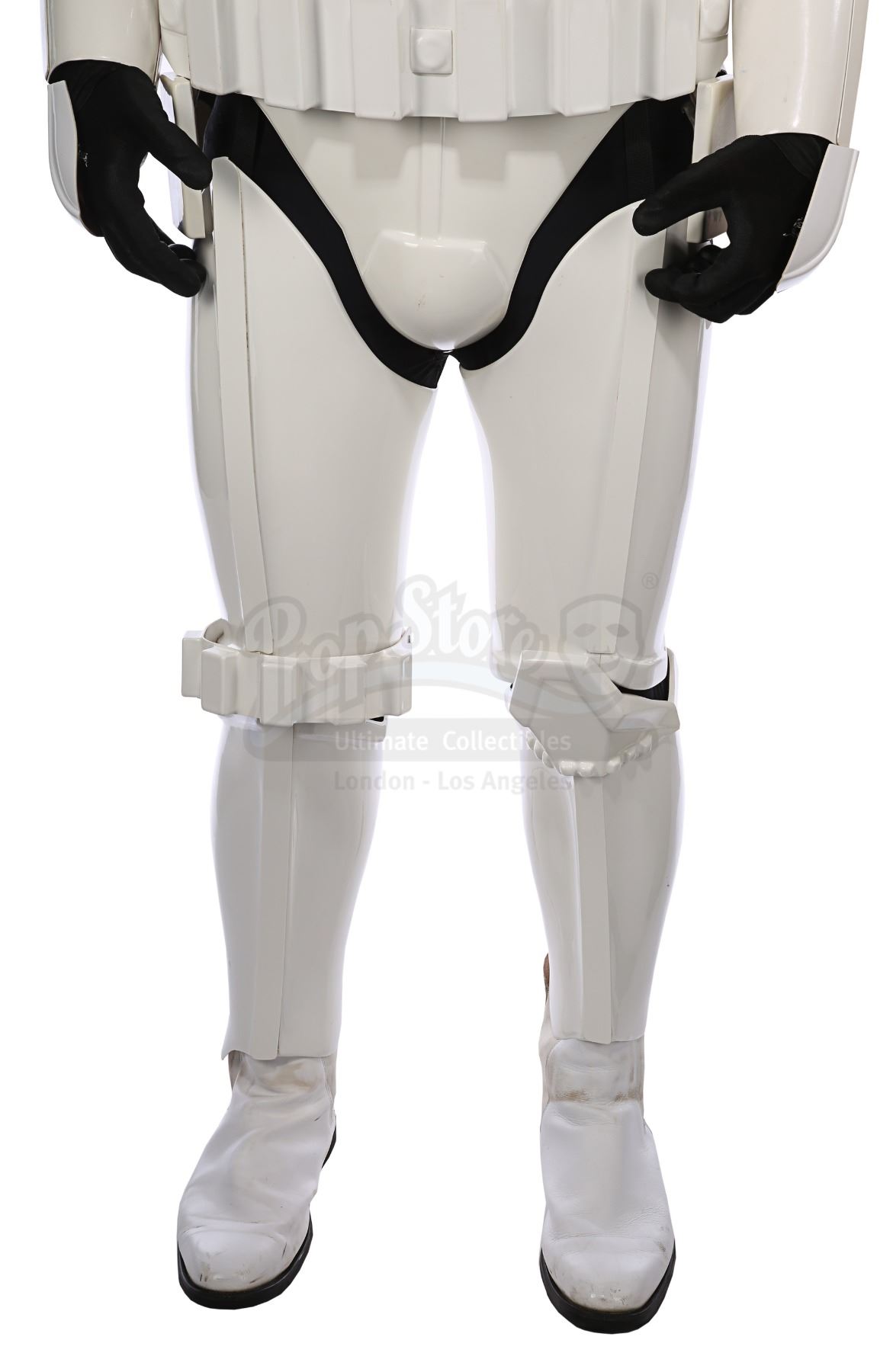 Consisting of white-coloured vacuum-formed plastic components, the costume comprises a hand-painted helmet with a green-tinted visor (labelled "20/3 TR"); a chest and back plate; a pair of plated plastic pauldrons with connected elastic straps (labelled "L" and "R"); a pair of forearm guards; a pair of hand guards (labelled "L" and "R"); an abdominal front plate featuring decorative grey-and-blue button decals; a back abdominal plate; a butt plate; a white canvas belt featuring attached dropboxes; a removable thermal detonator; a pair of thigh guards; a pair of leg armour plates; and a pair of white leather Chelsea boots (size 12). The black underlayer of the costume consists of a snood with ribbed detailing around the neck; a long-sleeved top (size XXL); a leather belt with adhered garters; a pair of Under Armour trousers; and a pair of black gloves (size XL). A metal-studded leather blaster holster, unworn during filming, is also included. The costume displays wear from production use, including scuffing and minor marks on several armour components, several dirt marks on the boots and plucked threads on the holster.