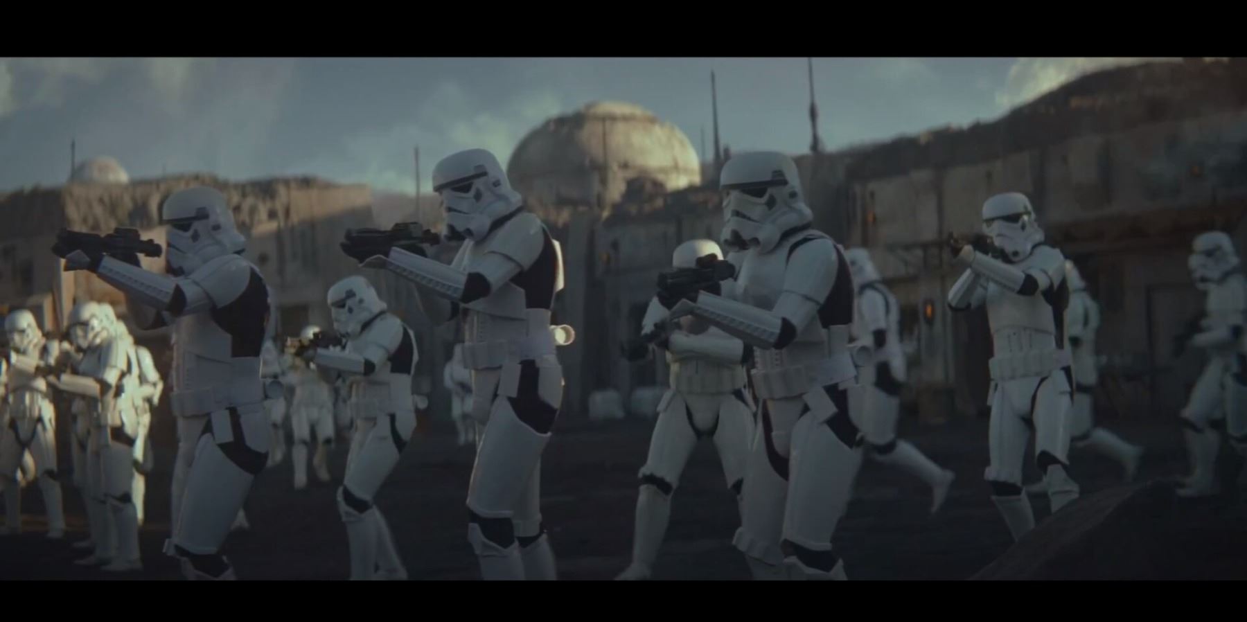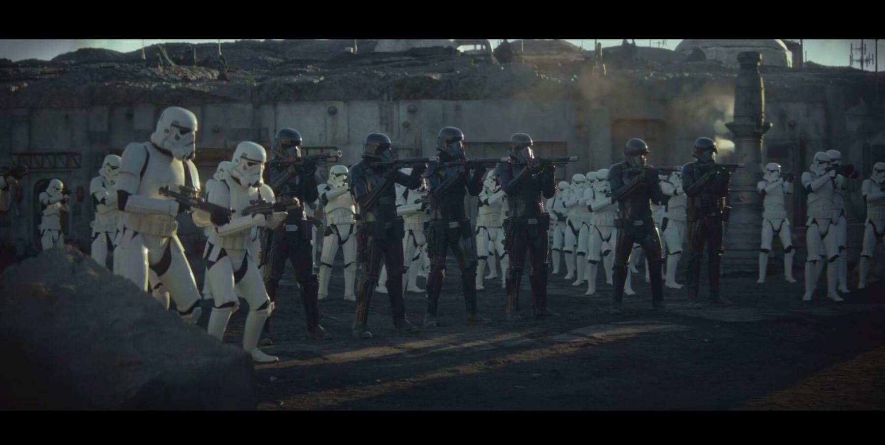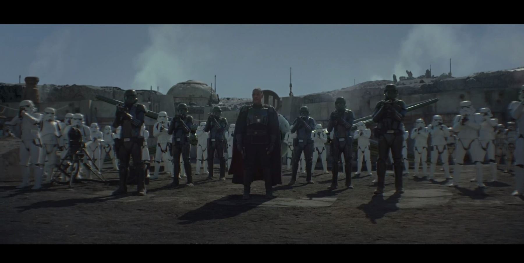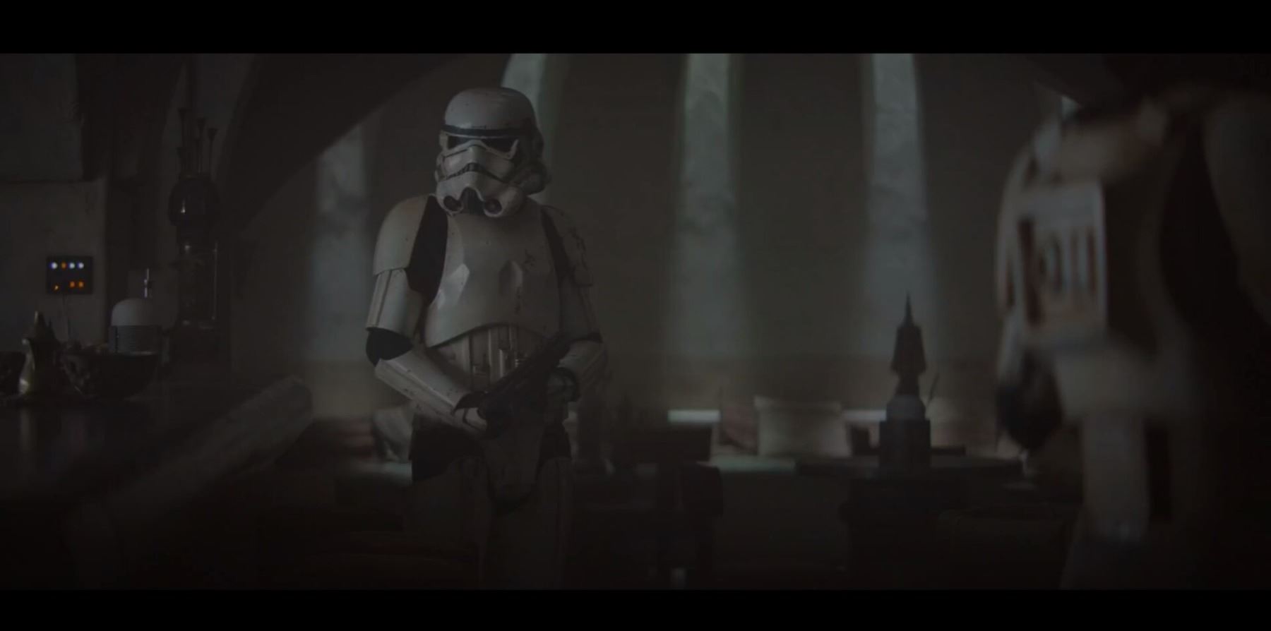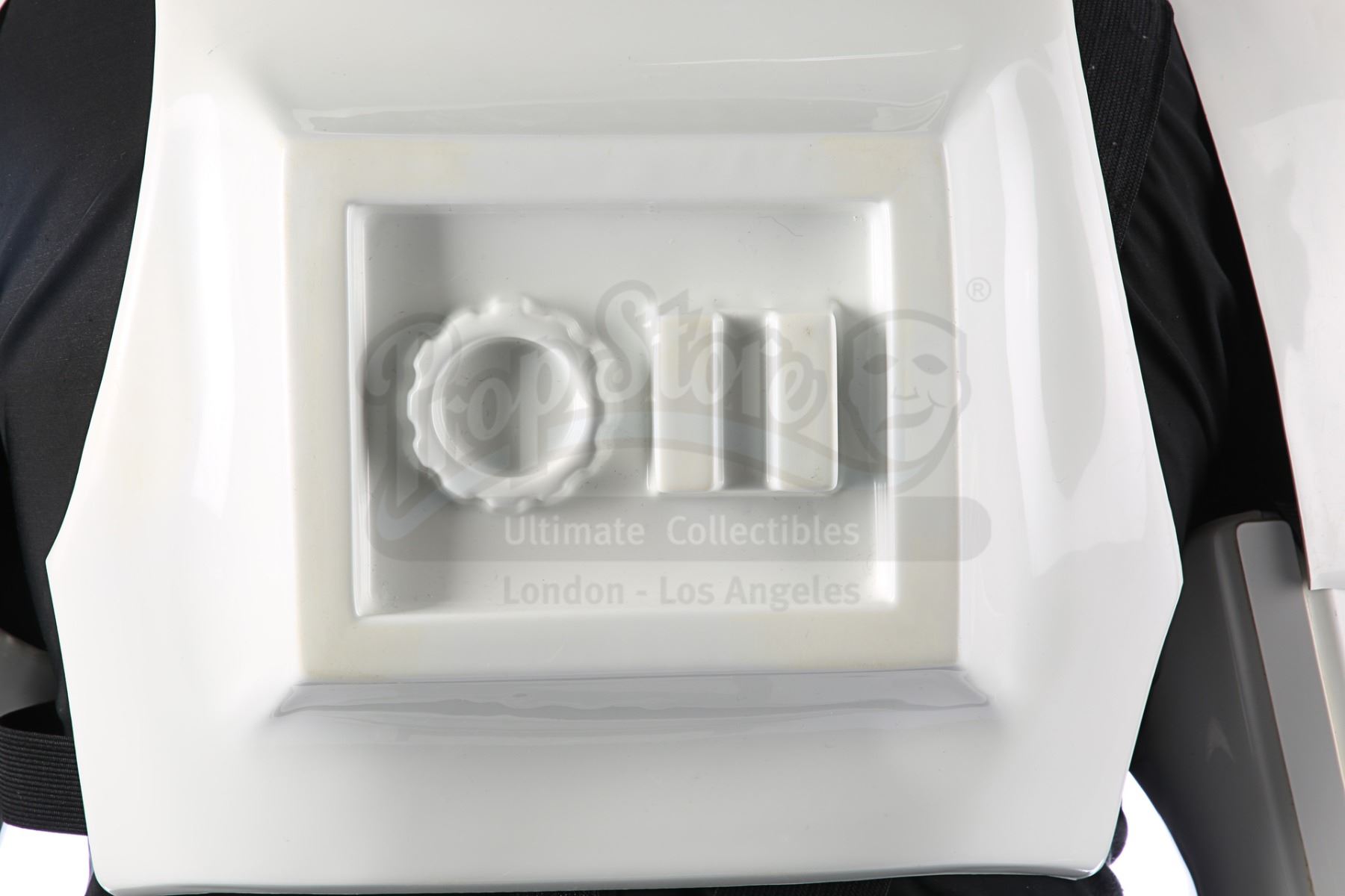Consisting of white-coloured vacuum-formed plastic components, the costume comprises a hand-painted helmet with a green-tinted visor (labelled "20/3 TR"); a chest and back plate; a pair of plated plastic pauldrons with connected elastic straps (labelled "L" and "R"); a pair of forearm guards; a pair of hand guards (labelled "L" and "R"); an abdominal front plate featuring decorative grey-and-blue button decals; a back abdominal plate; a butt plate; a white canvas belt featuring attached dropboxes; a removable thermal detonator; a pair of thigh guards; a pair of leg armour plates; and a pair of white leather Chelsea boots (size 12). The black underlayer of the costume consists of a snood with ribbed detailing around the neck; a long-sleeved top (size XXL); a leather belt with adhered garters; a pair of Under Armour trousers; and a pair of black gloves (size XL). A metal-studded leather blaster holster, unworn during filming, is also included. The costume displays wear from production use, including scuffing and minor marks on several armour components, several dirt marks on the boots and plucked threads on the holster.