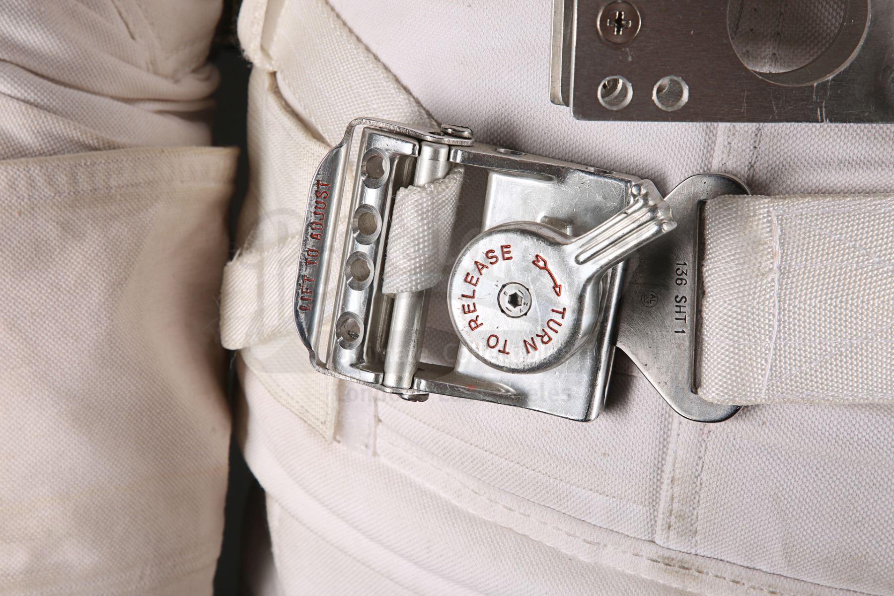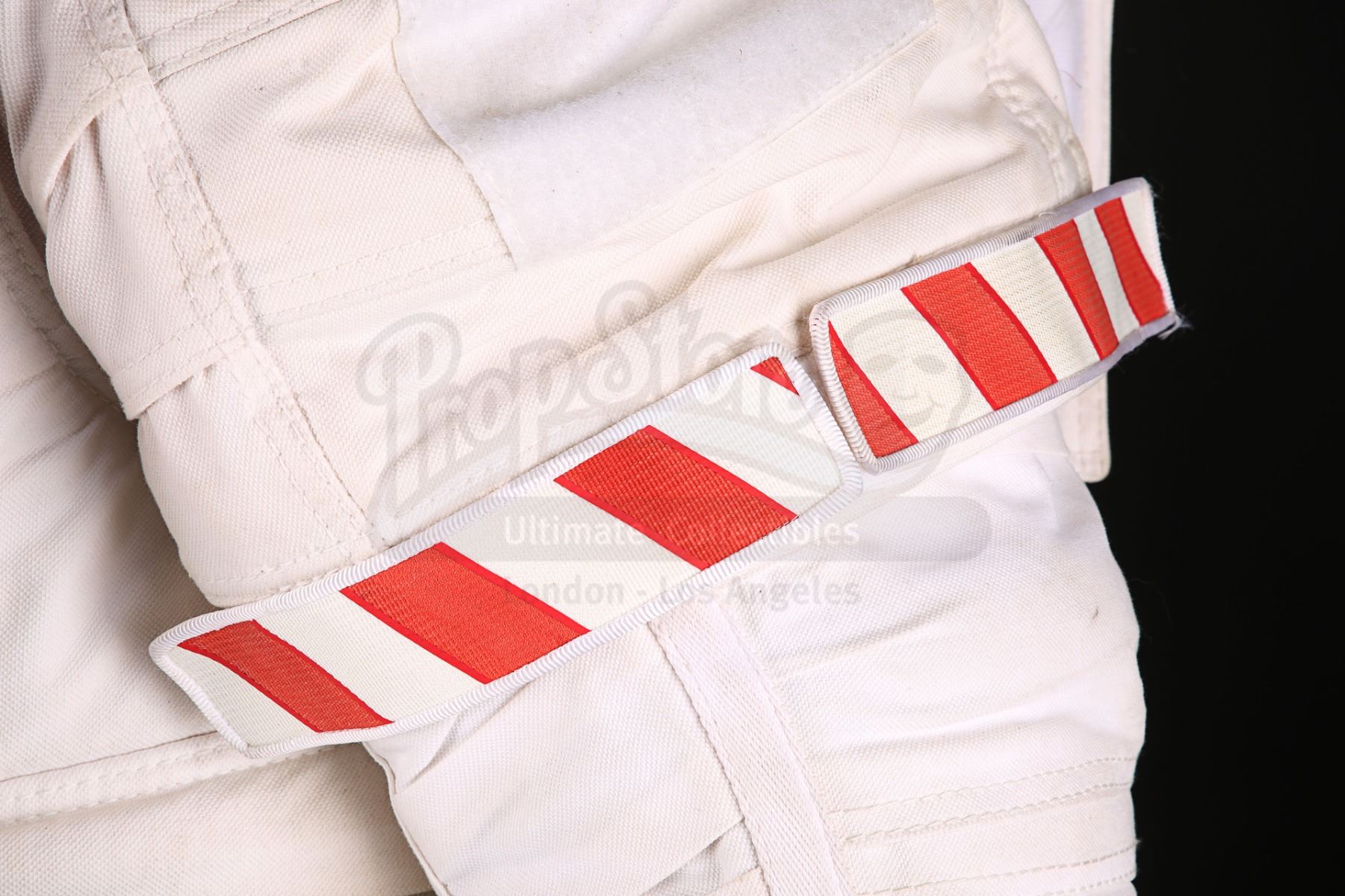 The helmet is made of white metal and features a clear plastic front, a functioning faux-gold sun visor, and lights on either side. The helmet is labelled "7" within. A chest pack is adhered to the torso and has a metal rig secured to the bottom. Orange-and-white "Lewis" insignia Velcro strips are attached across the suit. The skull cap displays a label on the inside reading "Ladies Stunt".