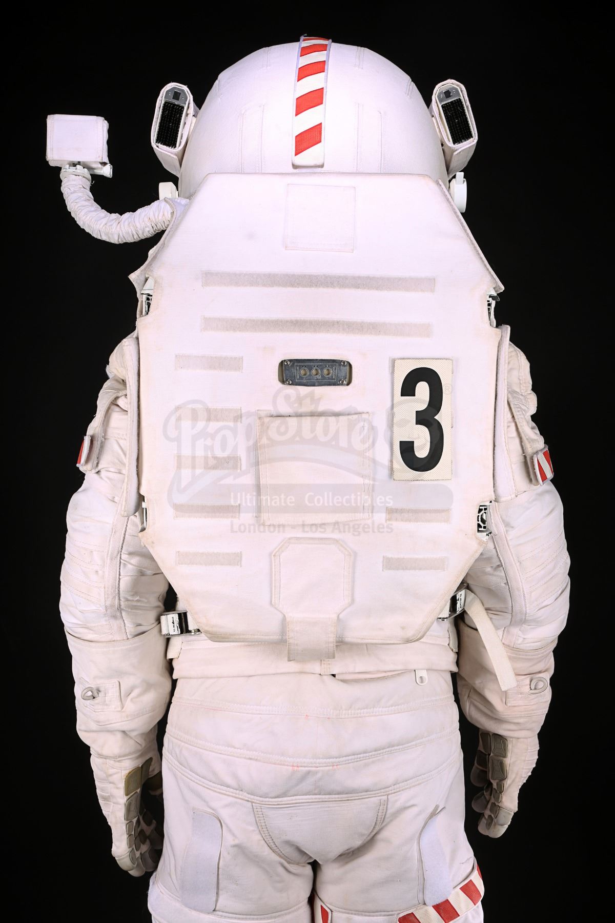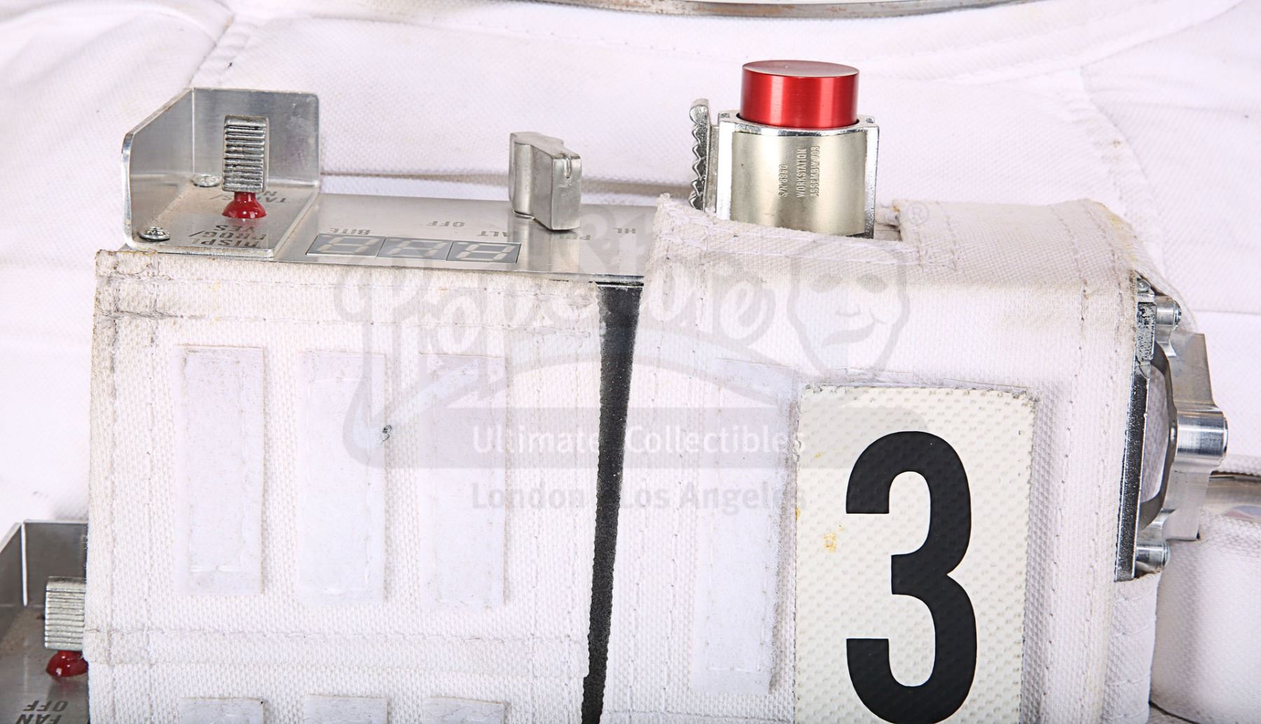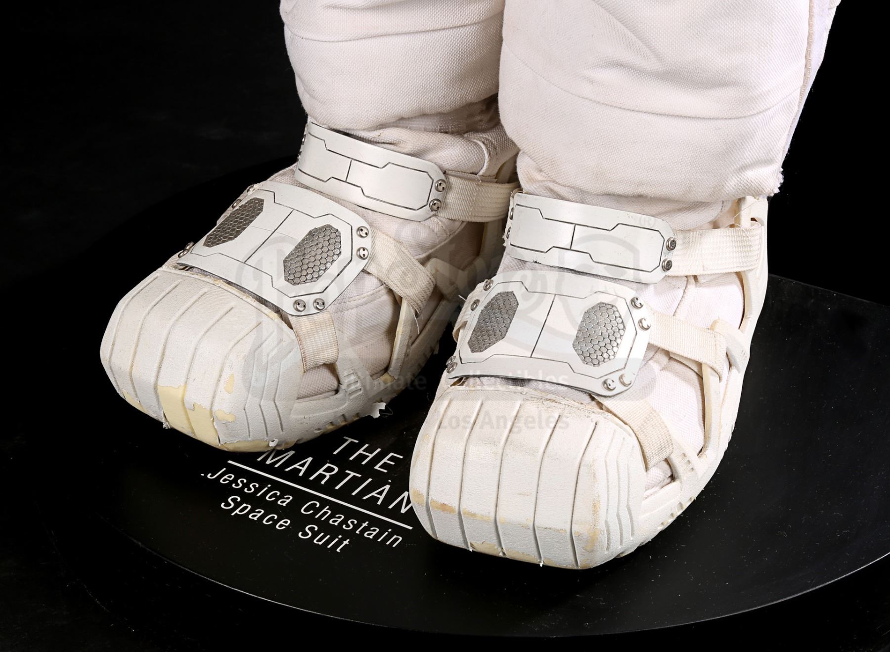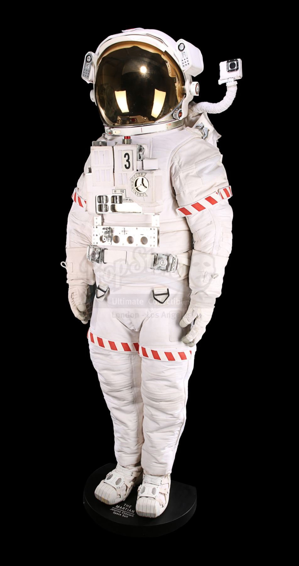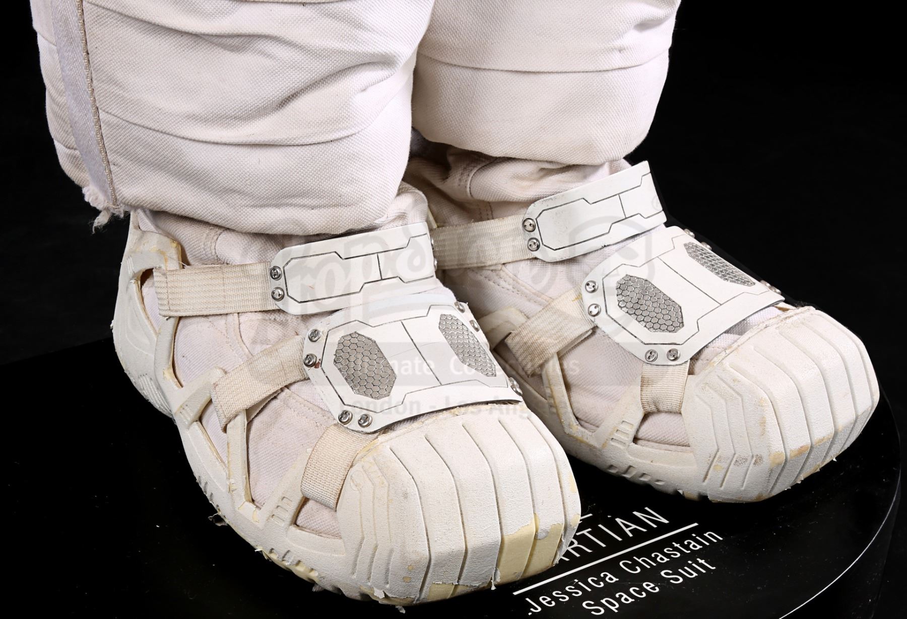 Melissa Lewis' (Jessica Chastain) EVA suit from Ridley Scott's sci-fi survival drama The Martian. Lewis wore her extra-vehicular activity (EVA) suit when operating the Manned Maneuvering Unit during the Hermes mission to rescue Mark Watney (Matt Damon) from Mars. The EVA costume was based on a version of a NASA suit used for moving outside the International Space Station, and created by costume designer Janty Yates, Scott's long-time collaborator. Yates and Scott have worked together on a number of sci-fi films, including Prometheus and Alien: Covenant.The suit is constructed primarily from a white synthetic material and comprises a helmet; a black-and-white skull cap; a torso with a backpack and GoPro camera housing attached; a pair of trousers; a set of gloves with rubber fingertip and palm detailing; and a pair of boots with rubber-sole crampons.