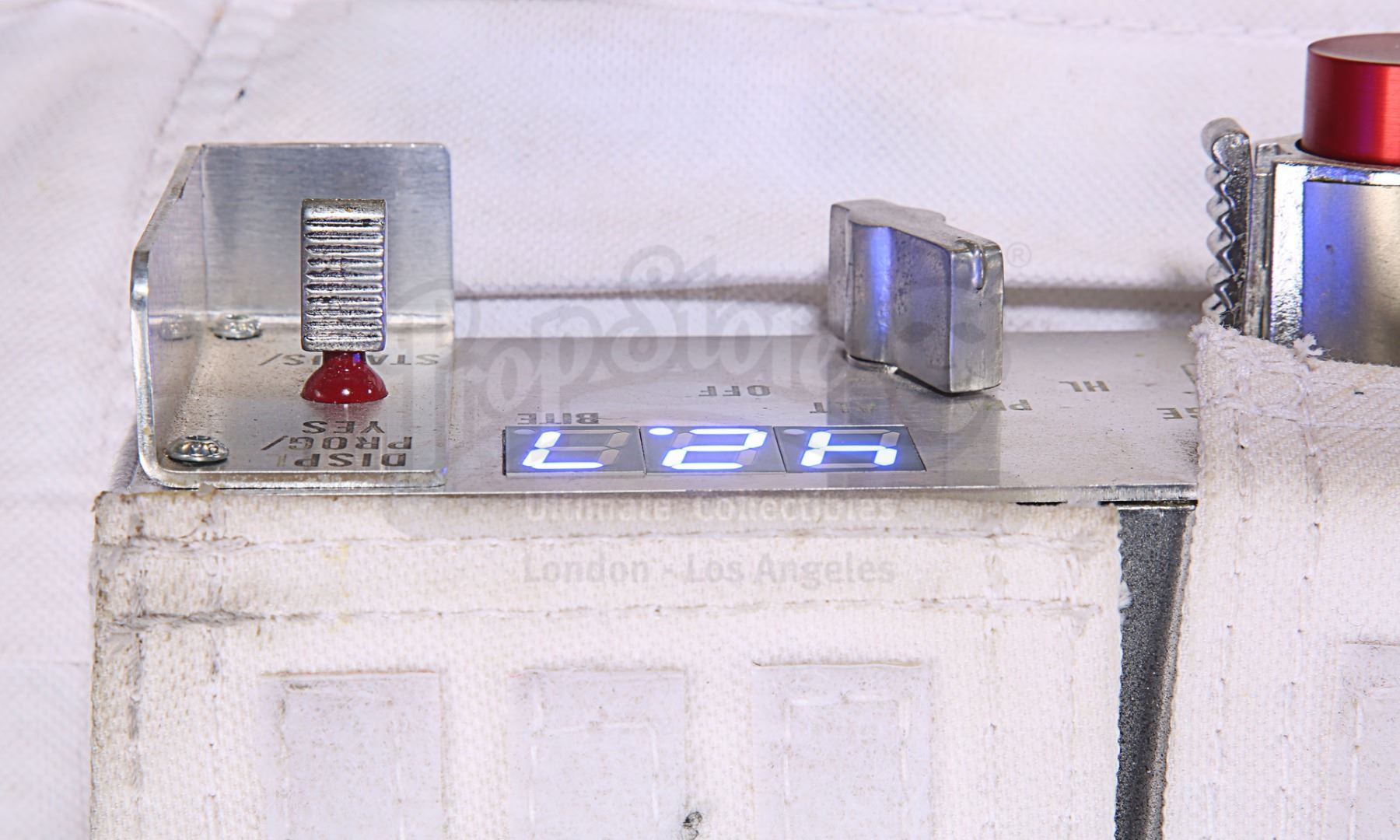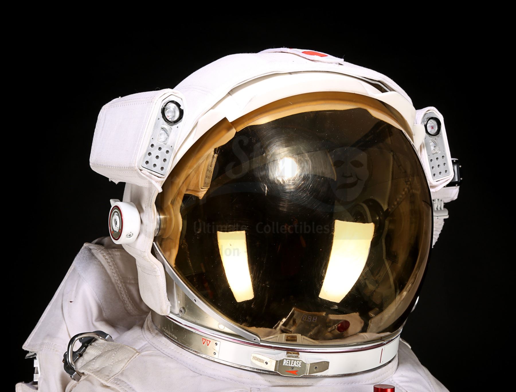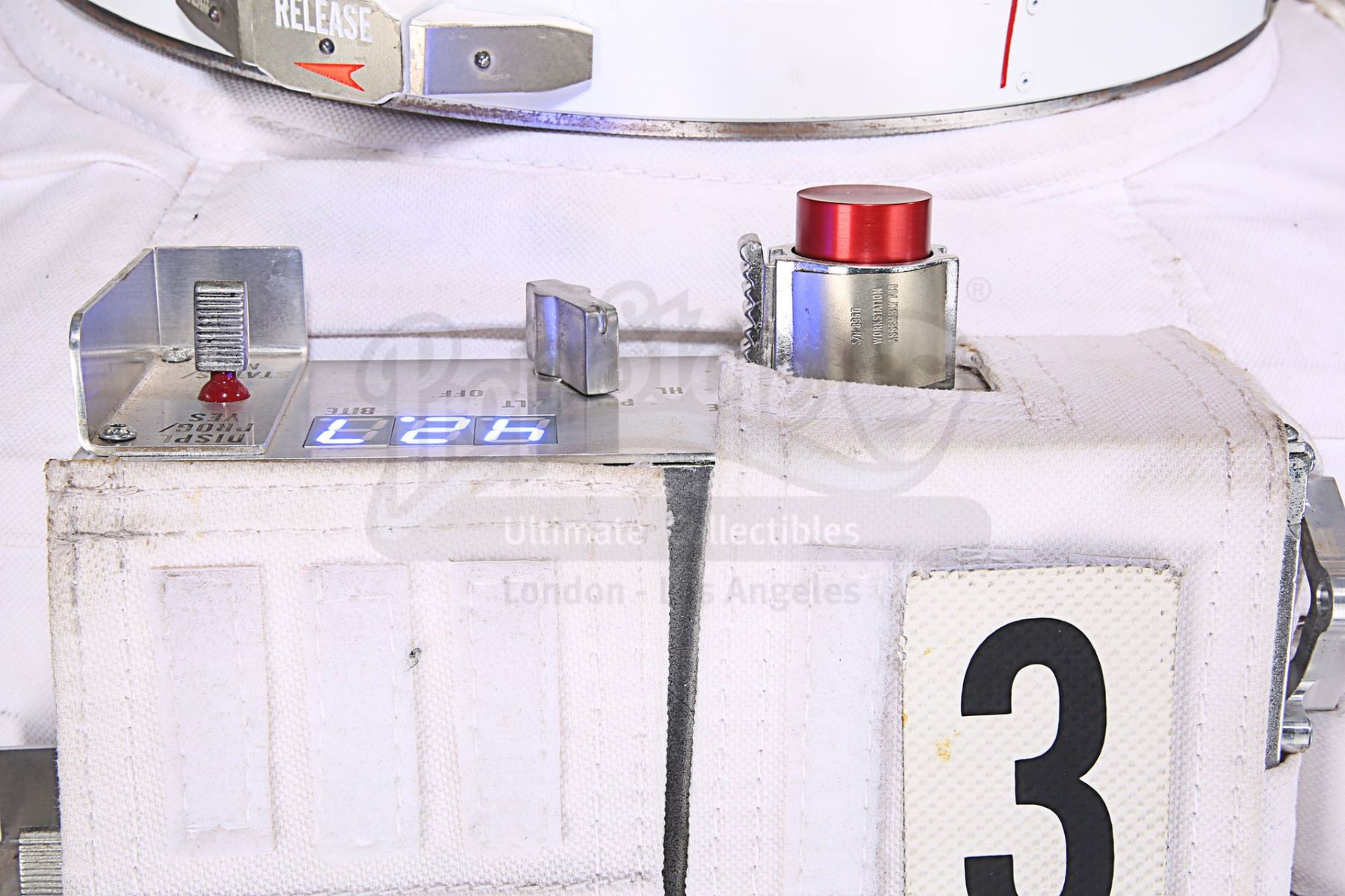 Fitted to the helmet and chest pack are electronic components that allow them to illuminate with LEDs. The helmet is powered by a 12V lithium-polymer battery (not included) inserted into the backpack, and would have been activated by an external remote control. A 9V battery (not included) can be fitted into the chest to light up the blue LED digits on the front. The space suit shows minor distressing from use on production and is mounted to a custom-made display mannequin. Dimensions (displayed): 50 cm x 72 cm x 190 cm (19 3/4" x 28 1/4" x 74 3/4")