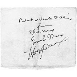 "A great Marx Brothers item, vintage signatures by all three Marx Brothers, penned on a sm. 8vo. sheet. Inscription in the hand of CHICO MARX: ""Best wishes to Alisa from Chico Marx,"" with GROUCHO MARX and HARPO MARX signing beneath. Slight wear and soiling, a central fold through signatures, otherwise very good." 2352 A great Marx Brothers item, vintage signatures by all three Marx Brothers, penned on a sm. 8vo. sheet. Inscription in the hand of CHICO MARX: ""Best wishes to Alisa from Chico Marx,"" with GROUCHO MARX and HARPO MARX signing beneath. Slight wear and soiling, a central fold through signatures, otherwise very good.