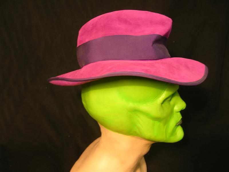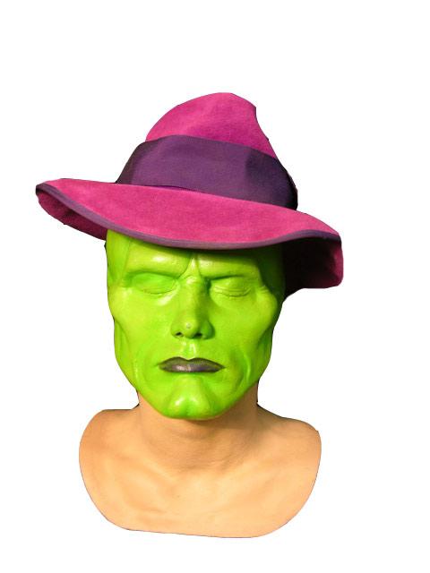 The Mask (1994) - This is the paint test head of Jim Carey in his Mask make-up for approval by Director Chuck Russell. Made by make-up designer Greg Cannom, a multiple Oscar winner. Includes production used purple fedora (with make-up residue in inner lining from special custom mixed green make-up). The hat was purchased on Saville Row in London, a very upscale and expensive fashion district. (14 x 17 x 17) This item is oversized and will require additional shipping charges. Please email for shipping rates prior to bidding.