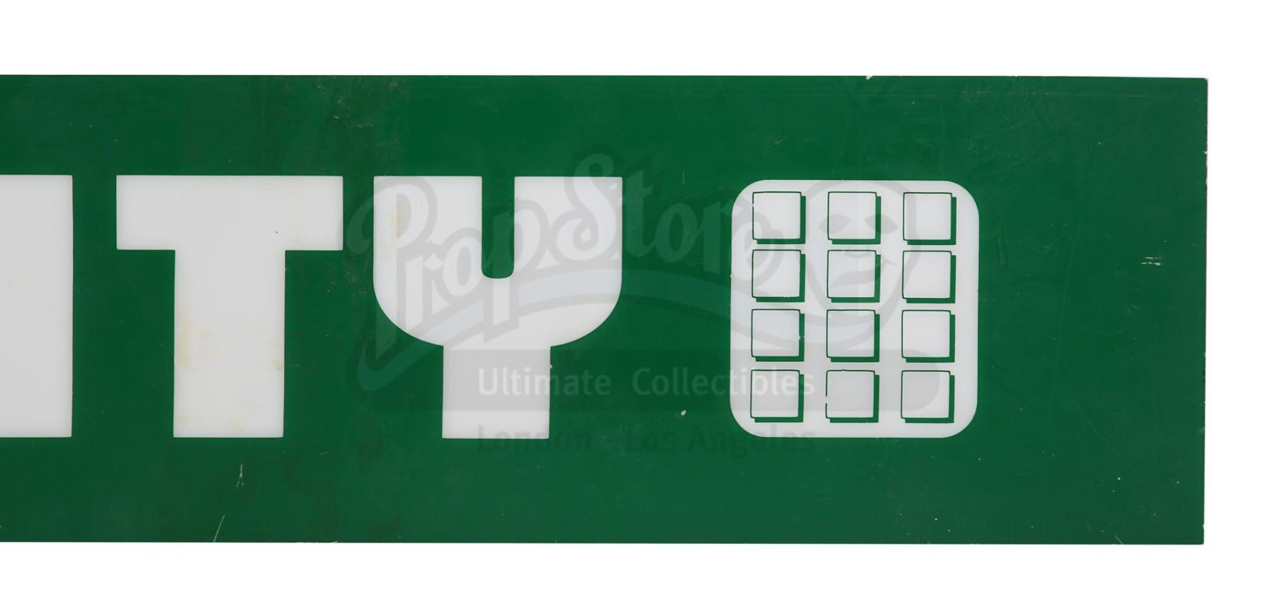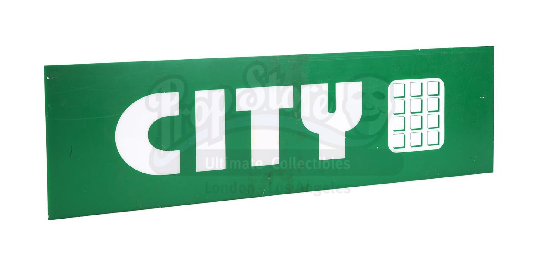 The green sign is made of acrylic and features the word "City" in white. It is designed to be placed in front of a light box to achieve an illuminated appearance. A keypad emblem displaying 12 buttons is situated to the right of the text. The lot shows signs of production use, including scratches, minor marks, small chips to the green finish and yellow glue remnants on the text. Dimensions: 16 cm x 58.5 cm x 0.3 cm (6 1/4" x 23" x 1/4")