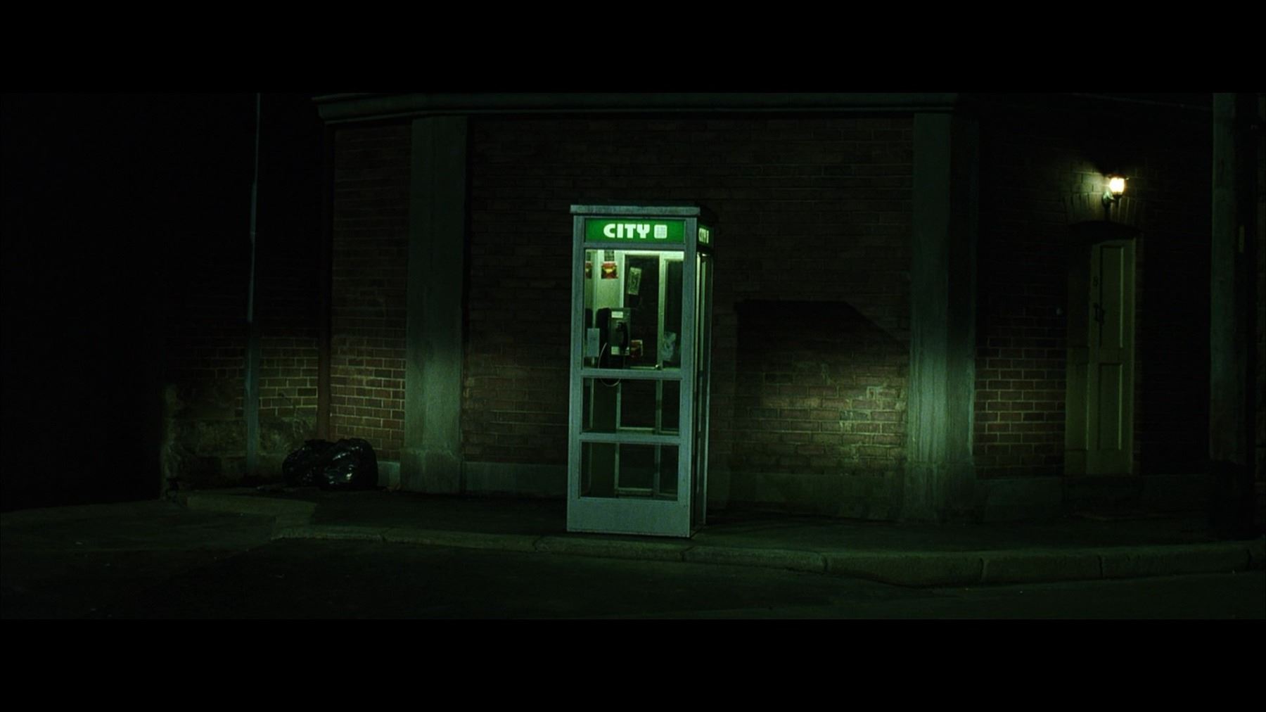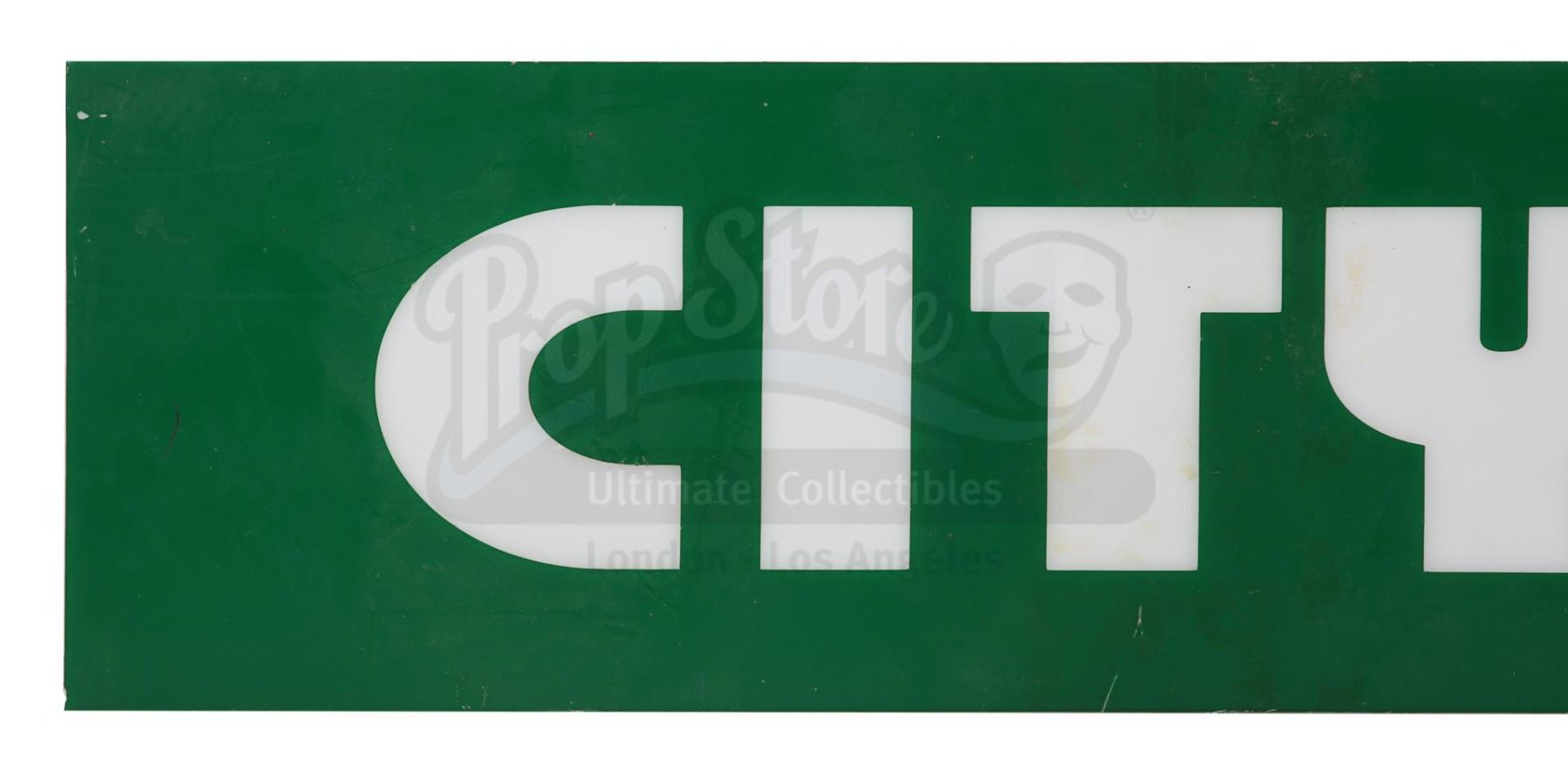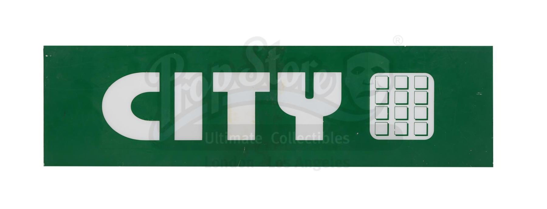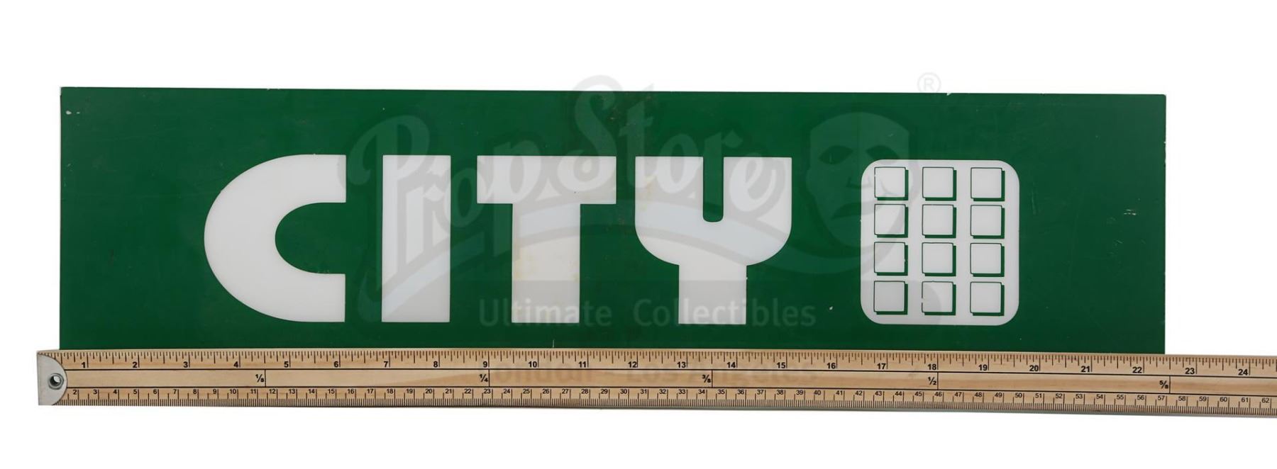 A City phone booth sign from the Wachowskis' sci-fi action film The Matrix. City signs were located around the top of public phone booths, which were used by freedom fighters from the real world to quickly exit the Matrix. Trinity (Carrie-Anne Moss) notably sprinted into a booth to pick up a ringing phone moments before Agent Smith (Hugo Weaving) drove a truck into the structure during the film's opening sequence.