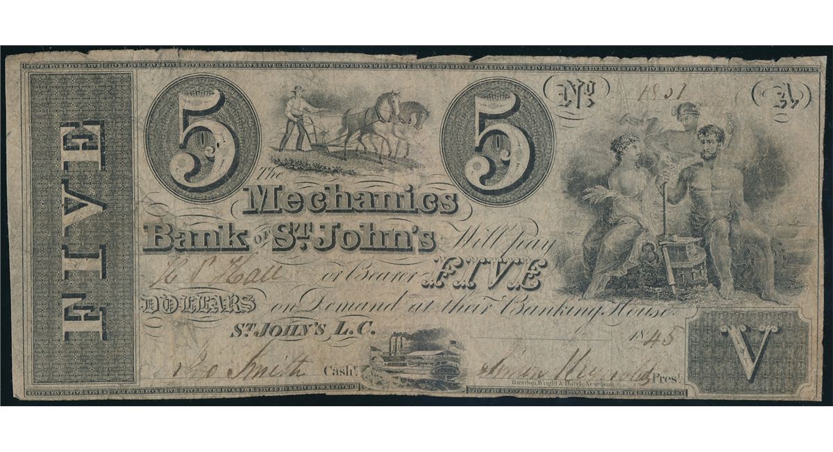 THE MECHANICS BANK OF ST. JOHN'S. $5.00. CH-440-10-02R. A Remainder with spurious signatures, date (1845) and serial number, (1851/A). Pin holes, and a small stamp hinge on back at top center. VG+.