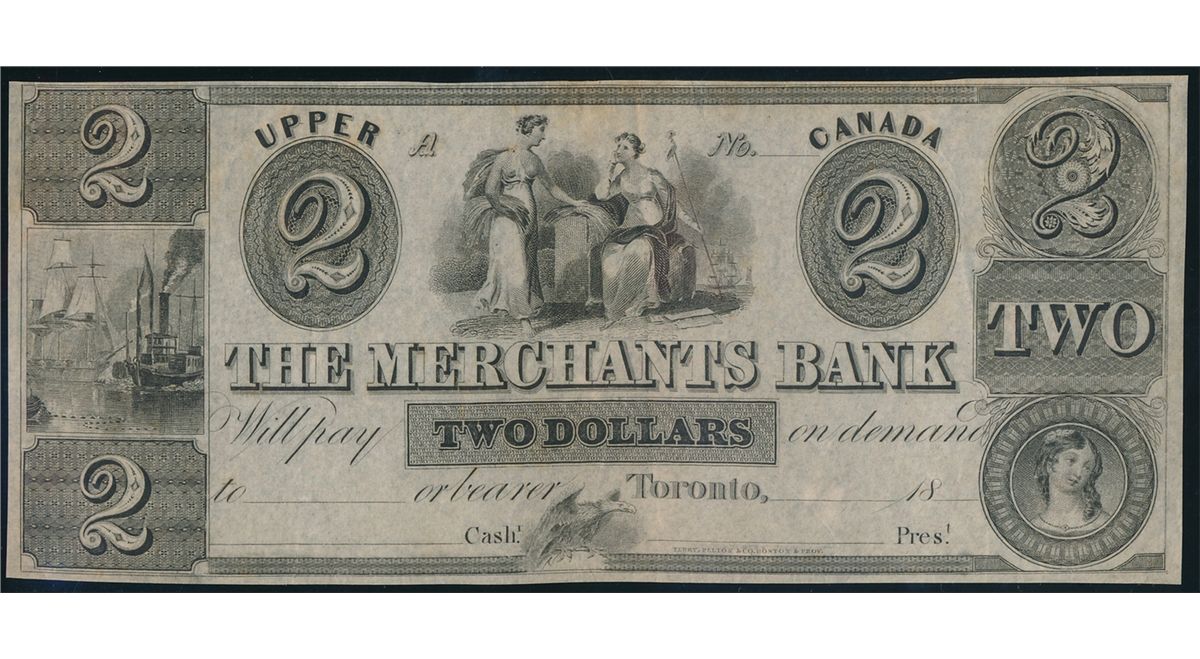 THE MERCHANT'S BANK. Toronto, Upper Canada. $2.00. 1837 Issue. An unsigned, unnumbered Remainder. CH-450-10-06R. Extra Fine.