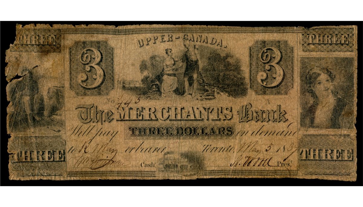 THE MERCHANT'S BANK. Toronto, Upper Canada. $3.00. May 5, 1837. CH-450-10-08. No. 743. Good. Ragged left edge.