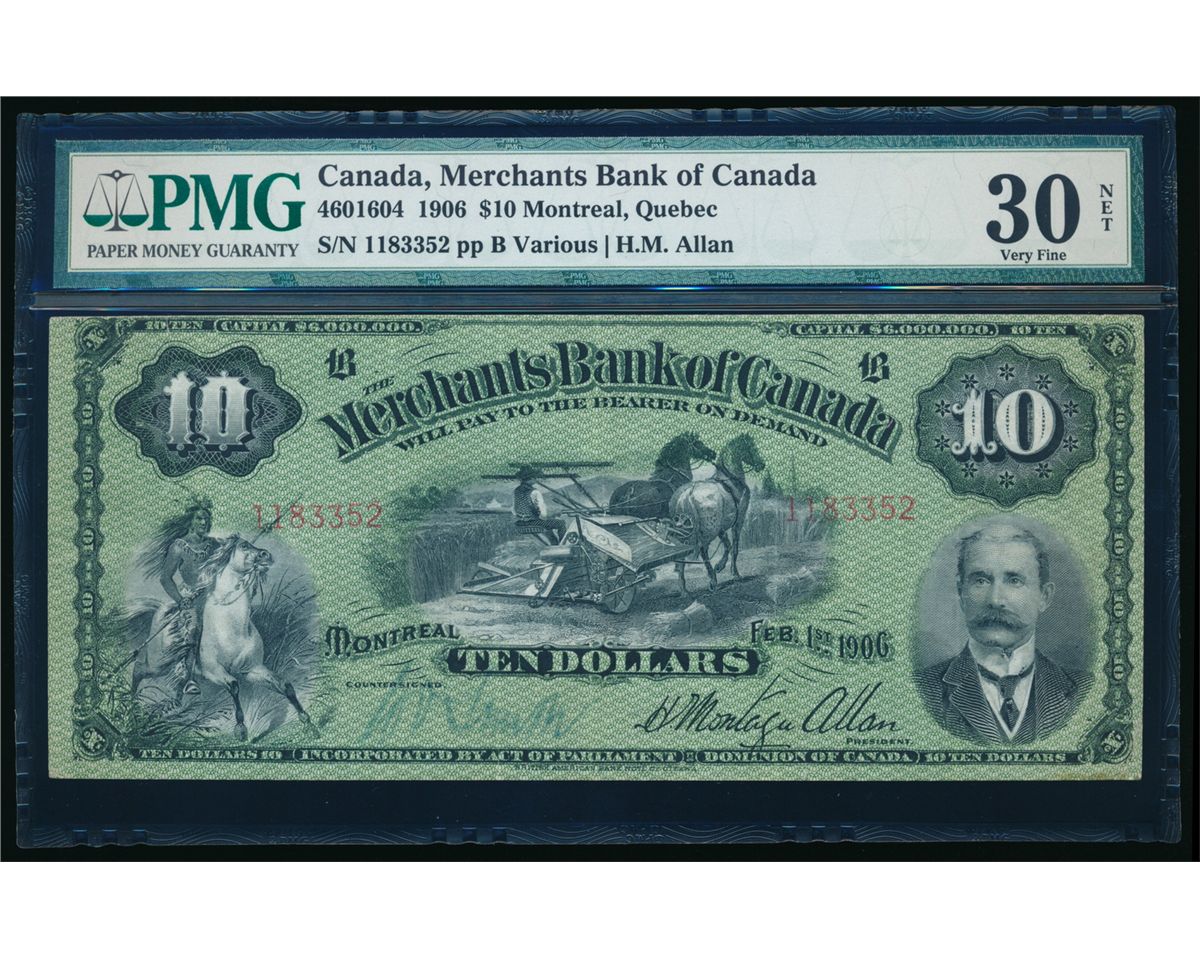 THE MERCHANTS BANK OF CANADA. $10.00. Feb. 1st, 1906. CH-460-16-04. ms-various-Allan. No.1183352/B. PMG graded Very Fine-30 NET. (Note: two tiny margin tears).