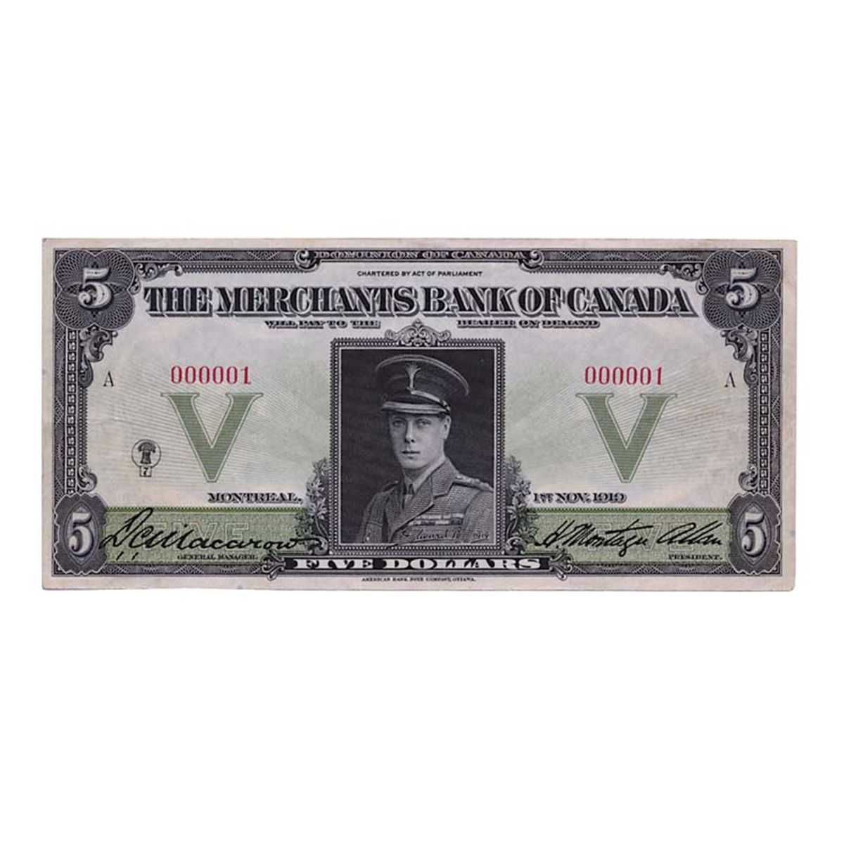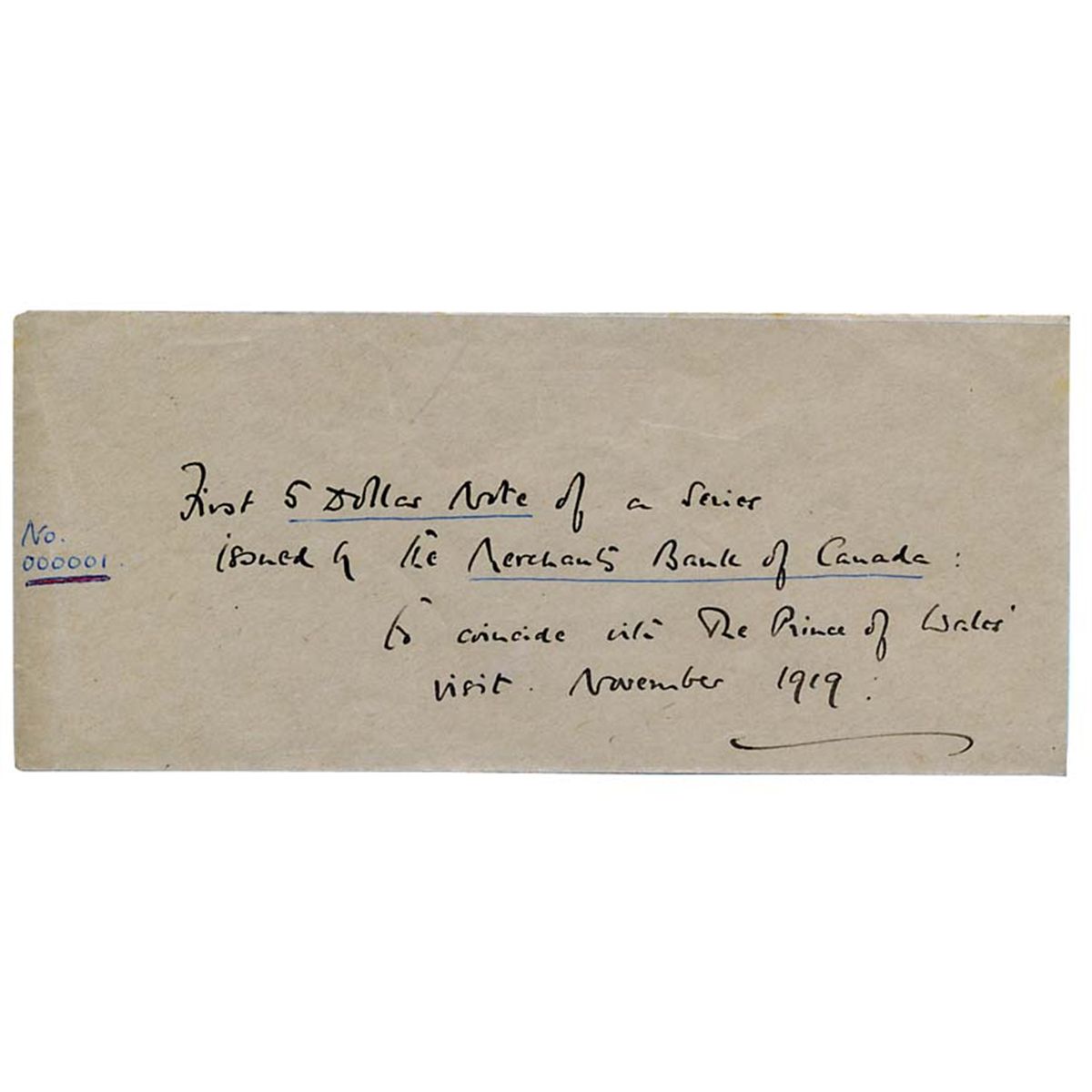 THE MERCHANTS BANK OF CANADA. $5.00. Nov. 1, 1919. SERIAL NUMBER 000001/A. A portrait vignette of Edward VIII at center on front of note. AU or better. Accompanied by a contemporary envelope stating that the note was printed to coinside with a Royal Visit in November of 1919. It is believed that the note was presented during the Royal Visit to the Prince of Wales, who on Jan. 20, 1937 would be crowned King Edward VIII.
