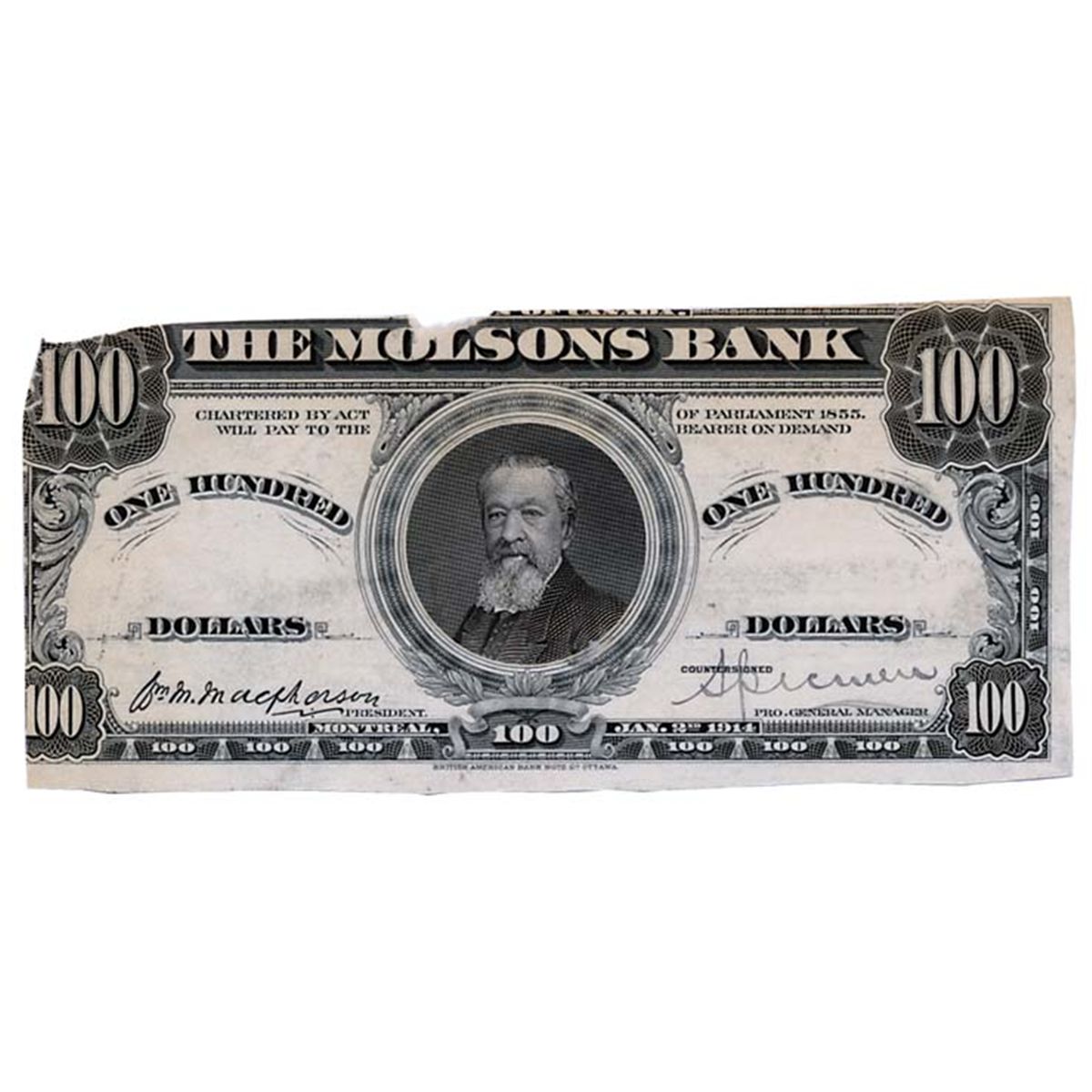 THE MOLSON BANK. $100.00. Jan. 2, 1914. CH-490-34-06P. Black and White Face and Back Proofs on thin paper. The Face has been slightly cropped into the tint at left and top. The Back has been trimmed to the tint. ‘Specimen’ hand written at right signature area. Unlisted in Charlton.