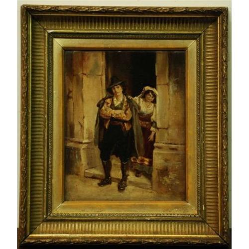 DESCRIPTION: THE MOMENT OF THE EXCUSES. Work of refined medium depicting a lovely scene: a smiling girl on the threshold of an old house rests her hand on the shoulder of a sulky boy that presents her his backs. The brushstrokes are fast and long for architectural representation and thin and meticulous for the character one. The colour range is perfectly balanced between warm and cold colours.