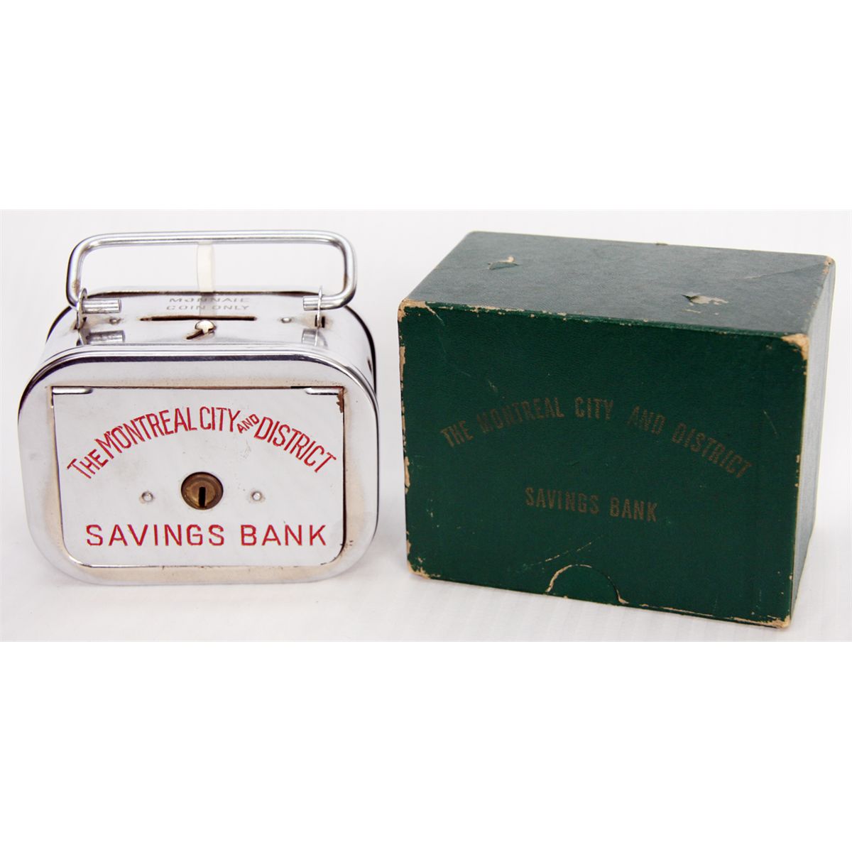 THE MONTREAL CITY AND DISTRICT SAVINGS BANK. A rectangular satchel bank, with rounded corners. Coin slot on top, with French and English. Banknote hole on right side. Handle at top. Key lock, with key present. Serial number 48174. 11cm x 6cm x 8cm. Nickel plated. Maker unknown. No patent information. Also known as the ‘Home Savings Bank’. Original green cardboard box included. EF.