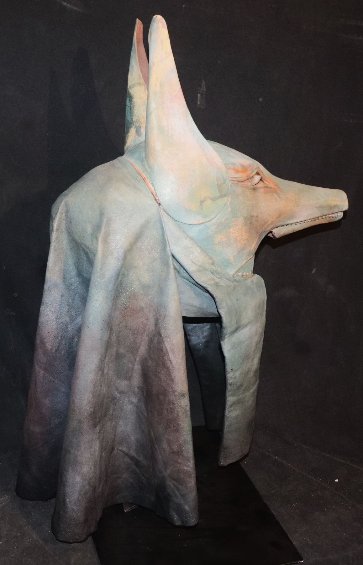 All hand tooled leather ANUBIS full head mask worn by the priest who wraps up IMHOTEP in the Sarcophagus in the opening ancient Egypt scenes. Spectacular Display!