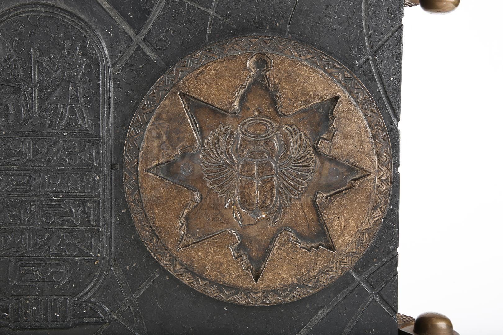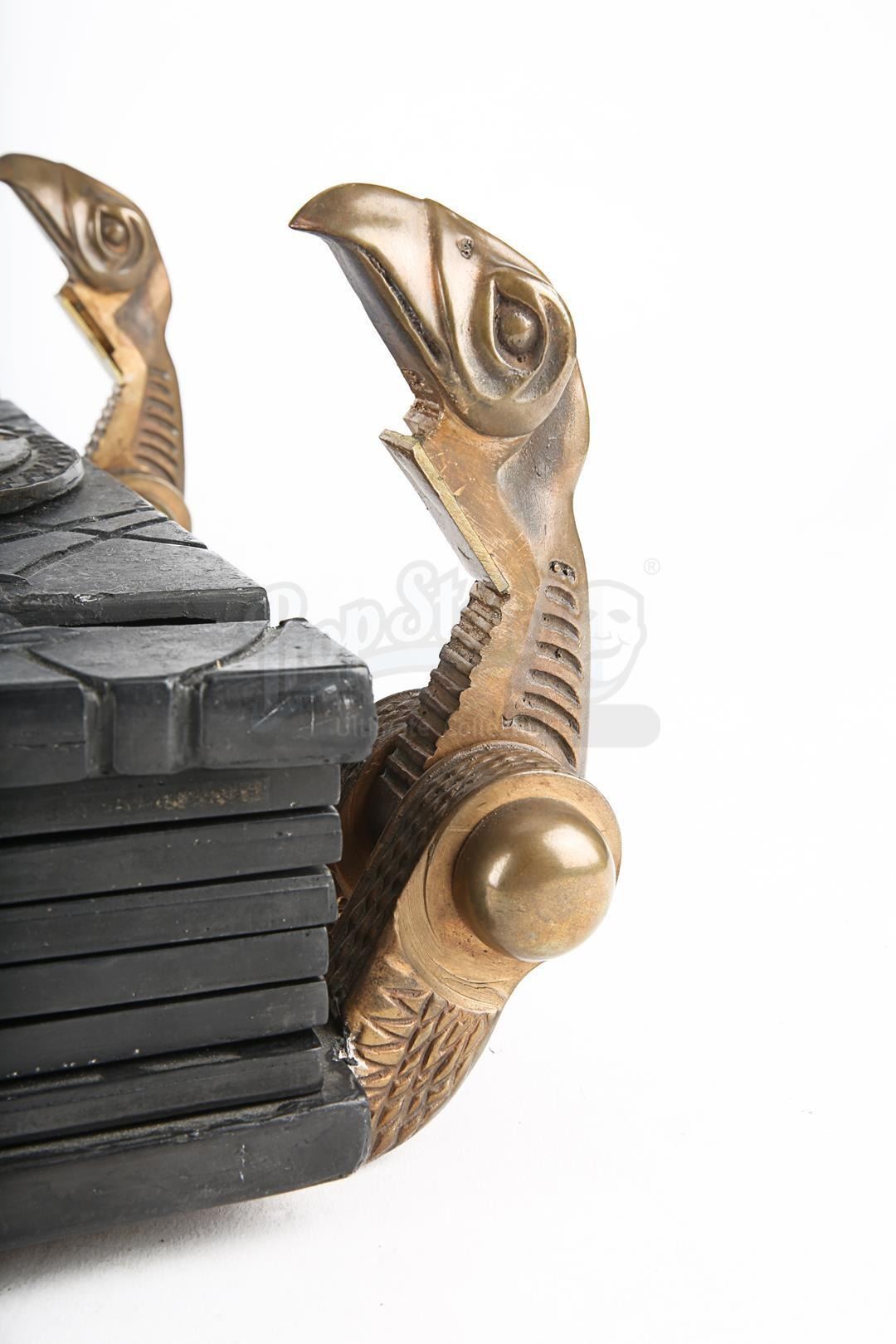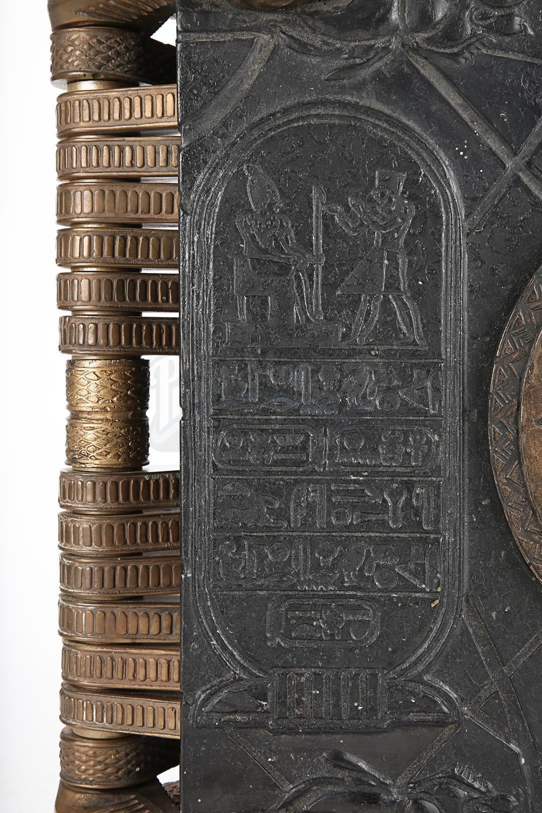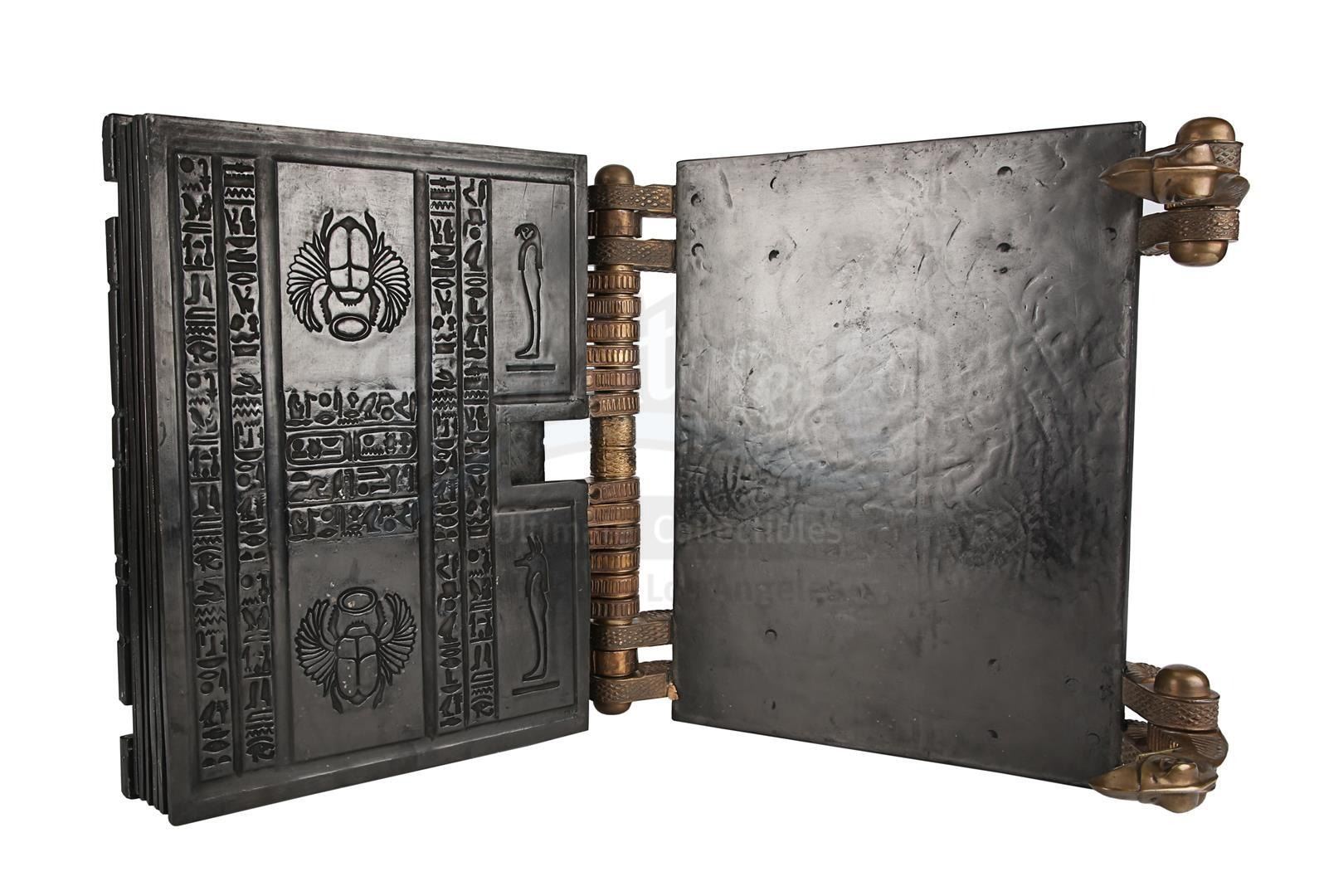 The embellished metal spine displays 12 individual strands attached to each internal page. Designed to hold the front cover in place, four metal vulture-like clasps are inserted into the scarab beetle emblems and are adjoined to uniquely designed hinges. Located within the book are 12 resin tablet pages covered in ornate hieroglyph detailing.