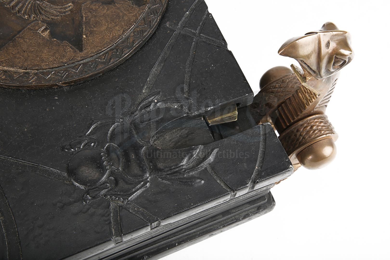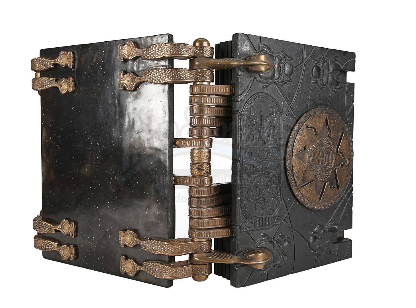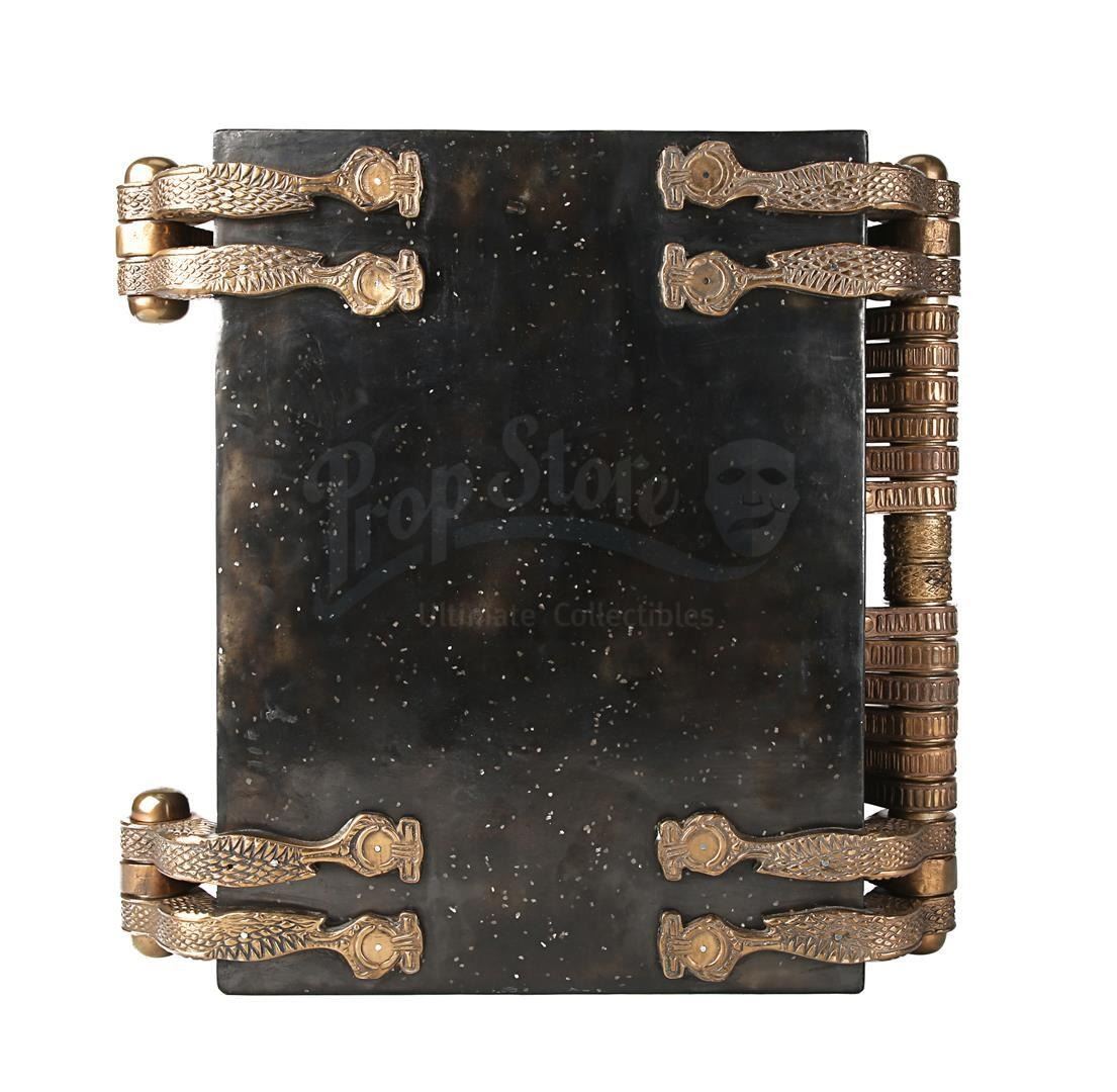 Intentionally distressed for the production, the weighty book exhibits minor wear from use and remains in a fragile state. The front shows minor paint wear and glue remnants. A small hairline crack is present within the lock section, and the back displays light coloured spots. The book is accompanied by a promotional still showing Imhotep holding the book. Dimensions: 37 cm x 37 cm x 12 cm (14 1/2" x 14 1/2" x 4 3/4")