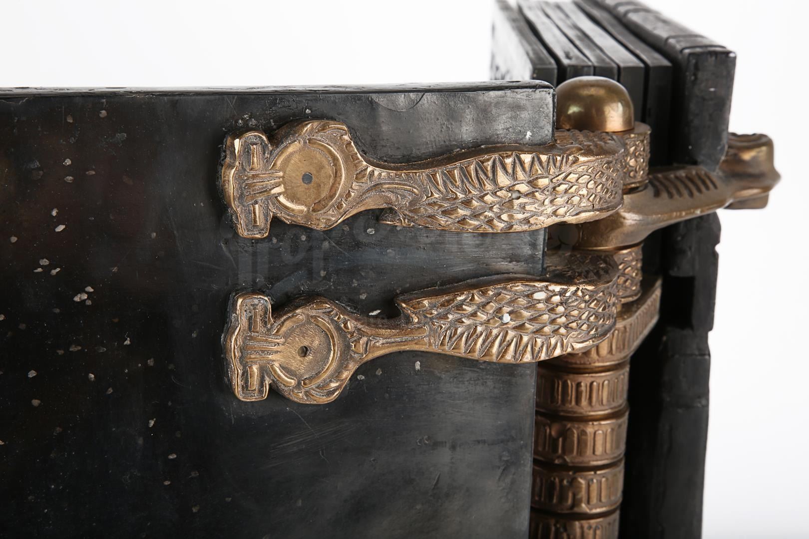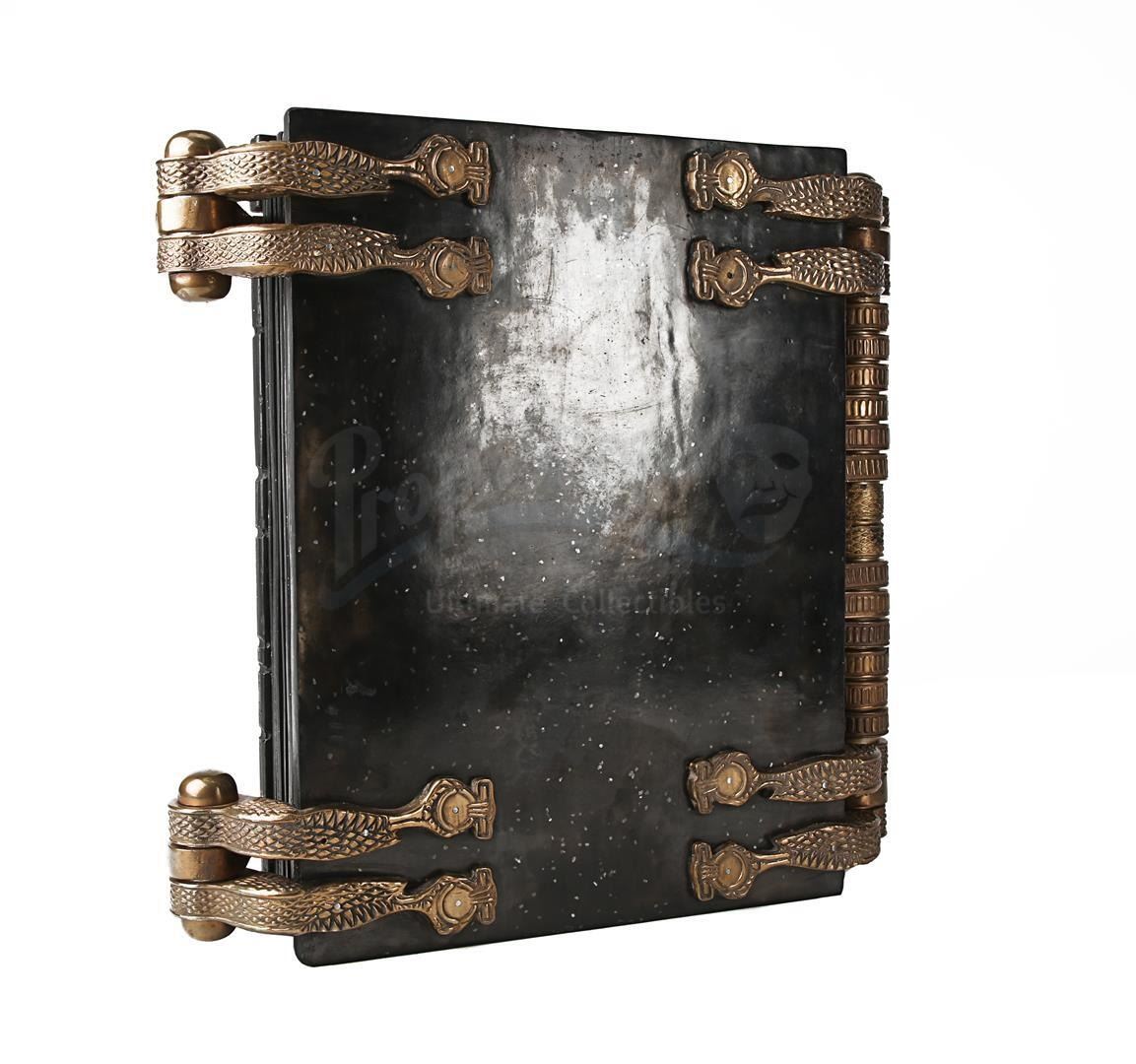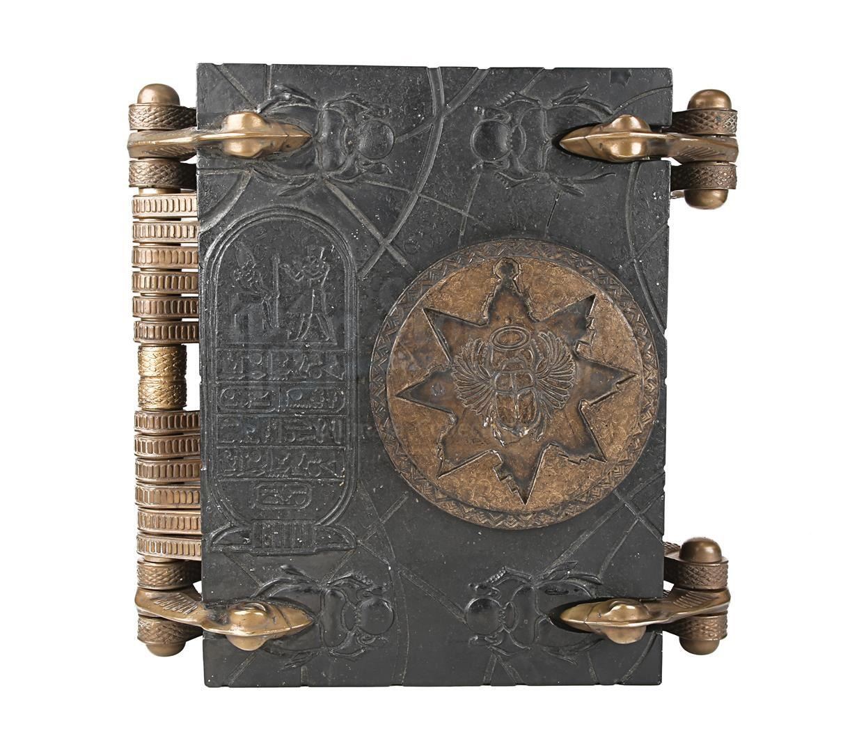 The heavy book is primarily made of resin finished in black to resemble obsidian, and features several intentionally tarnished brass metal components. Intricately decorated, the front cover features sporadic curved lines, an Egyptian hieroglyph insignia on the left side, and raised scarab beetle emblems. Finished in shades of faux bronze, the large circular resin lock section displays an embedded sun-shaped emblem, where a key would have been inserted.
