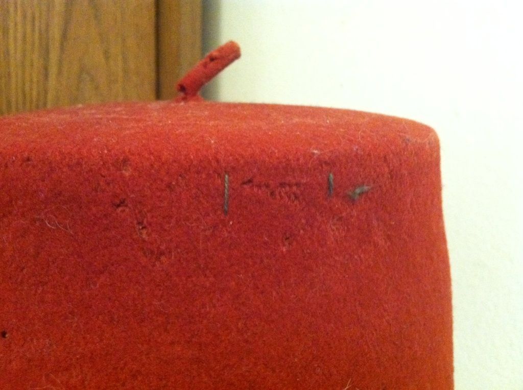 3] There are slight imperfections in the felt that coincide to publicity shots, in tandem position to where the stitches to hold the tassel are. [See Photos].