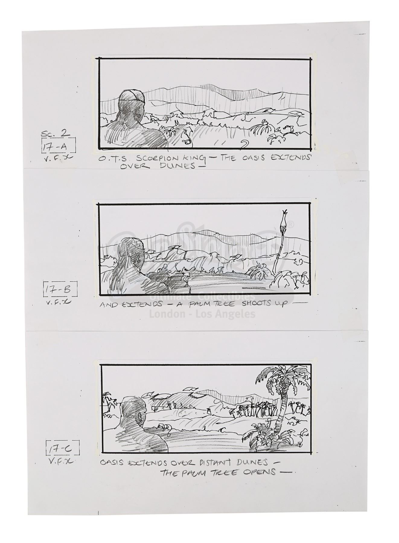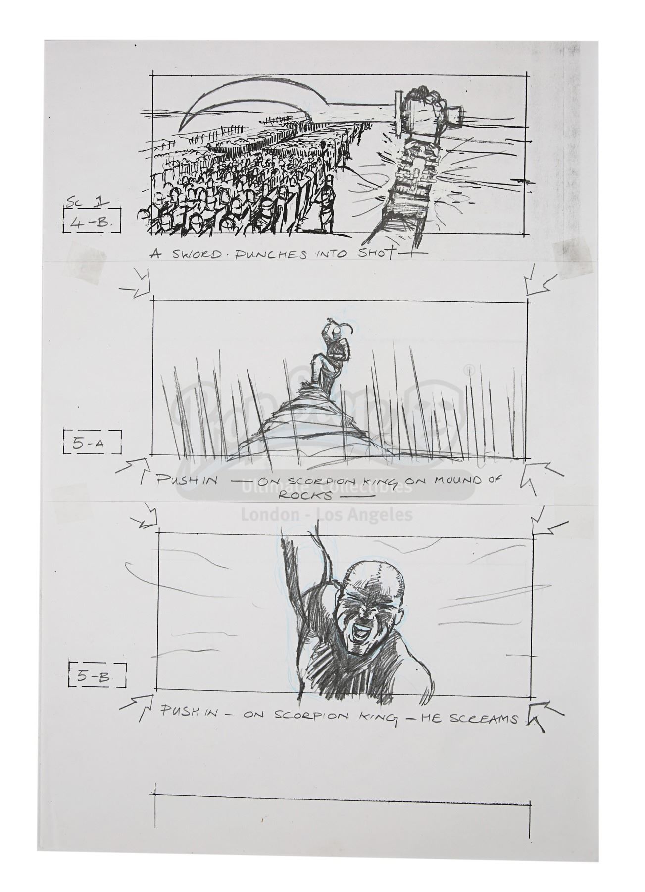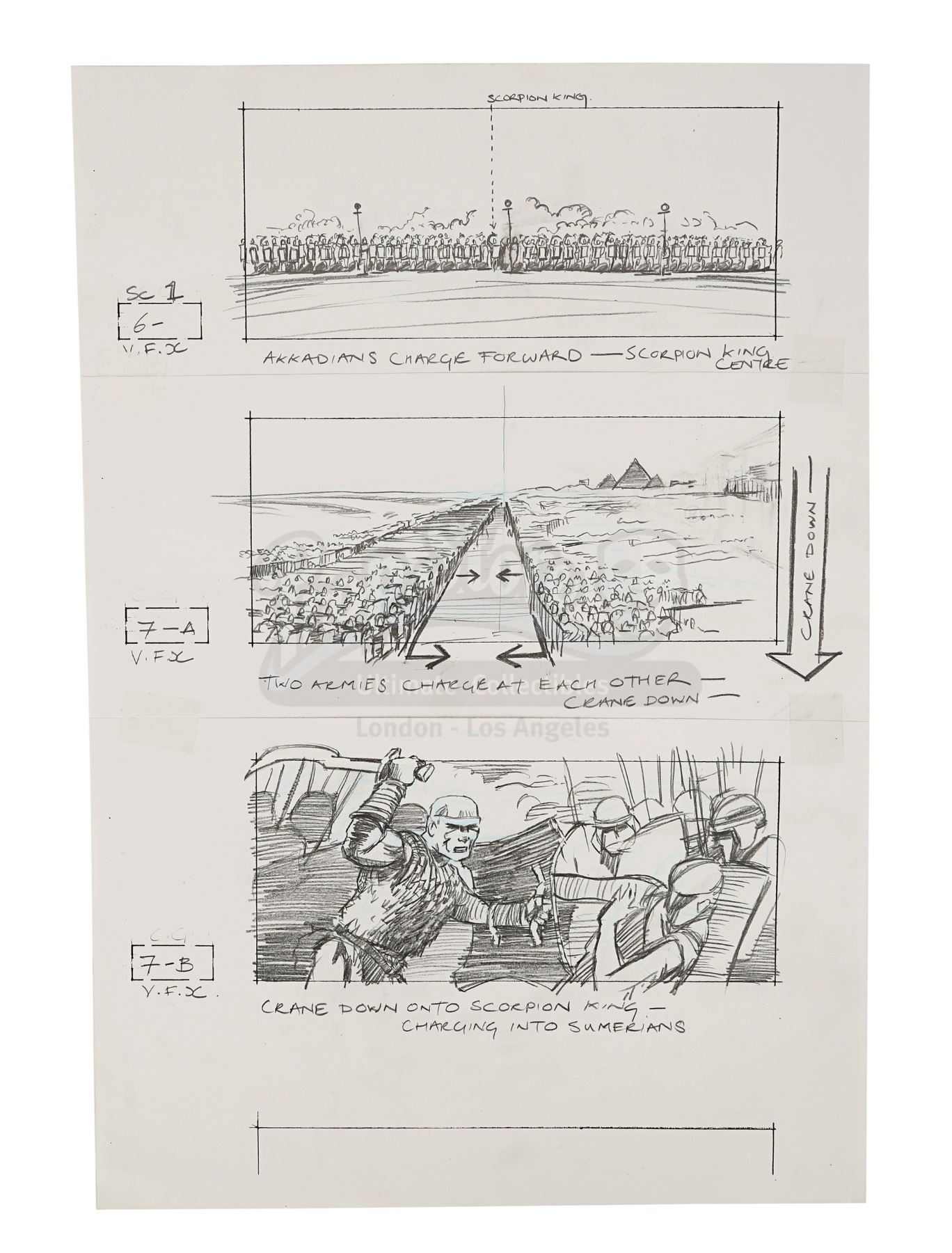 A set of Stephen Forrest-Smith hand-drawn storyboards from the production of Stephen Sommers' action-adventure sequel The Mummy Returns. The set consists of 38 storyboards illustrating flashback scenes, in which the Scorpion King (Dwayne Johnson) fled to the desert of Ahm Shere. The sole survivor of his army's crushing defeat, he vowed to give Anubis his soul in exchange for the power to conquer his enemies.