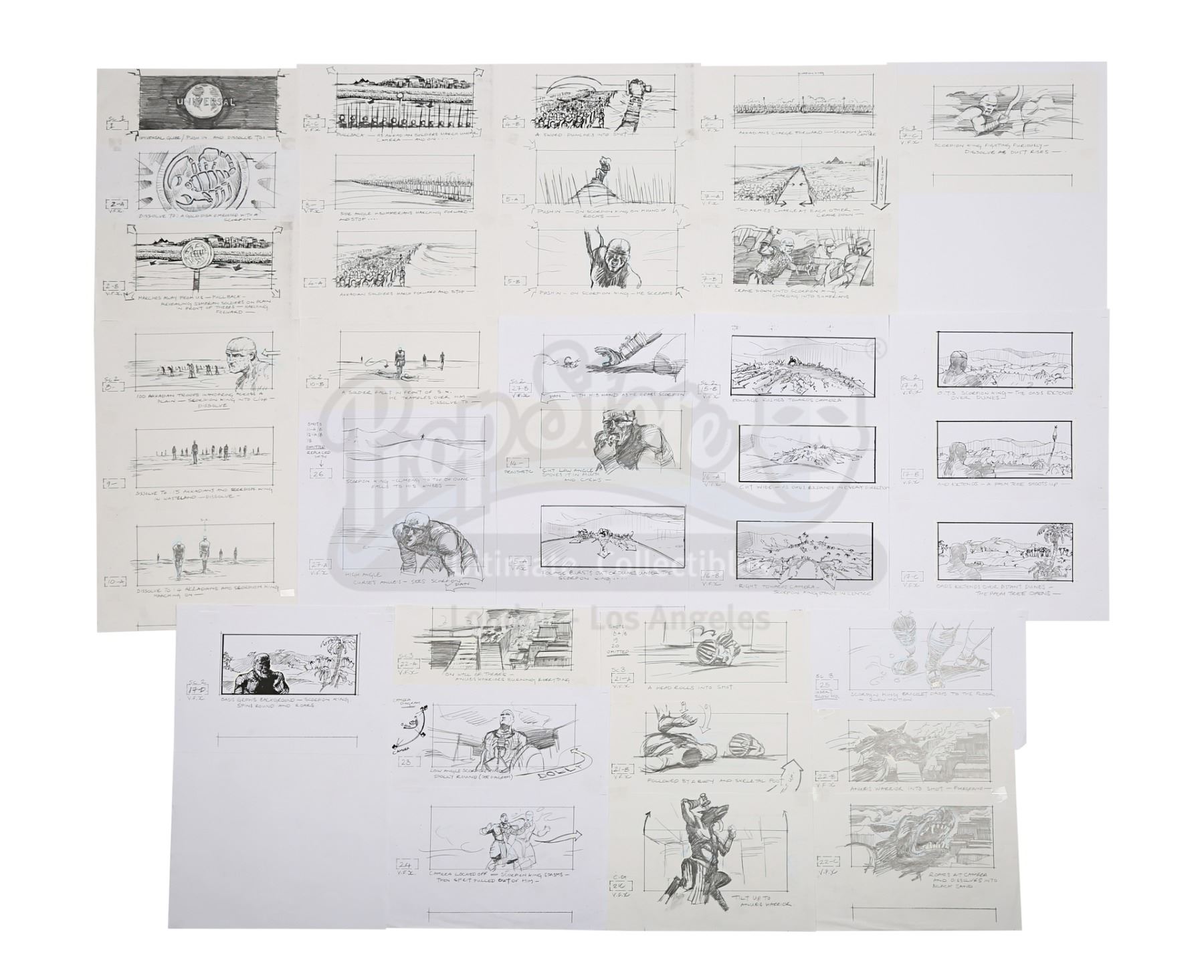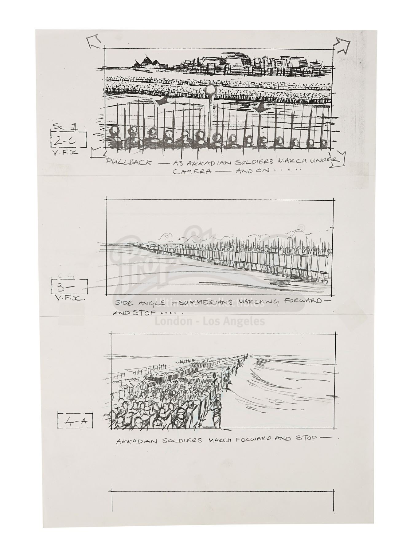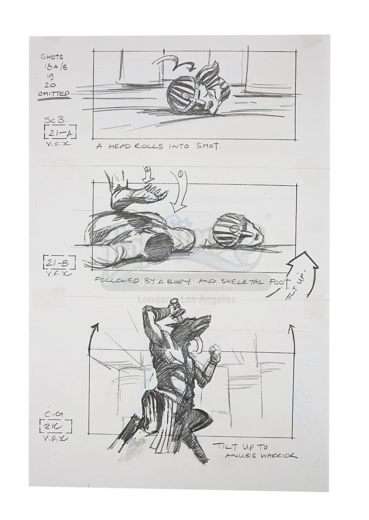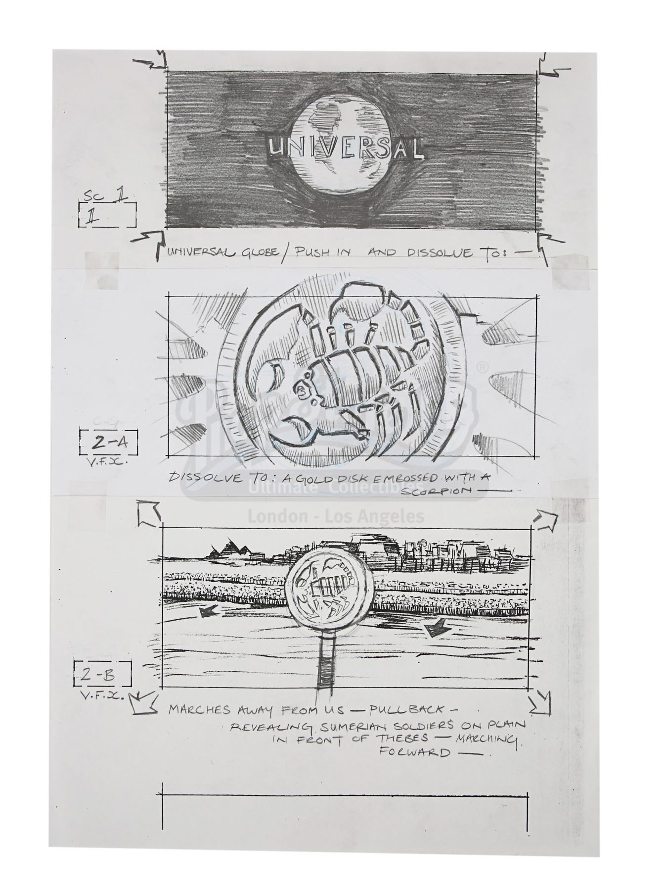 A set of Stephen Forrest-Smith hand-drawn storyboards from the production of Stephen Sommers' action-adventure sequel The Mummy Returns. The set consists of 38 storyboards illustrating flashback scenes, in which the Scorpion King (Dwayne Johnson) fled to the desert of Ahm Shere. The sole survivor of his army's crushing defeat, he vowed to give Anubis his soul in exchange for the power to conquer his enemies.