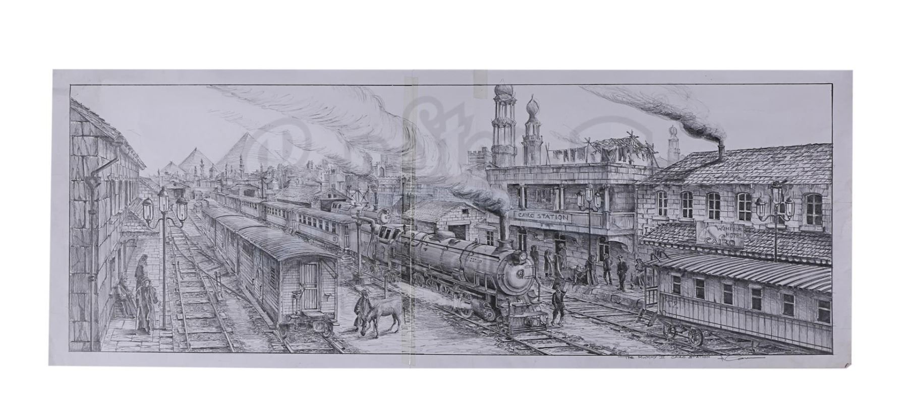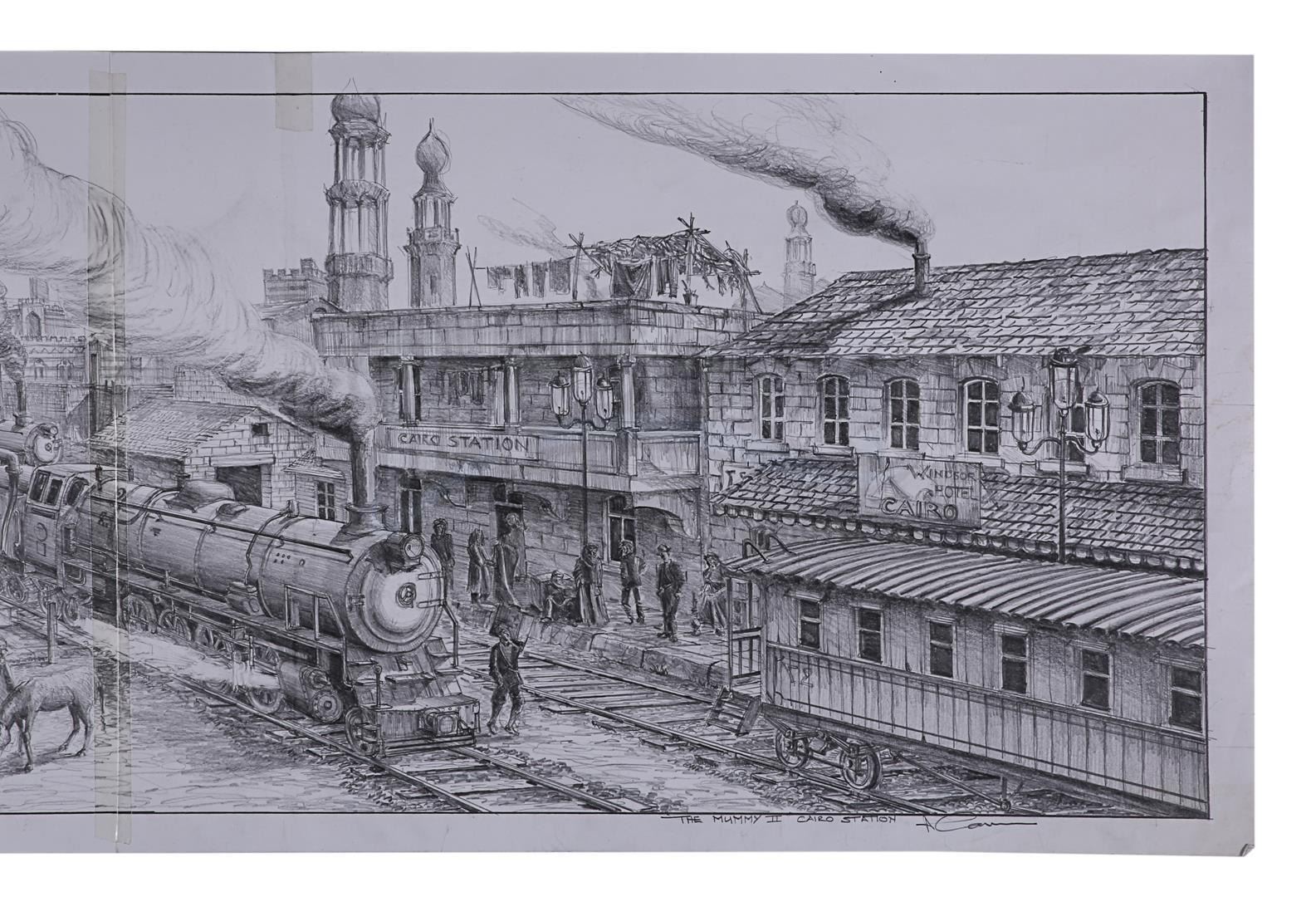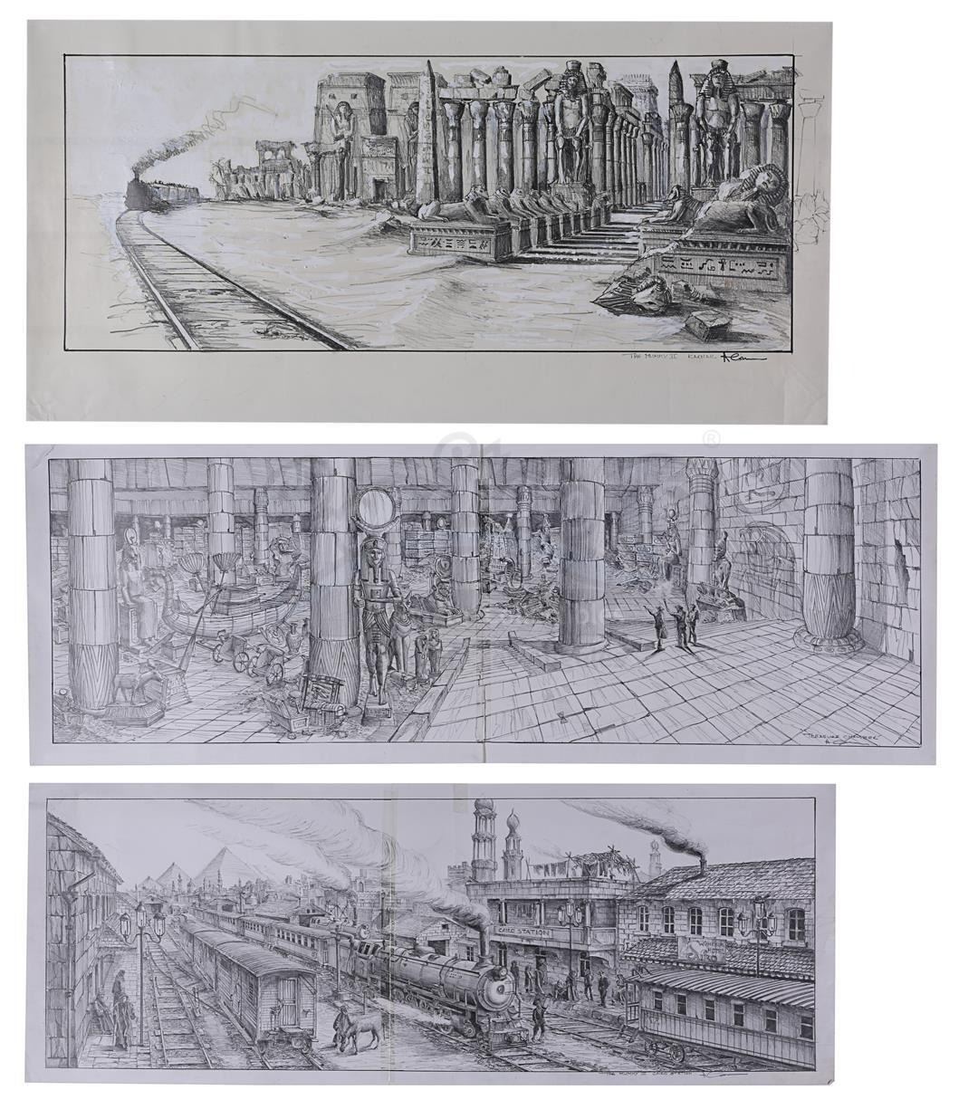 Three Allan Cameron hand-drawn concept artworks from the production of Stephen Sommers' action-adventure sequel The Mummy Returns. These pieces depict Cairo train station, the ancient Karnak ruins where Imhotep's (Arnold Vosloo) party camped on their journey to Ahm Shere, and the atrium of the temple where the O'Connells (Brendan Fraser and Rachel Weisz) discovered the Bracelet of Anubis.