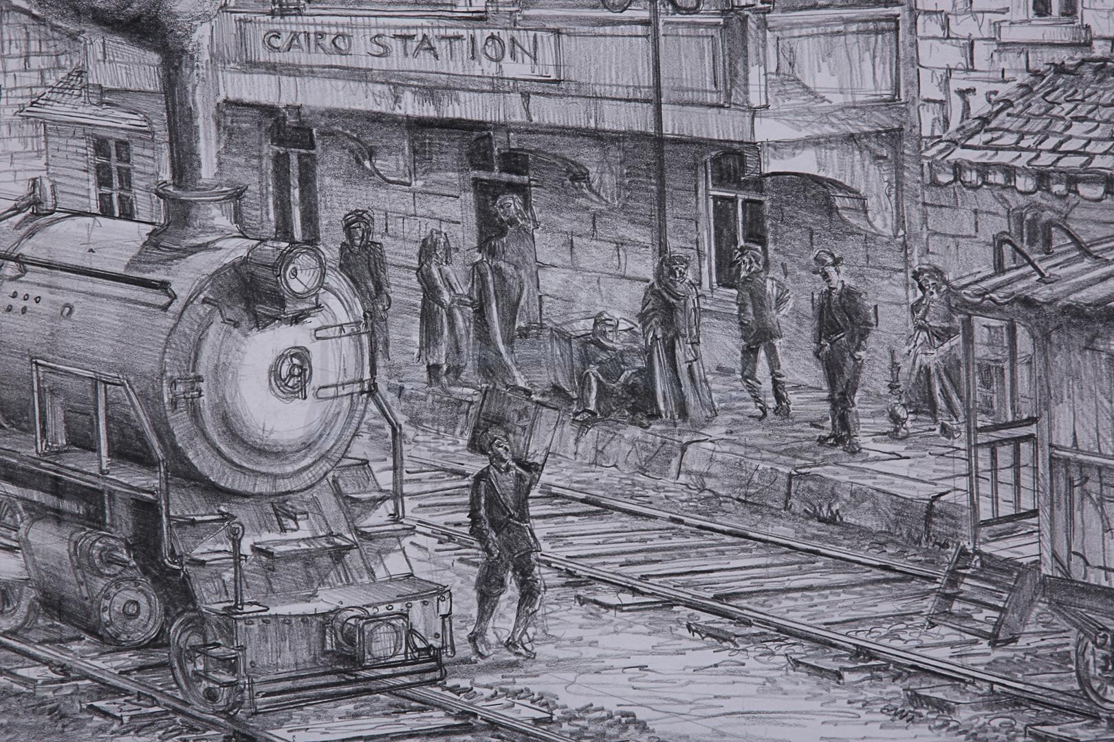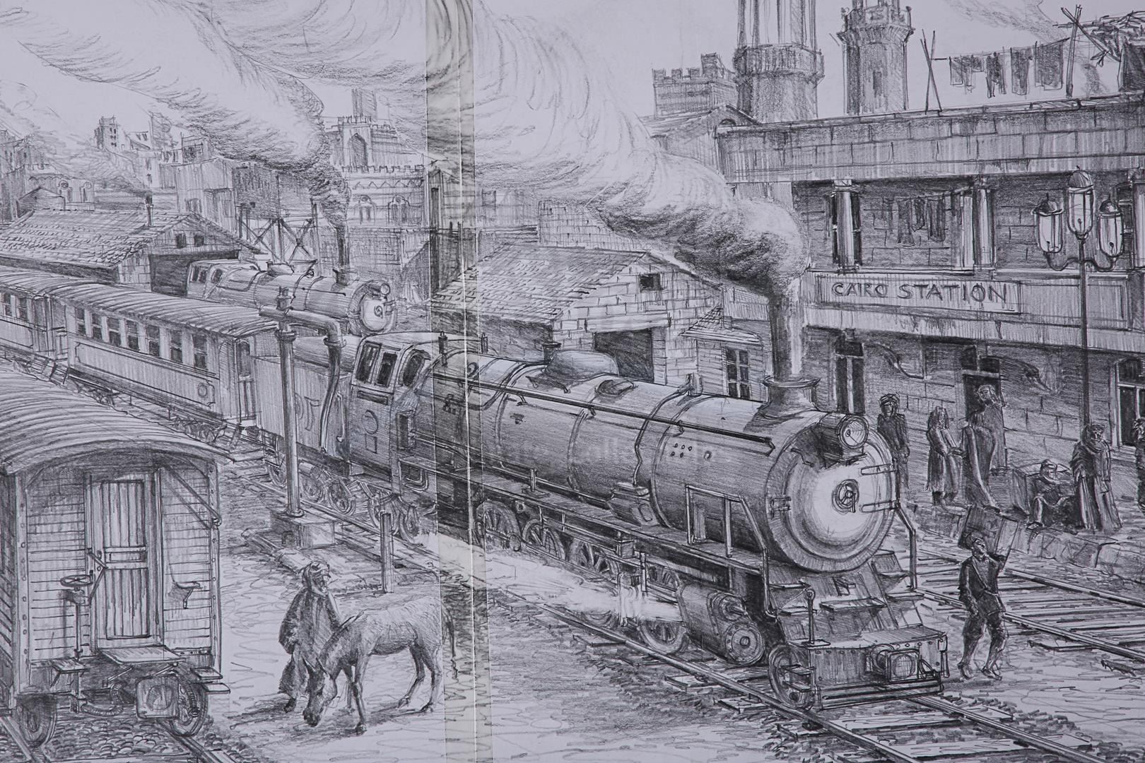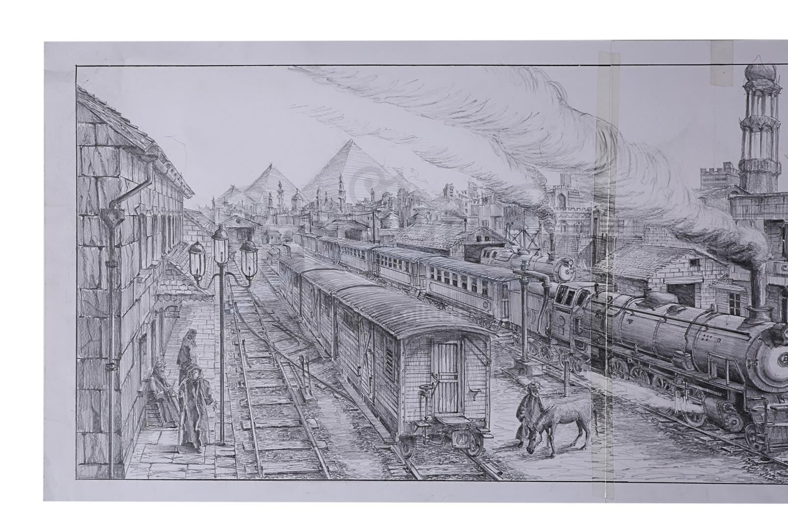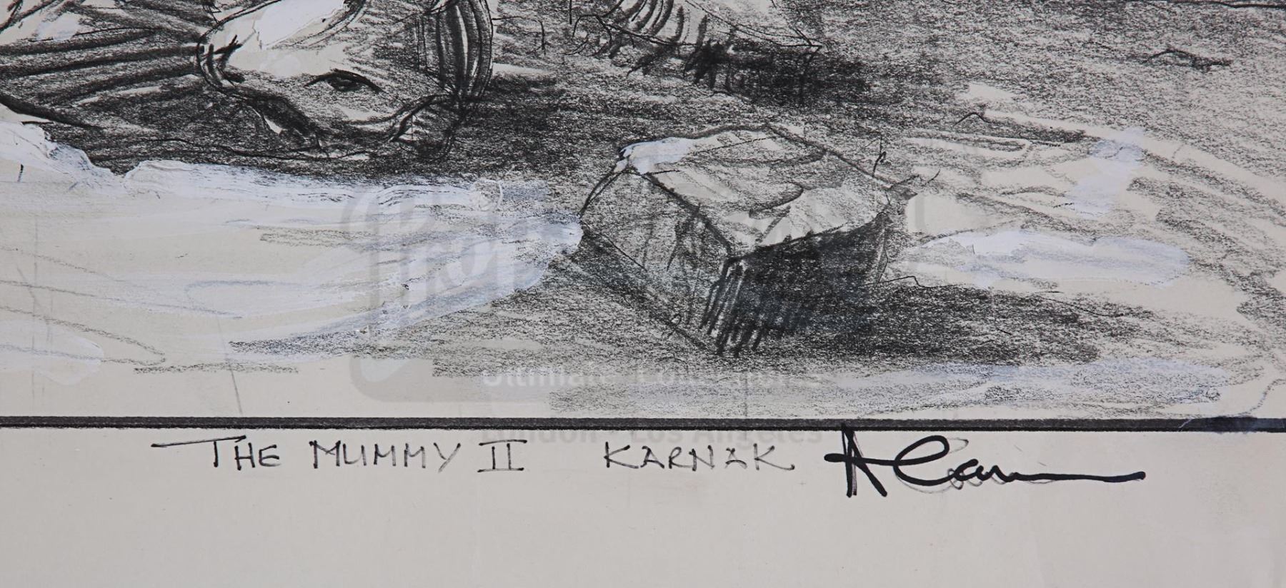Three Allan Cameron hand-drawn concept artworks from the production of Stephen Sommers' action-adventure sequel The Mummy Returns. These pieces depict Cairo train station, the ancient Karnak ruins where Imhotep's (Arnold Vosloo) party camped on their journey to Ahm Shere, and the atrium of the temple where the O'Connells (Brendan Fraser and Rachel Weisz) discovered the Bracelet of Anubis.