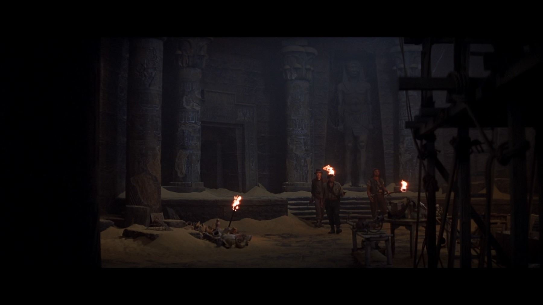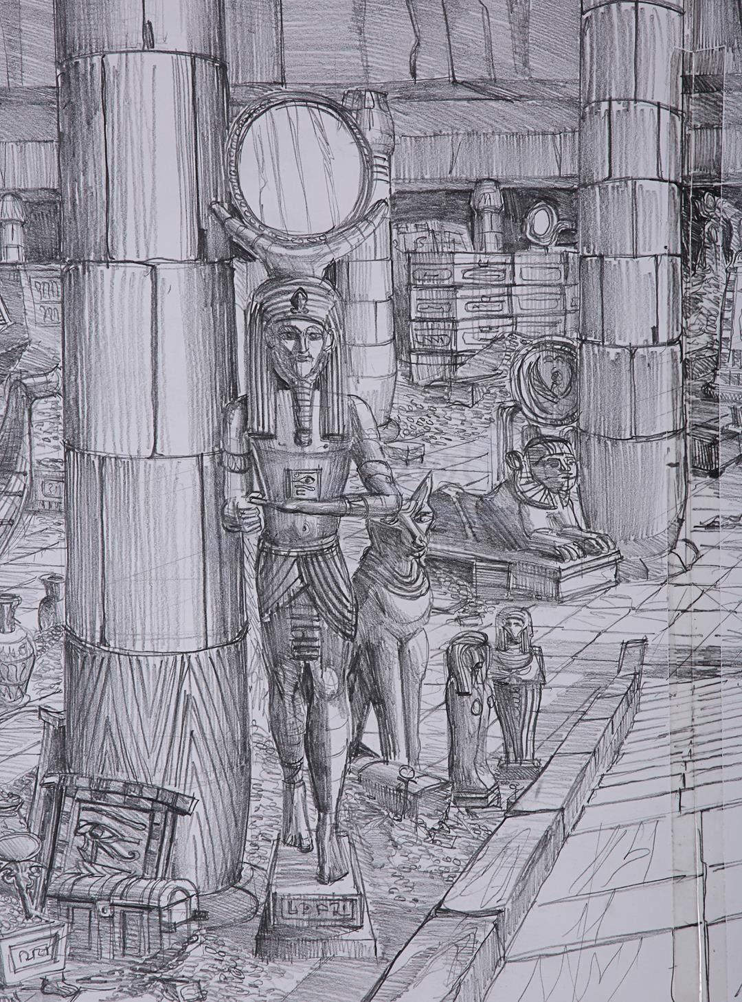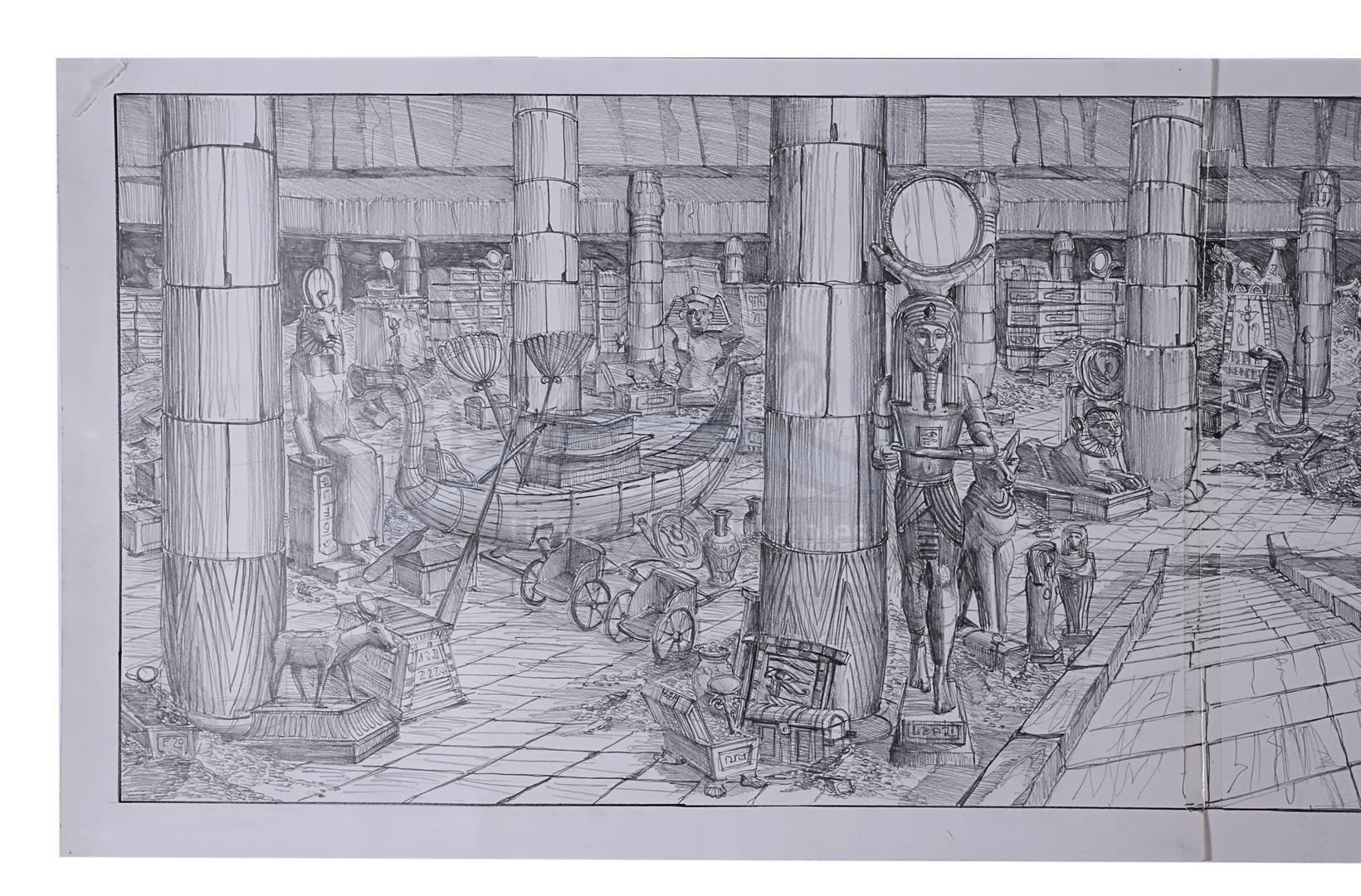 All three concepts are rendered in pencil, with white acrylic paint applied to the drawing labelled "Karnak". The "Cairo Station" and "Treasure Chamber" drawings consist of two pieces of paper joined with tape to form larger sheets. Presented in a rolled condition, the lot displays minor wear from production use, including creasing, smudge marks and folded corners. Dimensions (largest sheet): 56 cm x 110 cm (22" x 43 1/4")