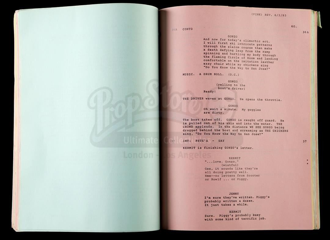 This lot consists of a rare, glossy production-made colour paper cover playbill applied over a pre-existing playbill from 1983, as well as an original copy of the screenplay featuring muticoloured pages to note revisions and a black-and-white promotional photo featuring Henson with cast and crew members. The lot is in good overall condition with staining on the bottom of the playbill from production and minor tears to the screenplay. Dimensions: 28 cm x 35.5 cm x 5 cm (11" x 14" x 2")