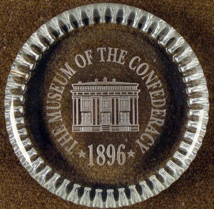4" ROUND "THE MUSEUM OF THE CONFEDERACY-1896" GLASS PAPER WEIGHT * * NICELY ENGRAVED-SCALLOPED EDGE-EXCELLENT CONDITION