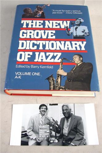 THE NEW GROOVE DICTIONARY OF JAZZ Volume One A-K, Edited by Barry Kernfeld, together with a photograph of Dizzy and another gentleman seated next to the book, 2 pieces