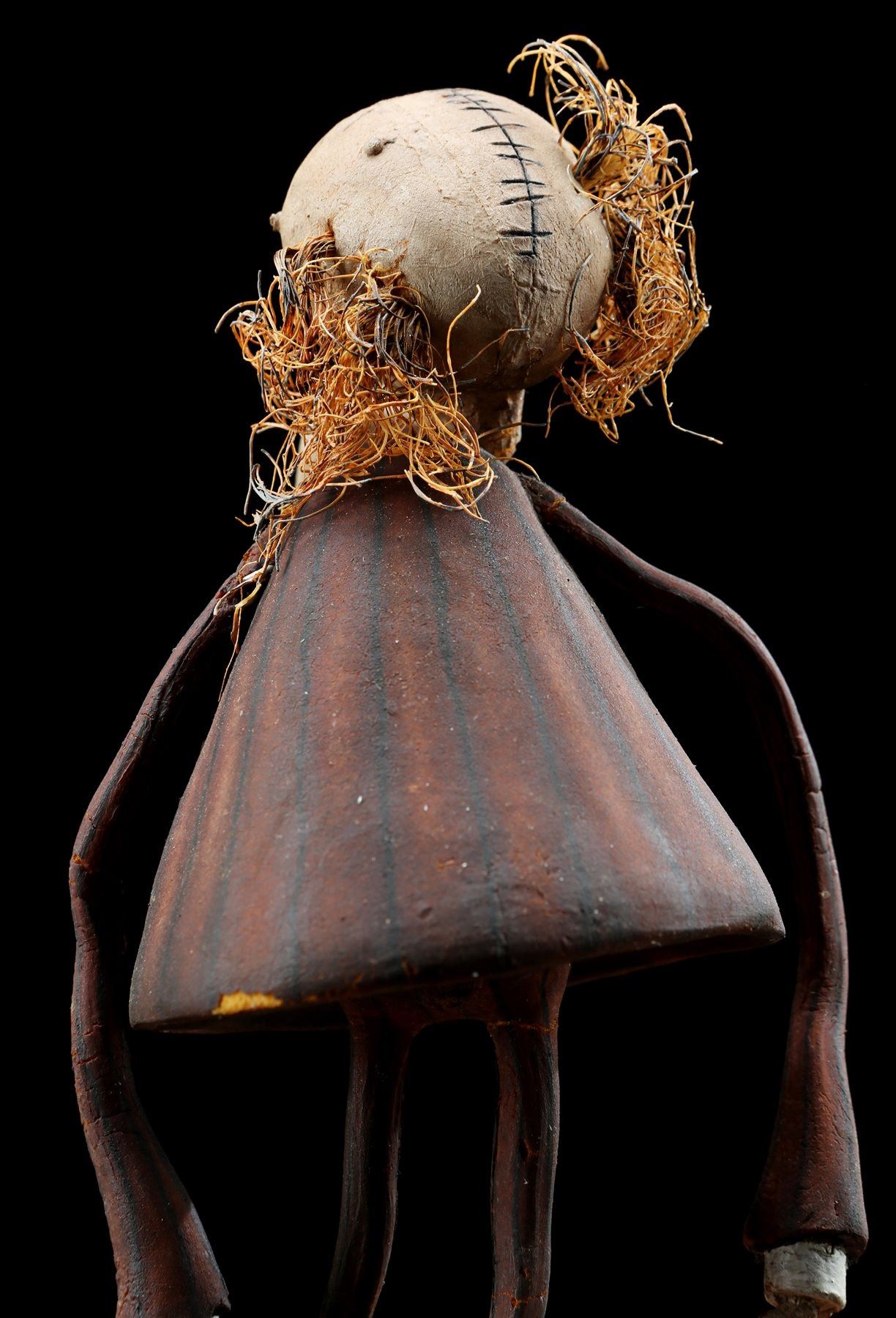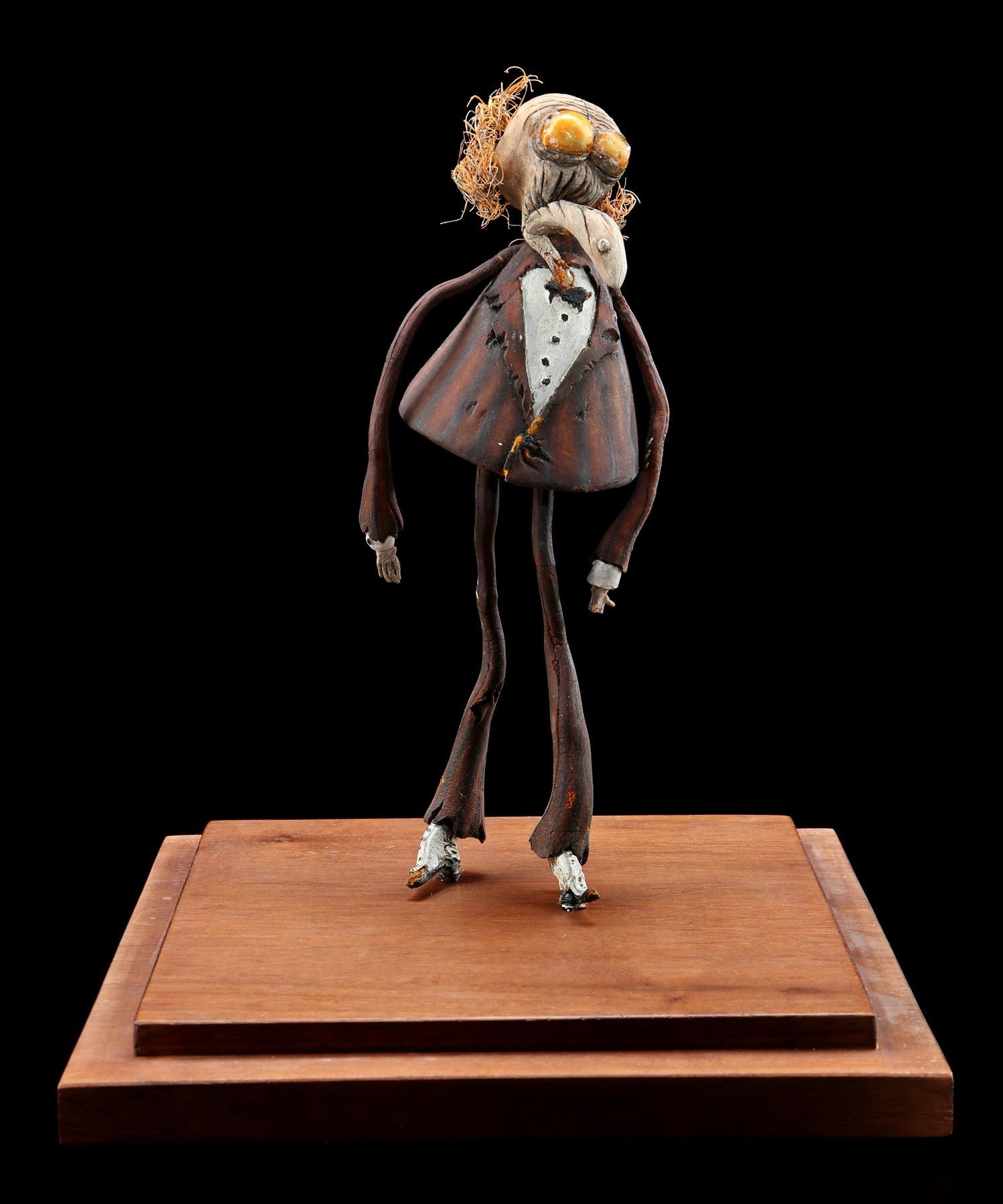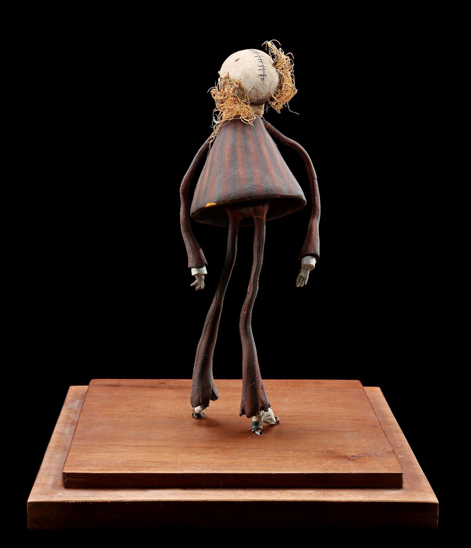 The puppet stands on a simple wooden base and features wires protruding from the heels of its feet, which anchor it to holes in the base. Showing wear to the foam which has hardened and cracked due to age, the saxophone player is missing fingers on its left hand. Although fragile, the puppet remains in fine condition. Dimensions (puppet): 9 cm x 10 cm x 26.5 cm (3 ½” x 4” x 10 ½”); (on base): 24 cm x 24 cm x 28 cm (9 ½” x 9 ½” x 11”)