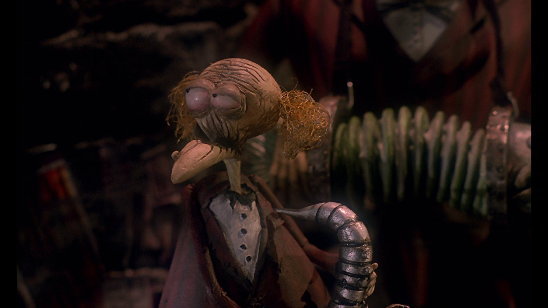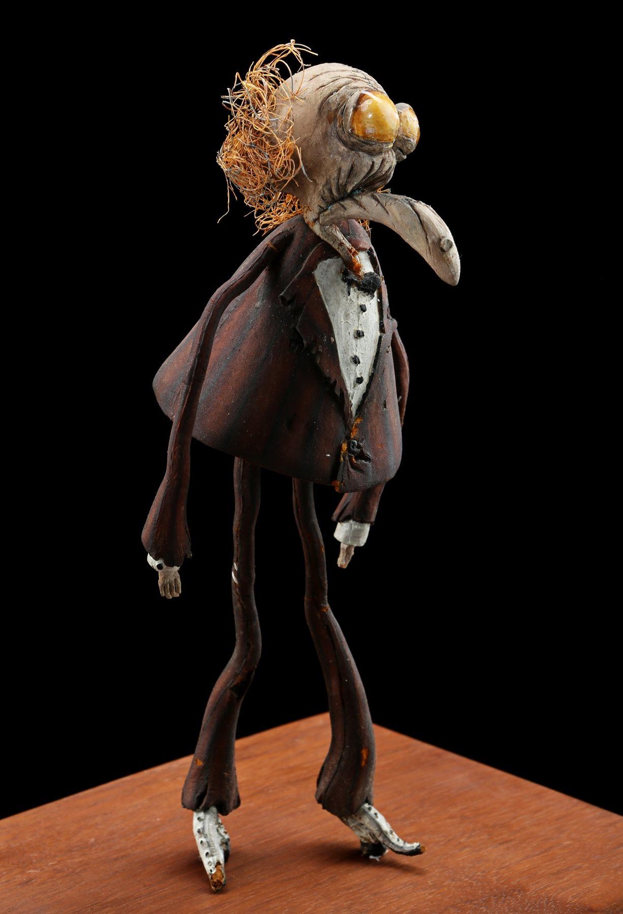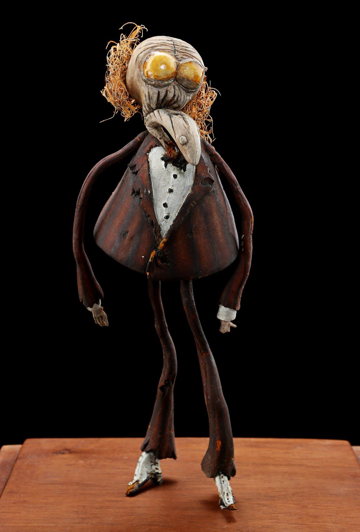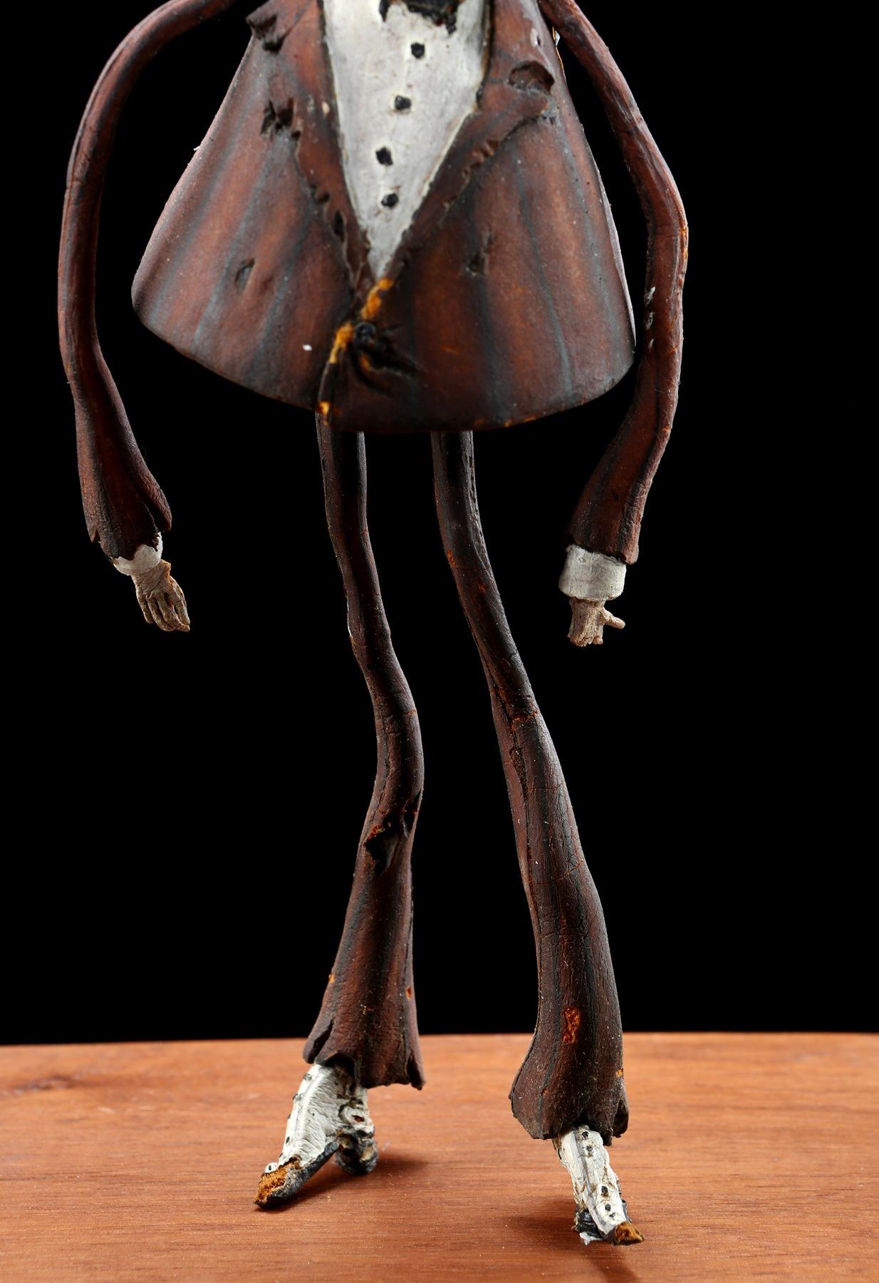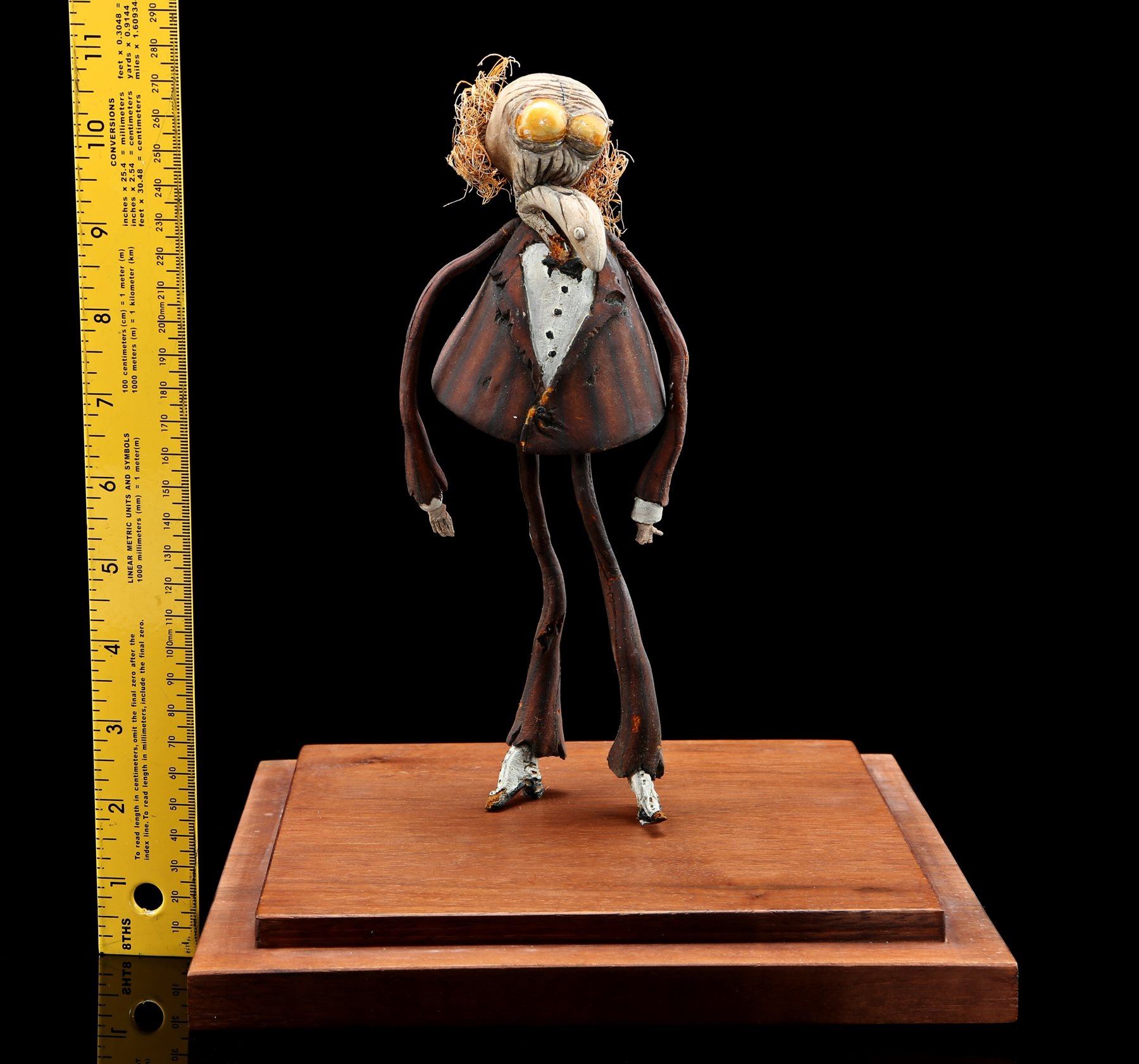 The puppet is made of foam over a wire animation armature, and includes dried moss threaded through the scalp to resemble hair. The puppet features an elongated chin with a large wart, a bell-shaped torso and long slender arms and legs. It is cast with an integral black-striped burgundy suit with a white button-up shirt and white shoes.