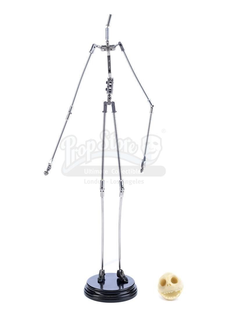 This lot consists of a full-body metal armature, custom-made for the production, featuring both hinge and ball-and-socket joints at all major points of movement (including the shoulders, elbows, knees, and hips) with a black wooden stand. The Jack puppets used in production sustained a lot of wear and armatures were regularly repaired and reused, with components interchanged, throughout filming. This armature comes from the collection of a key crew member who installed an unpainted white resin Jack Skellington head for display at the end of production. The lot is in good overall condition with some signs of wear, including scuffing on the base. Dimensions: 30.5 cm x 12.25 cm x 9.75 cm (12" x 4 3/4" x 3 3/4")