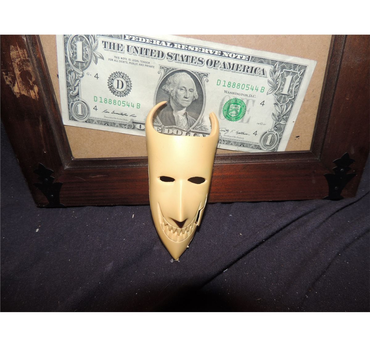 This is a production made Lock Halloween mask from THE NIGHTMARE BEFORE CHRISTMAS. Has a crack in cheek, and a chipped horn. This is marked with an X from production.