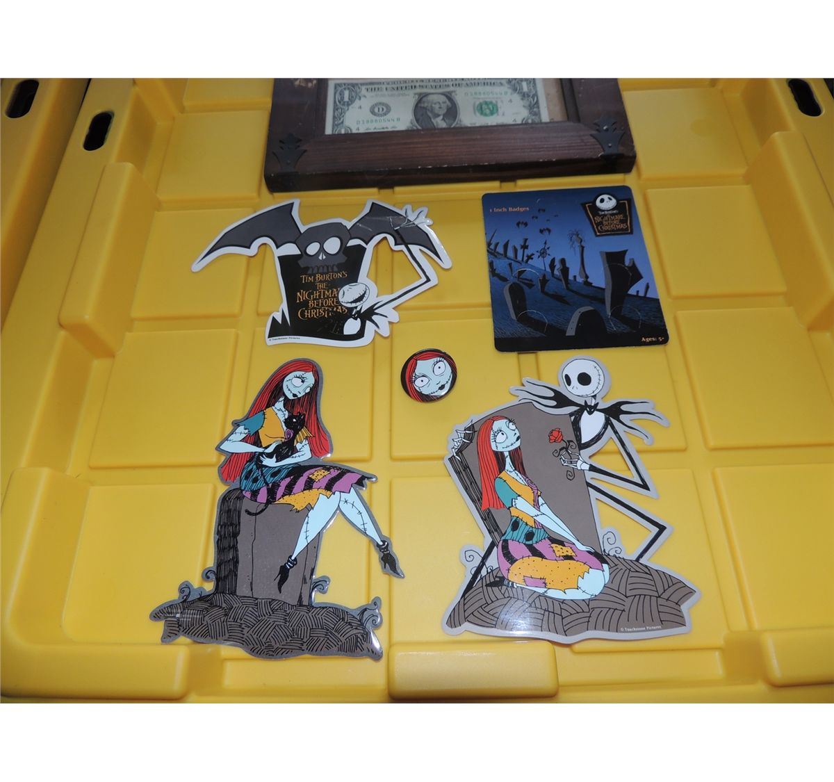 These are vintage promo stickers and buttons from the 10th anniversary of THE NGHTMARE BEFORE CHRISTMAS [AKA 2003]. This Sally lot contains both Sally sticker types, The Title sticker, and a button with card.