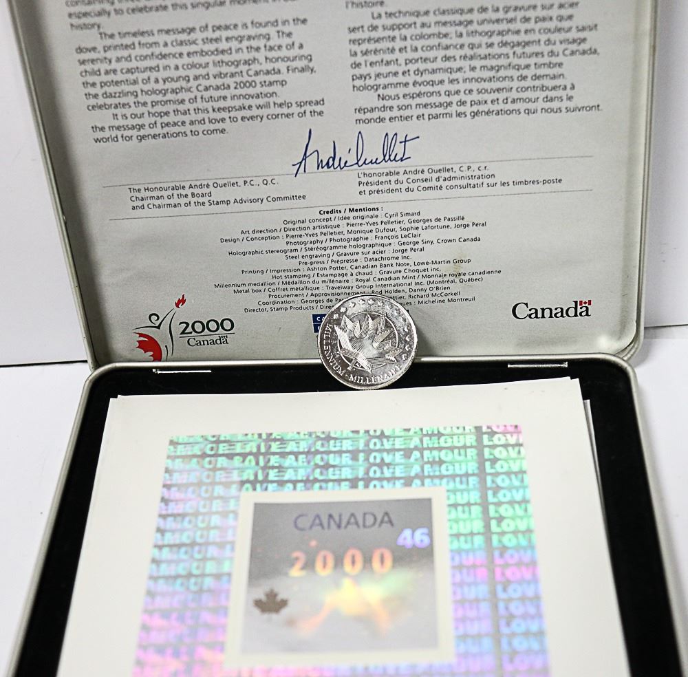 3 UNIQUE STAMPS AND DOVE COIN IN METAL PRESENTATION TIN WITH COA CANADA POST