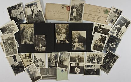 A charming ca. 1918 Jefferson County, Tn. snapshot family photo album showing a close connection with the local black population through many affectionate and candid photos. Many of these images were taken while the family played during many hazy summer afternoons with their black family friends. Included in the album are those of a white girl with black boy holding a Fourth National Confederate flag; a black boy with white girl in a pumpkin patch; blacks and whites mocking the camera; a black man milking a cow; an amazing swimming hole picture with one black boy pointing towards a white child by using his middle finger, all this, along with boys using long sticks as personal appendages. There are many more mixed race photos in the album not mentioned but just as interesting as those above. Over one hundred photos housed in a period black bound 5 5/8" x 7 5/8" album with several loose letters written by the children and a lock of blond hair. A great piece of Southern history!