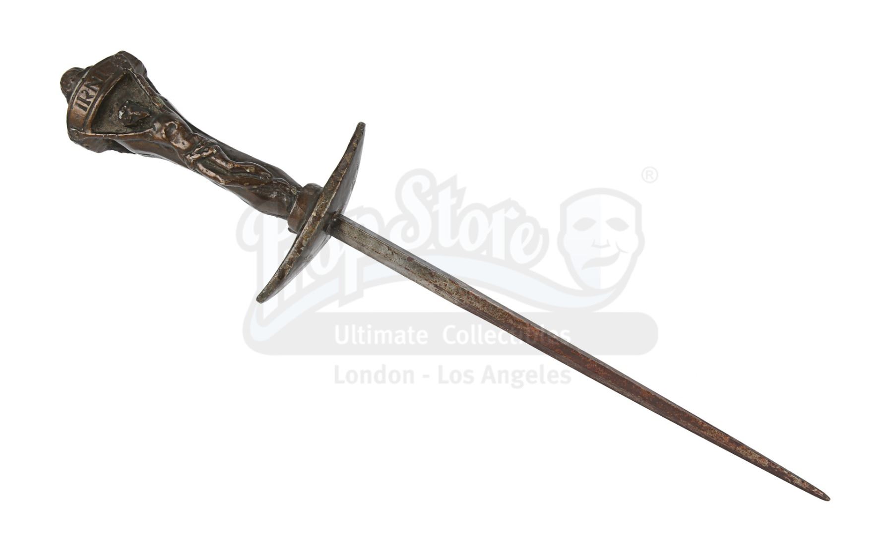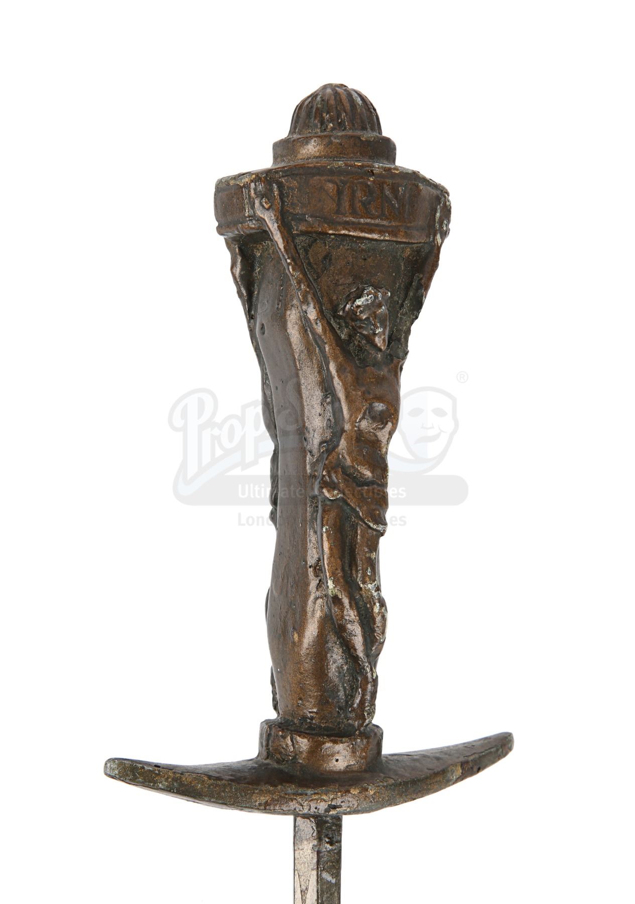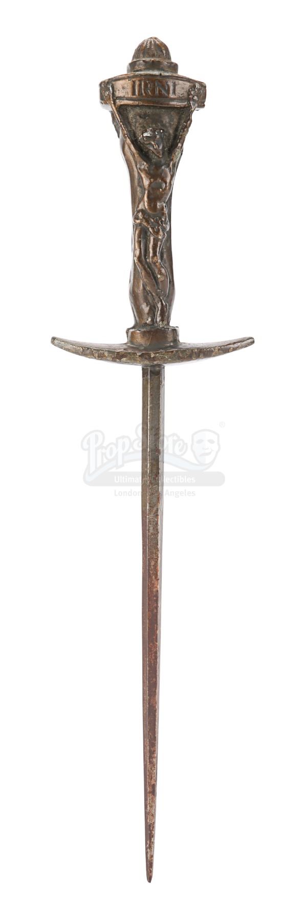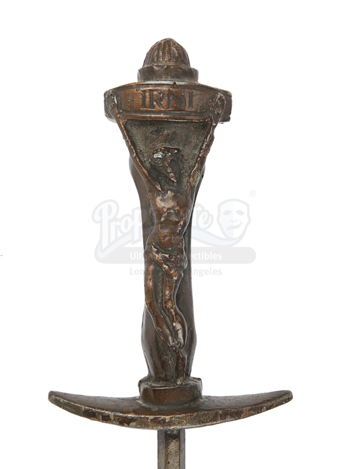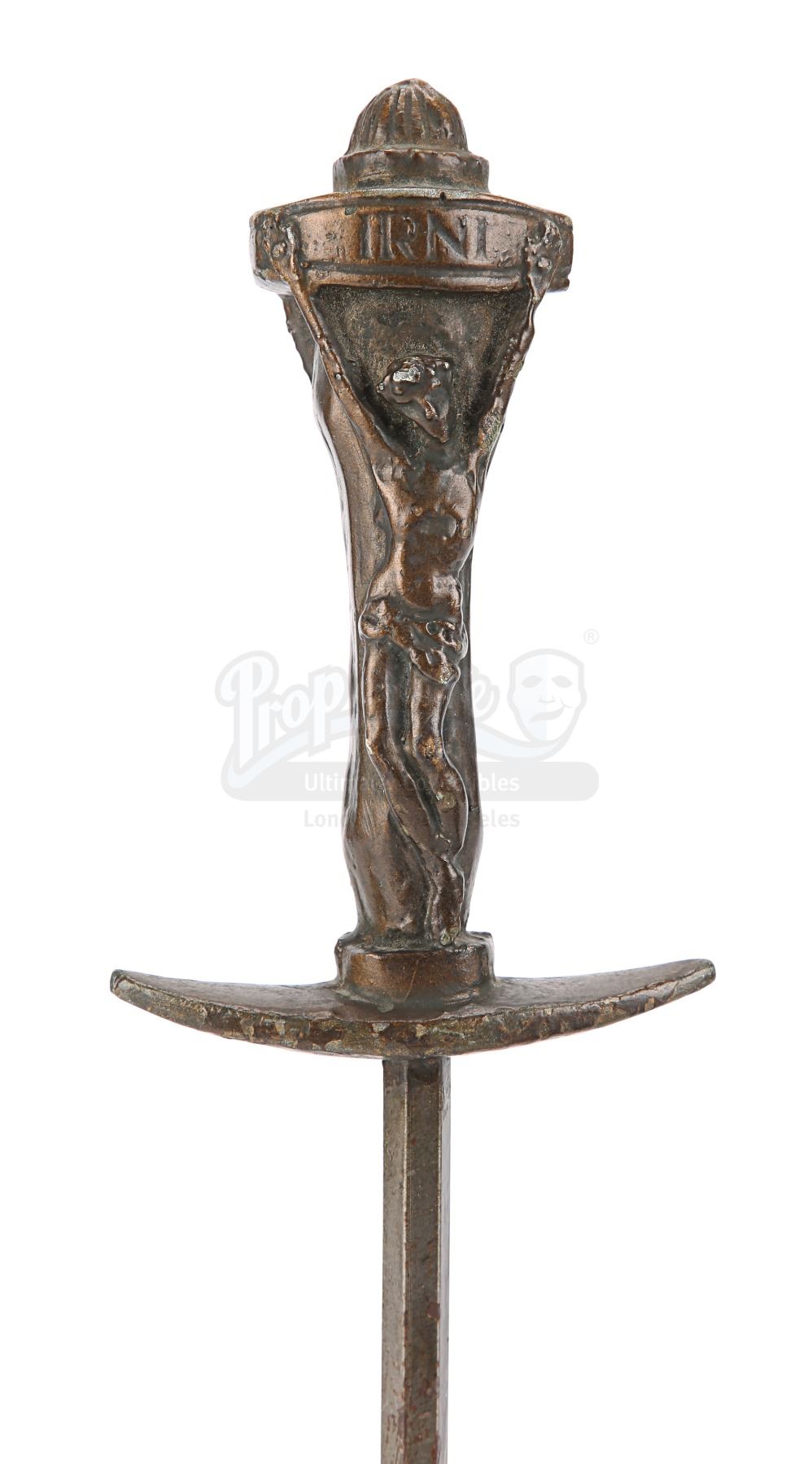 This hero dagger comprises a thin metal hexagonal blade, a curved crossguard and a decorative pommel. A cast emblem of Christ and the letters "IRNI" adorn both sides of the grip, and the majority of the piece is finished in faux-bronze paint. The Latin initials on the dagger are meant to stand for "Jesus of Nazareth, King of the Jews", often initialled "INRI". However, the production made a mistake with the order of the letters, an error subsequently corrected for the film's sequels. There are signs of use and age present on the dagger, including corrosion on the blade, glue remnants on the base of the blade, and wear to the paint finish.