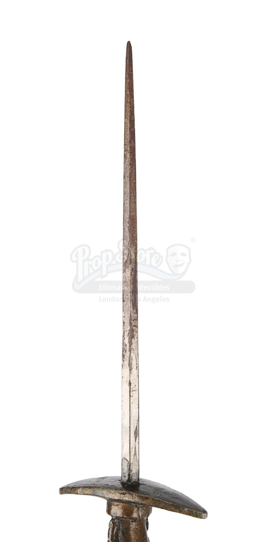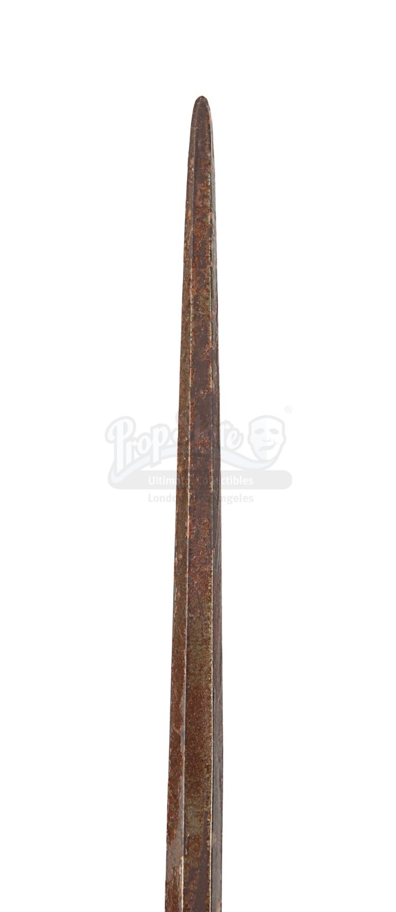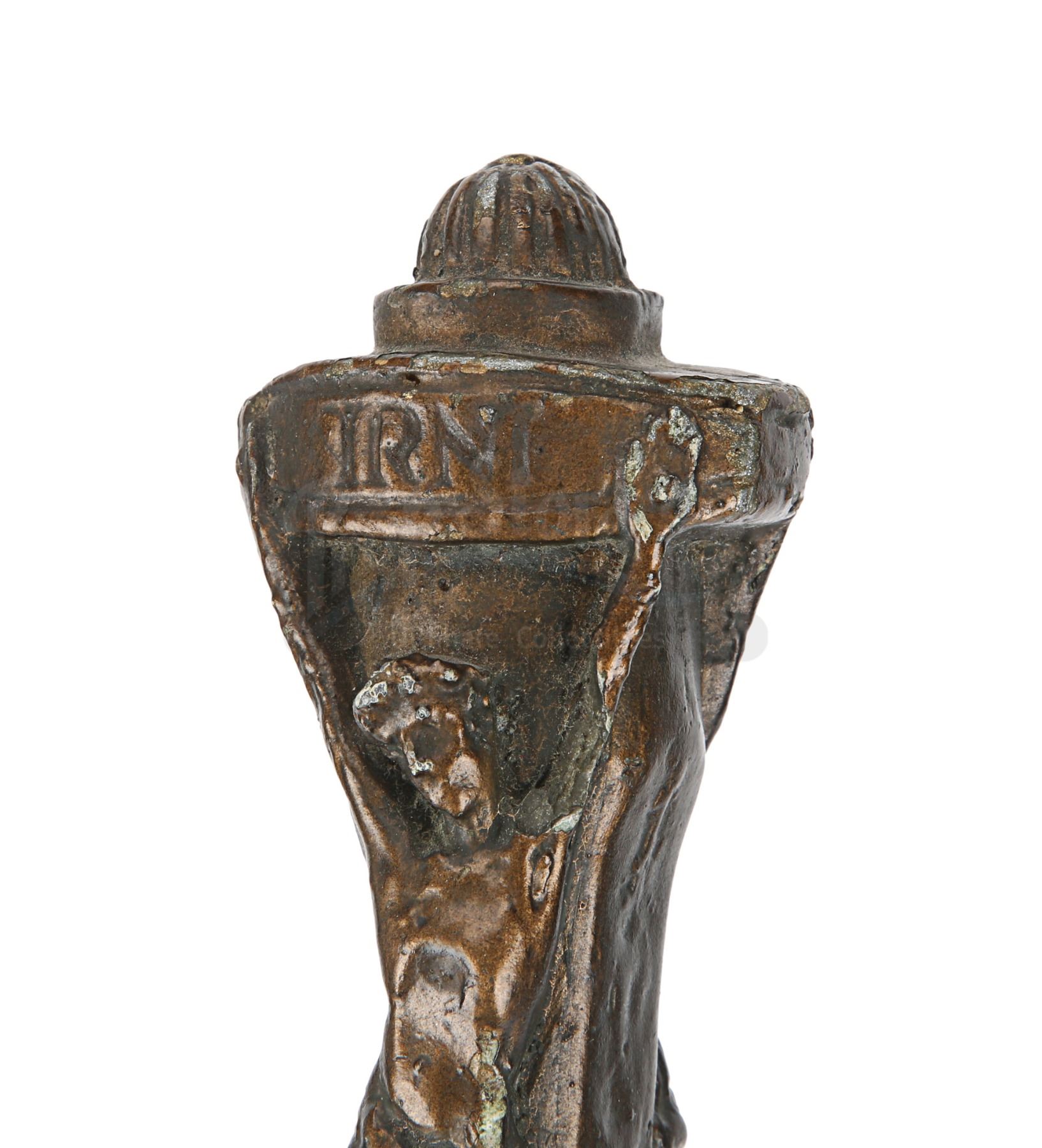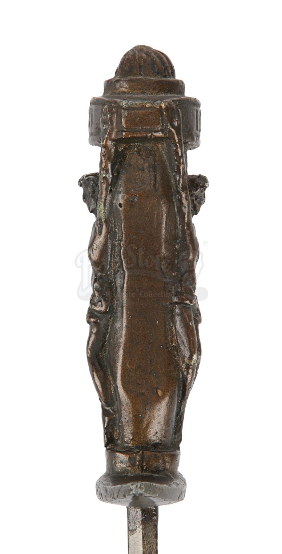 This hero dagger comprises a thin metal hexagonal blade, a curved crossguard and a decorative pommel. A cast emblem of Christ and the letters "IRNI" adorn both sides of the grip, and the majority of the piece is finished in faux-bronze paint. The Latin initials on the dagger are meant to stand for "Jesus of Nazareth, King of the Jews", often initialled "INRI". However, the production made a mistake with the order of the letters, an error subsequently corrected for the film's sequels. There are signs of use and age present on the dagger, including corrosion on the blade, glue remnants on the base of the blade, and wear to the paint finish.